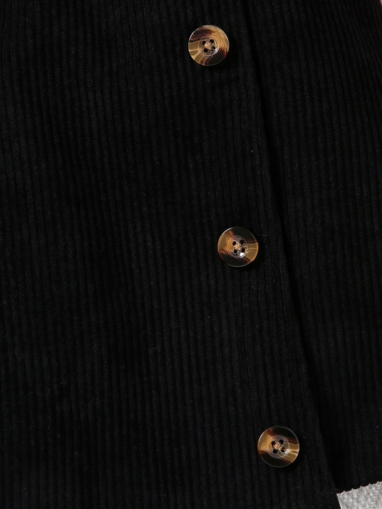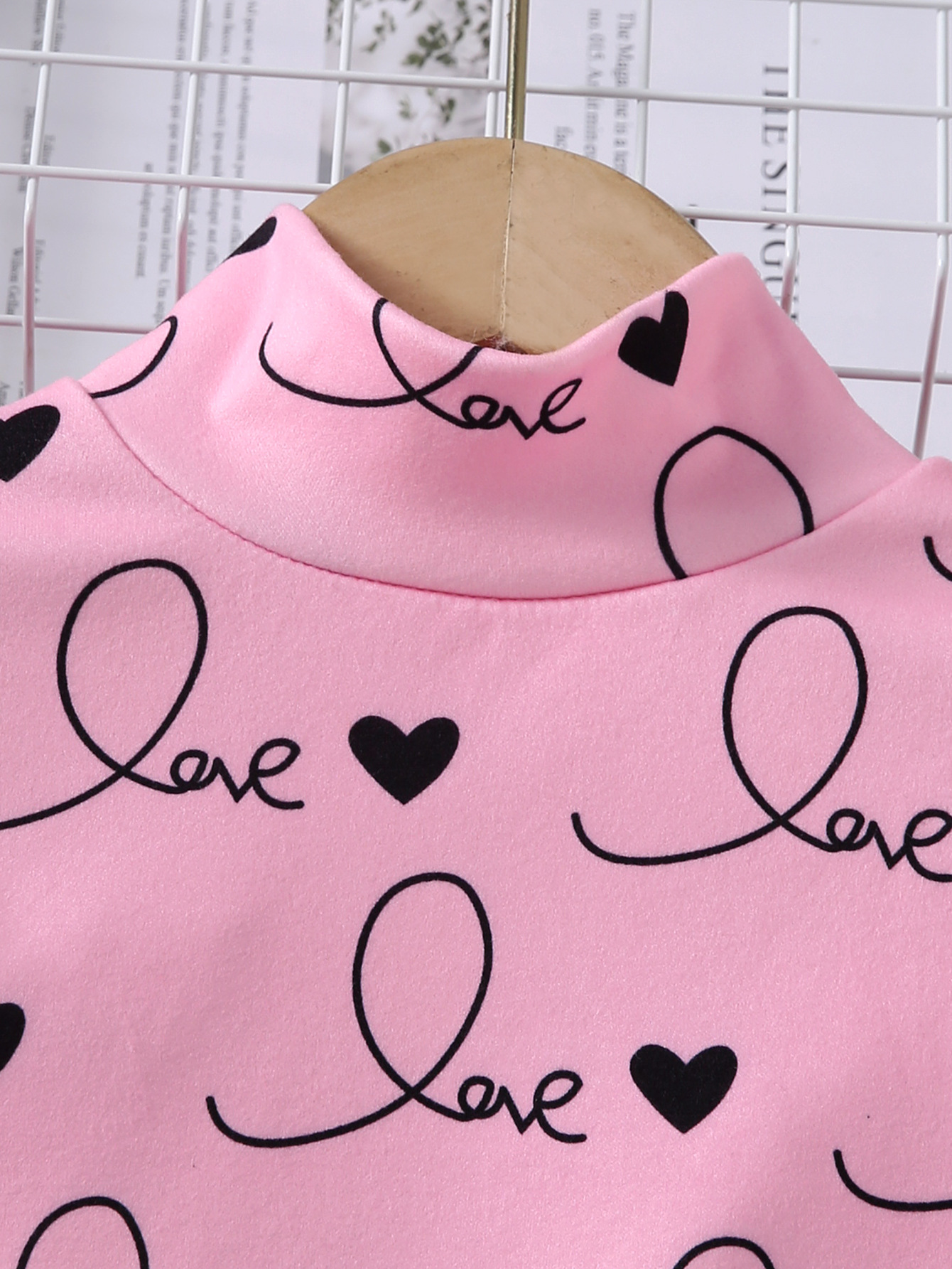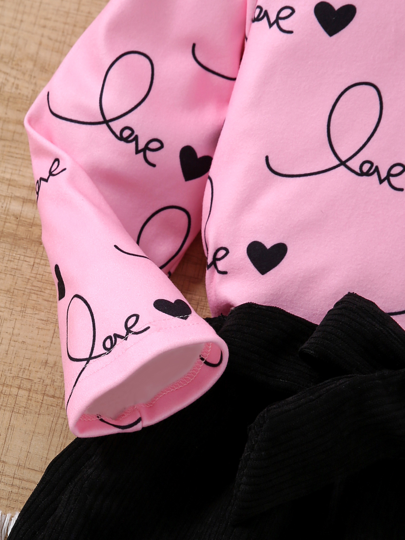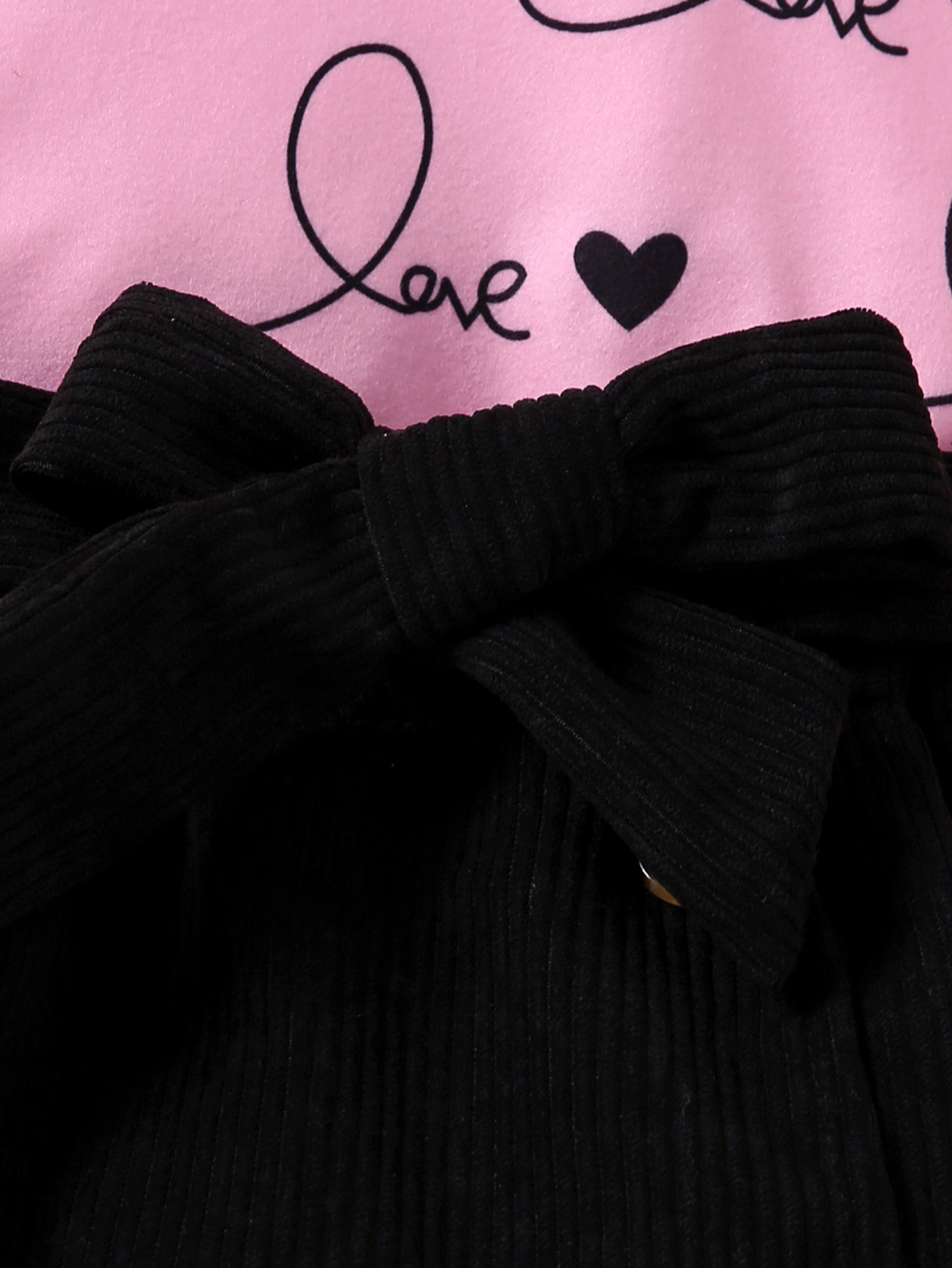 가을 겨울 여아 터틀넥 풀 프린트 하트 러플 긴팔 + 코듀로이 가짜 버튼 보우 스커트 2피스