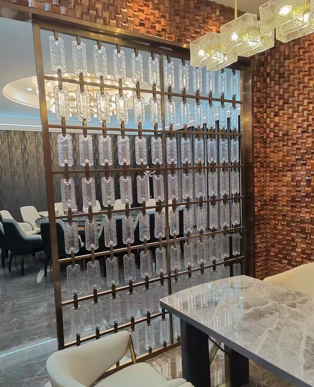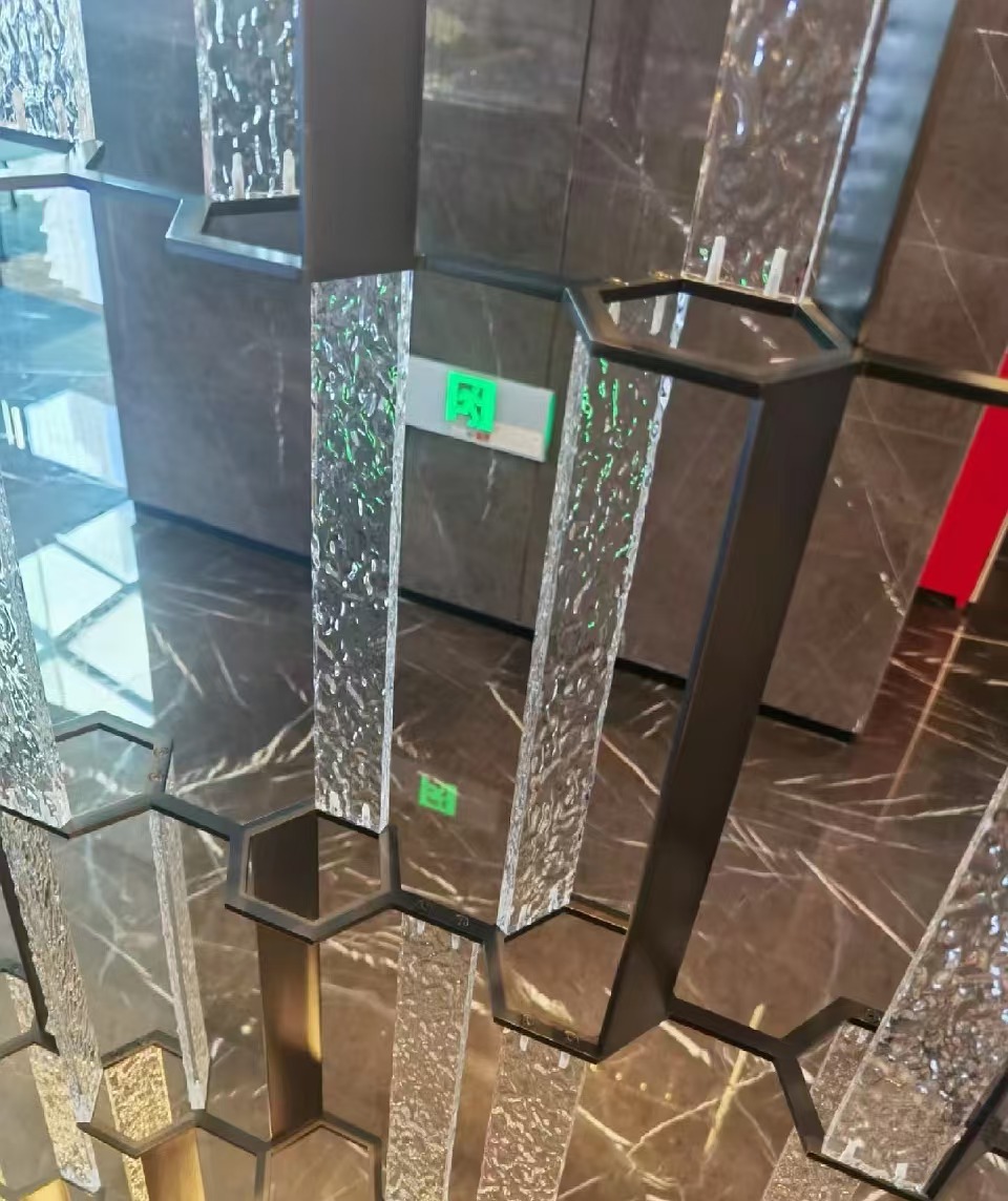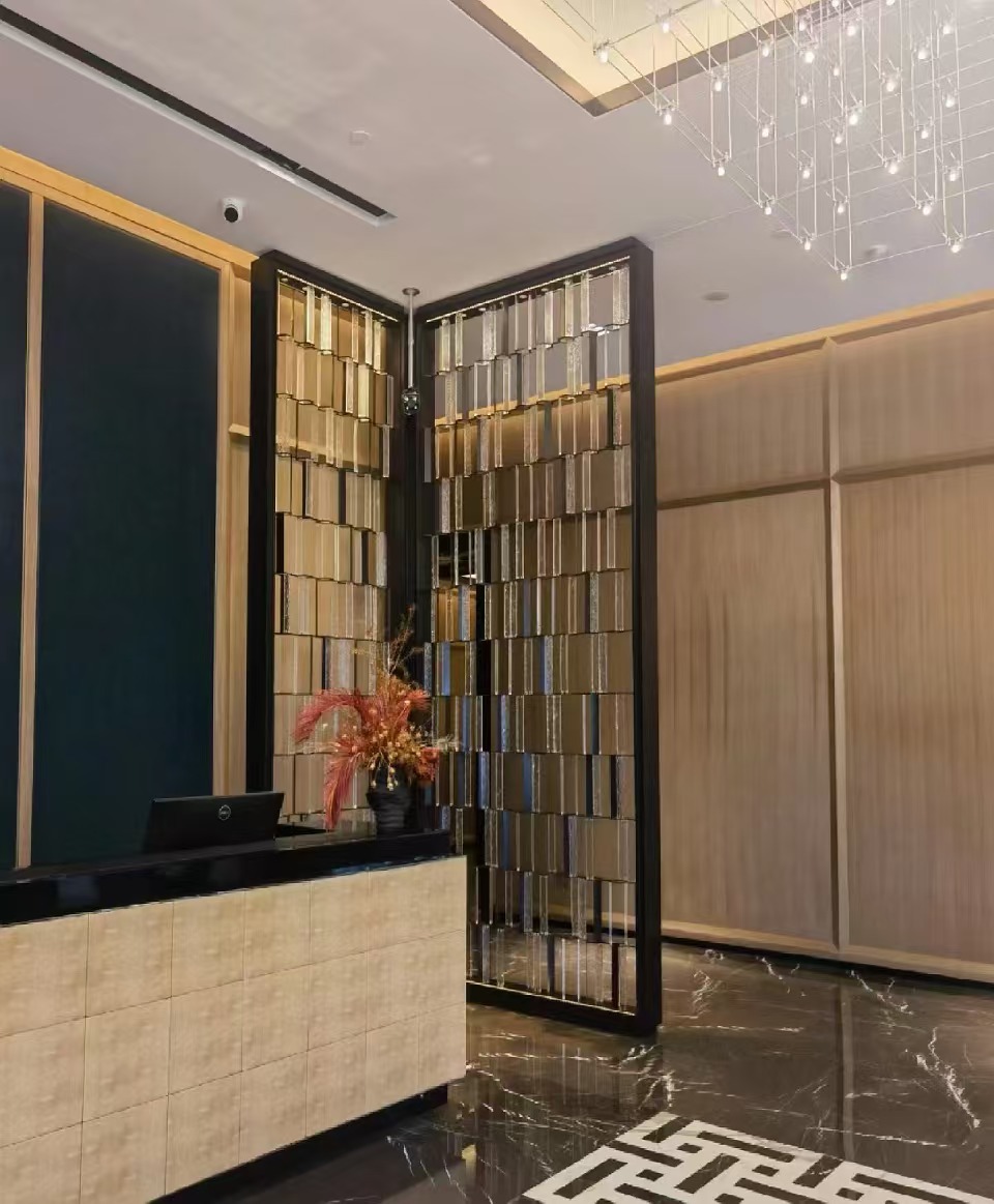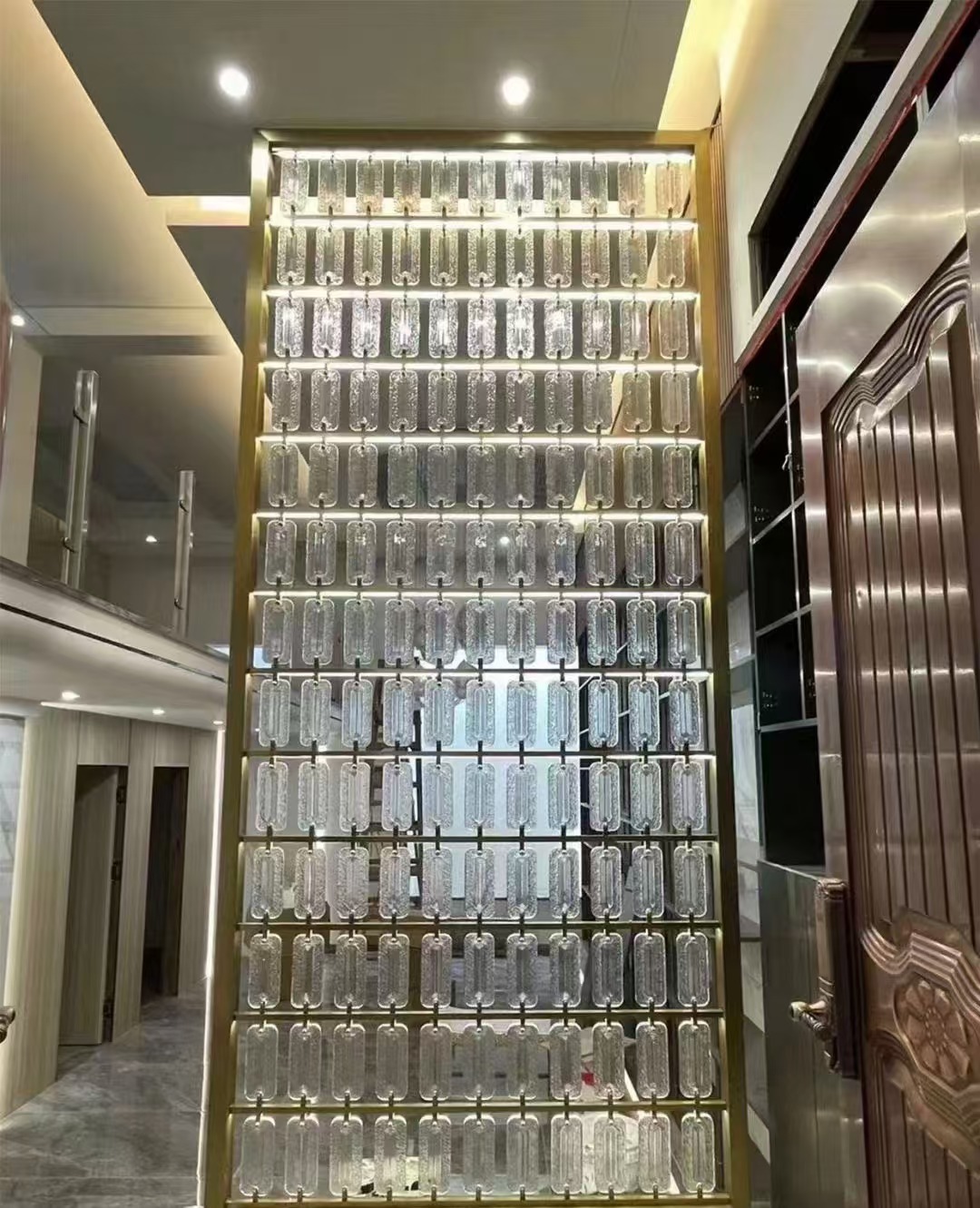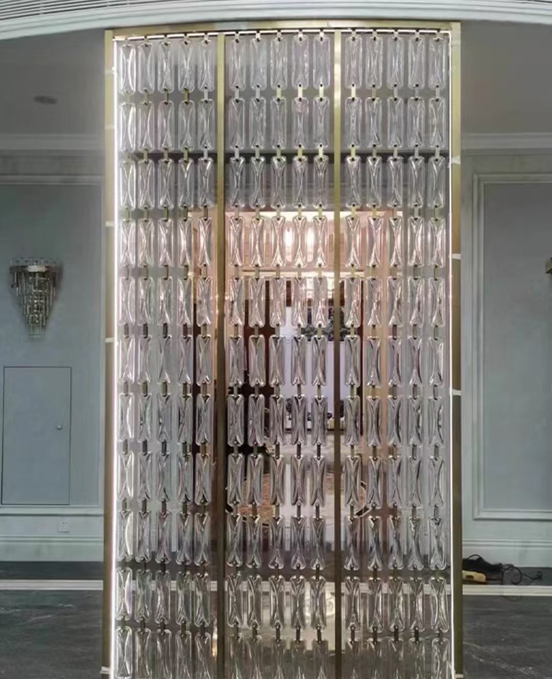 호텔 클럽 스테인레스 스틸 유리 교수형 크리스탈 스크린 입구 현관 거실 파티션 레스토랑 프로젝트 장식스토어 가기