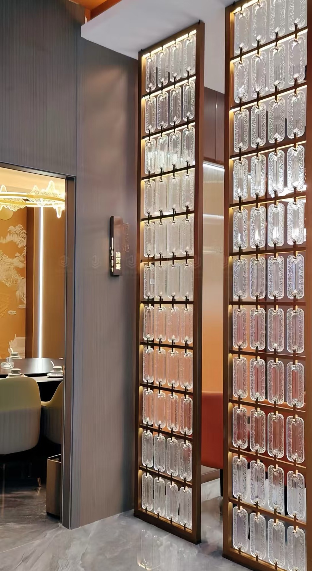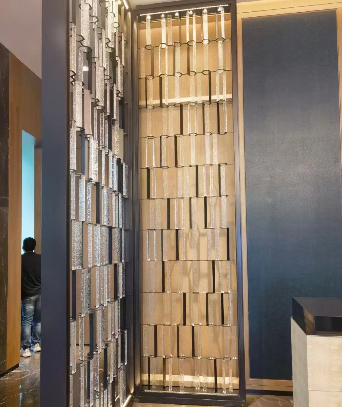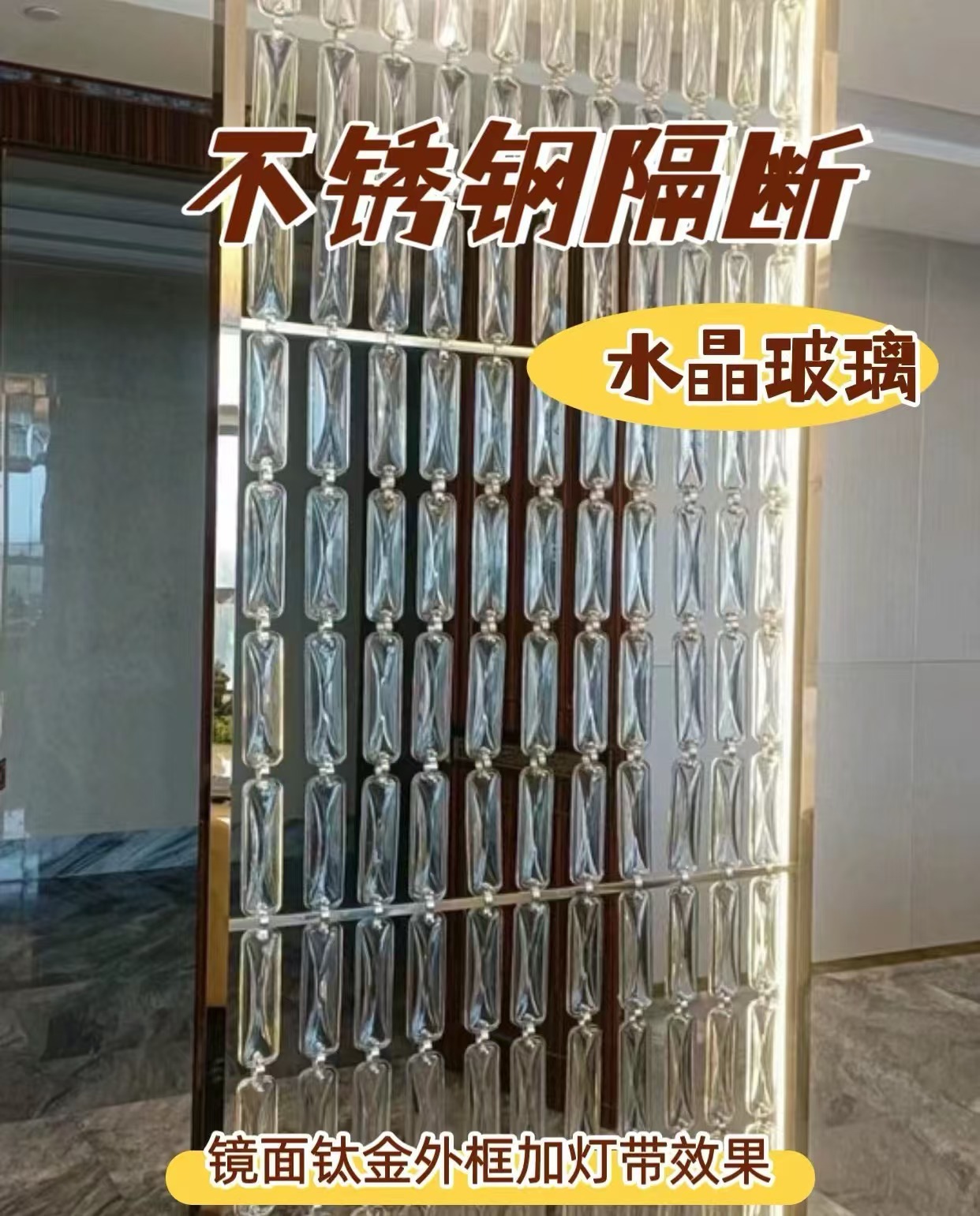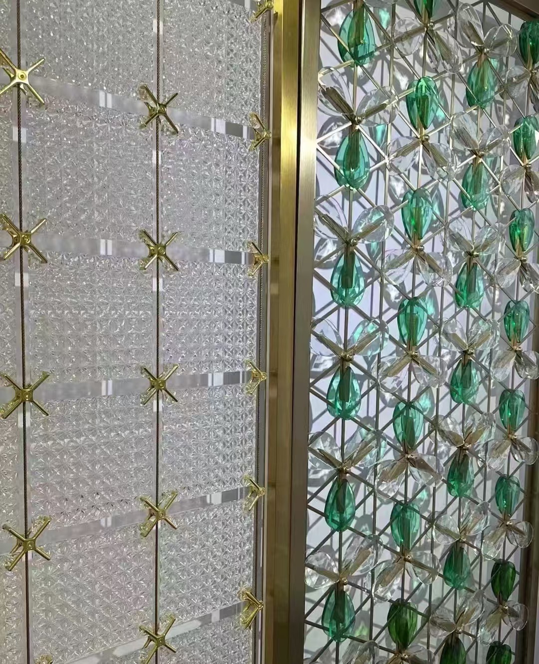 호텔 클럽 스테인레스 스틸 유리 교수형 크리스탈 스크린 입구 현관 거실 파티션 레스토랑 프로젝트 장식스토어 가기