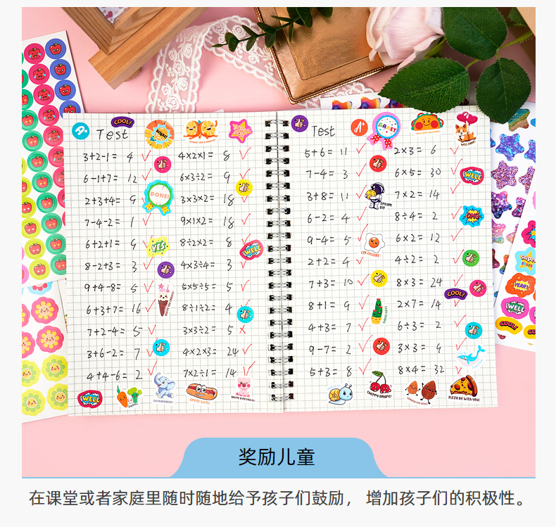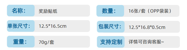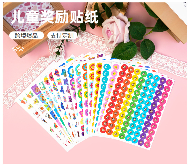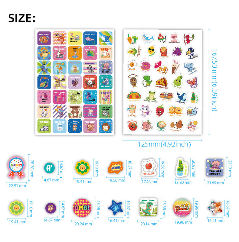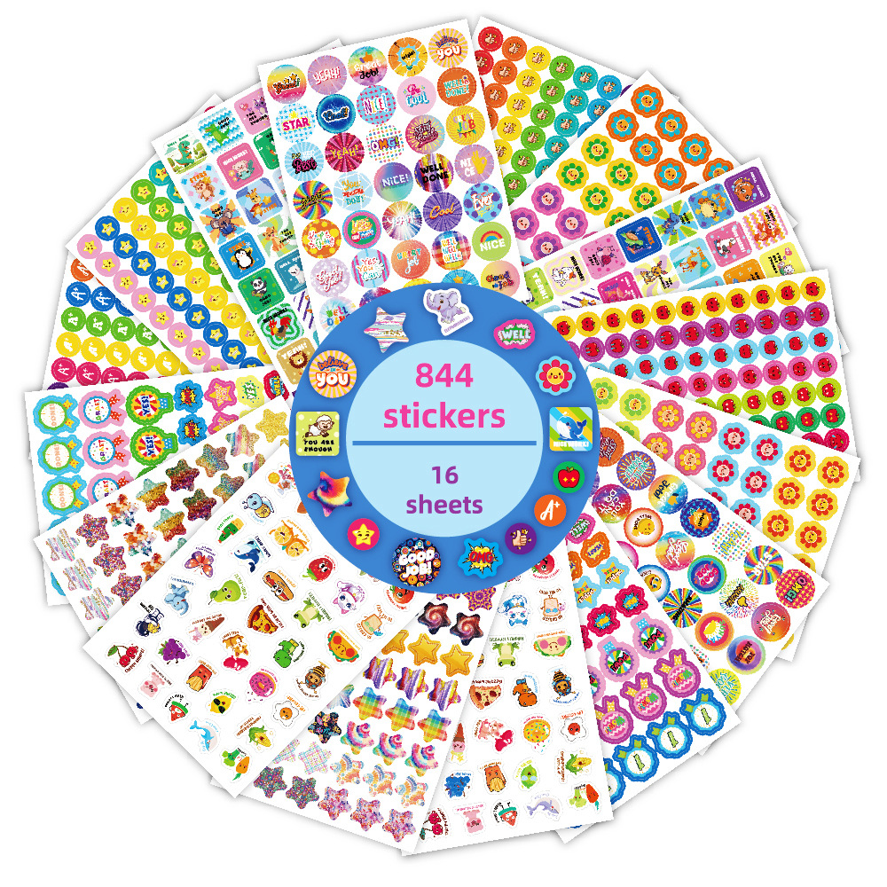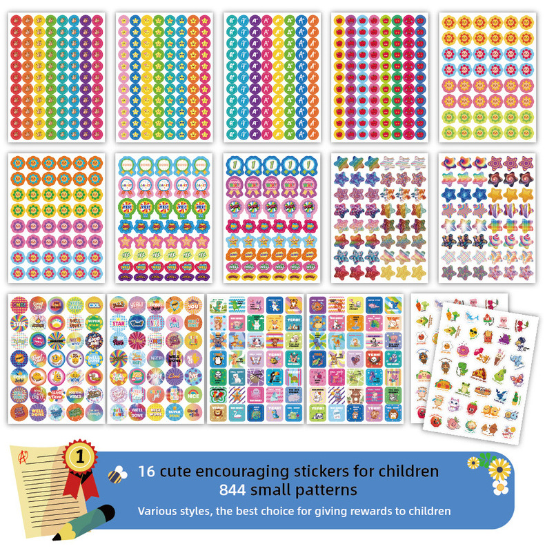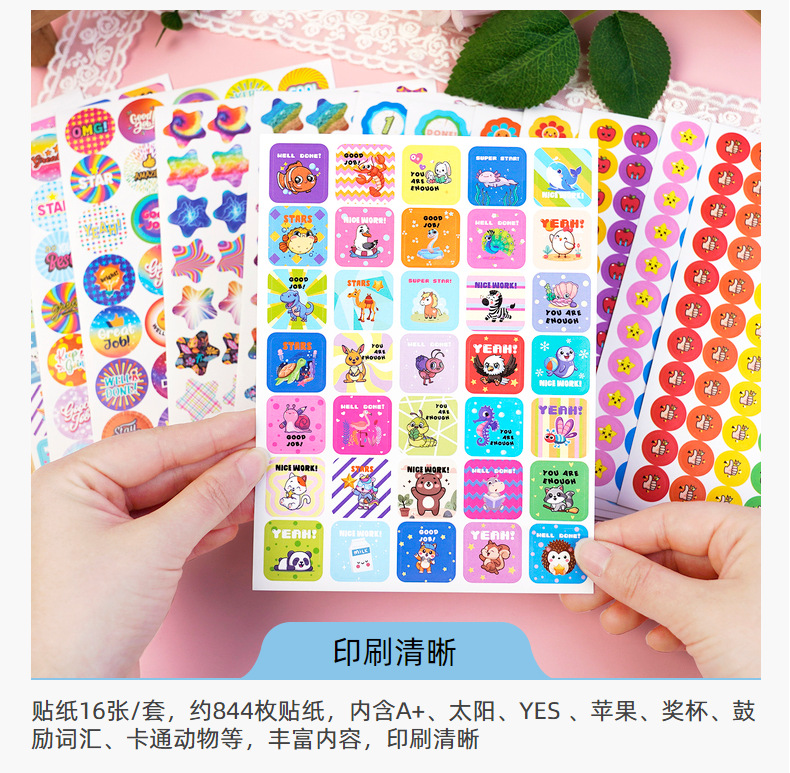 一套里面共16张, 844枚超多贴纸,包含A+、 太阳、星星 、YES 、苹果、 奖杯、 鼓励词汇、 卡通动物 、俚语奖励贴纸等丰富内容,完全足够您再课堂或者家庭里随时随地给与孩子们鼓励, 增加孩子们的积极性。