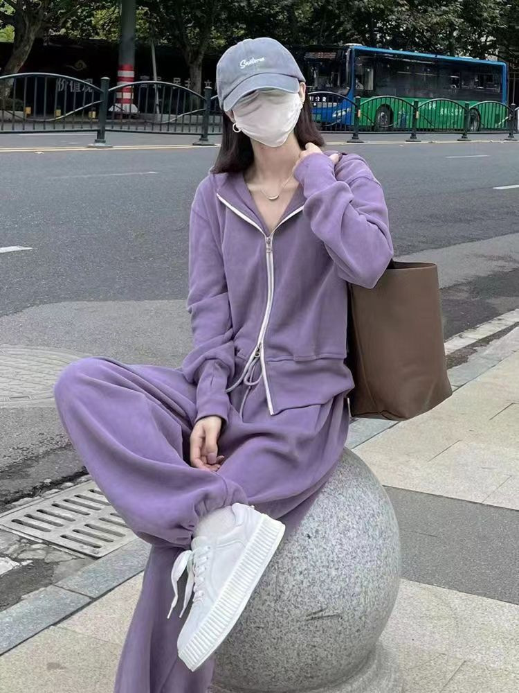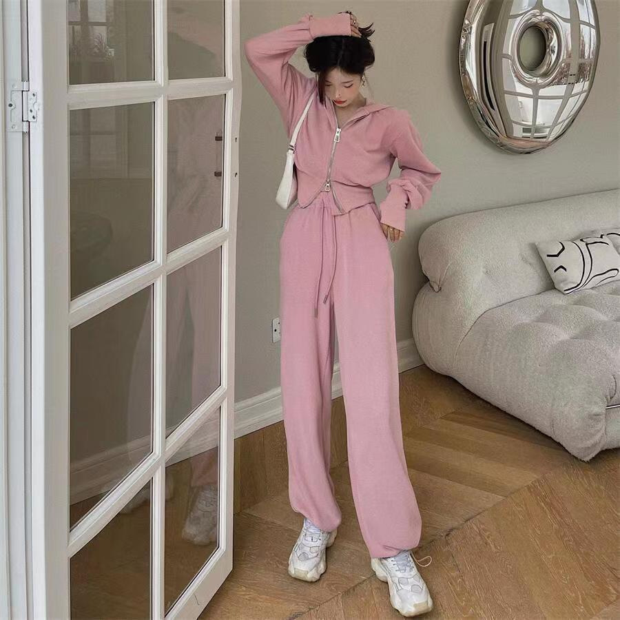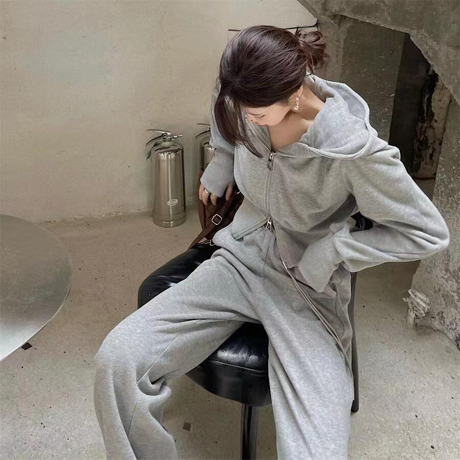 스포츠 세트 여자 2025 가을 새로운 한국식 느슨한 인터넷 연예인 캐주얼 땀 지퍼 넓은 다리 바지 투피스 세트