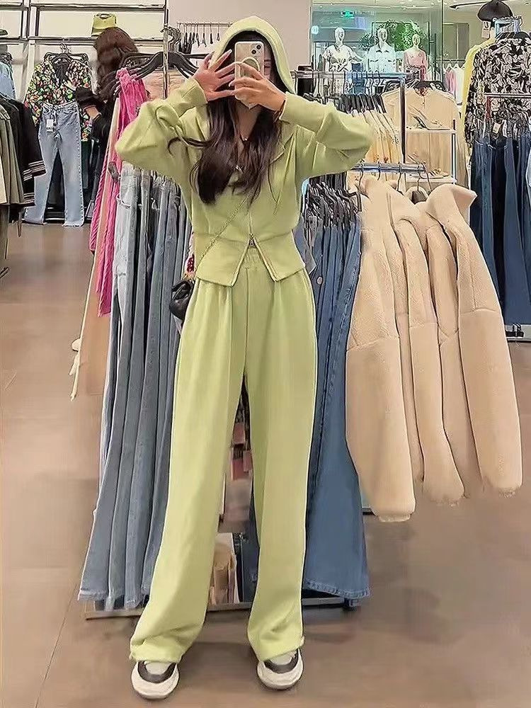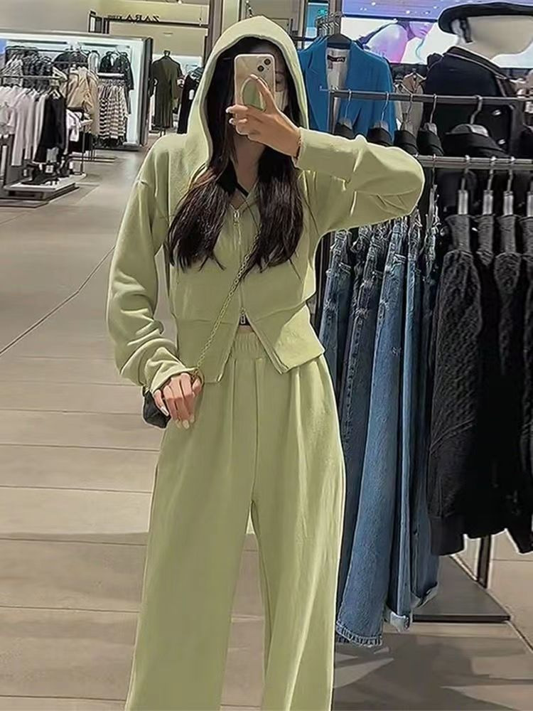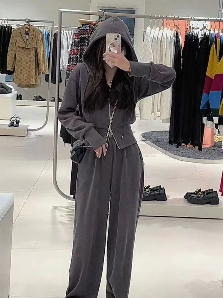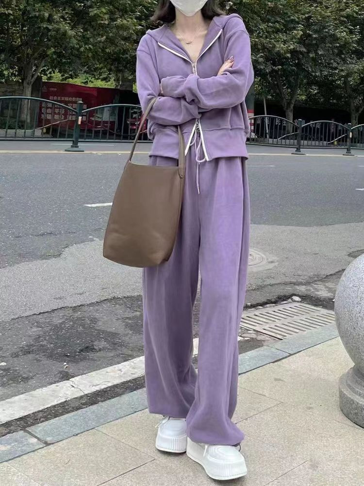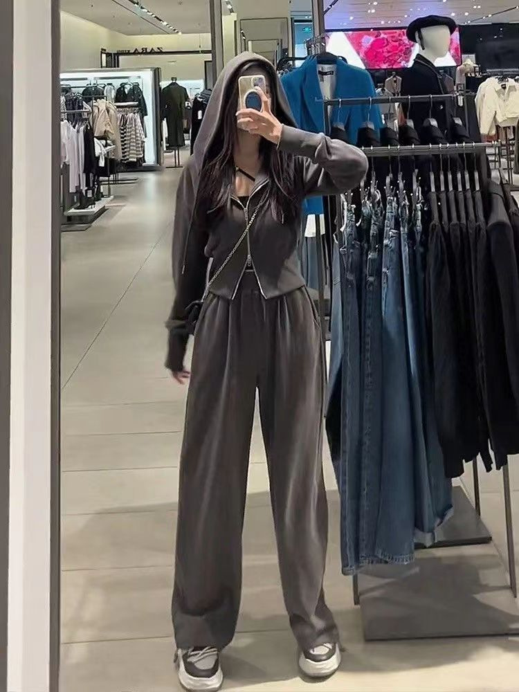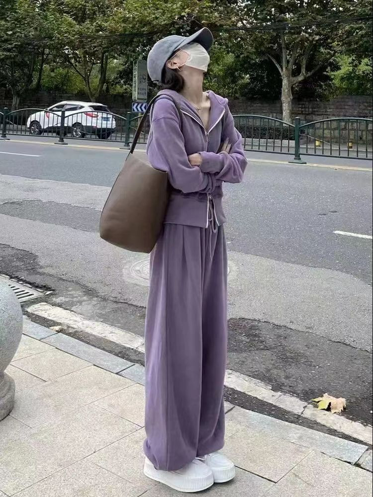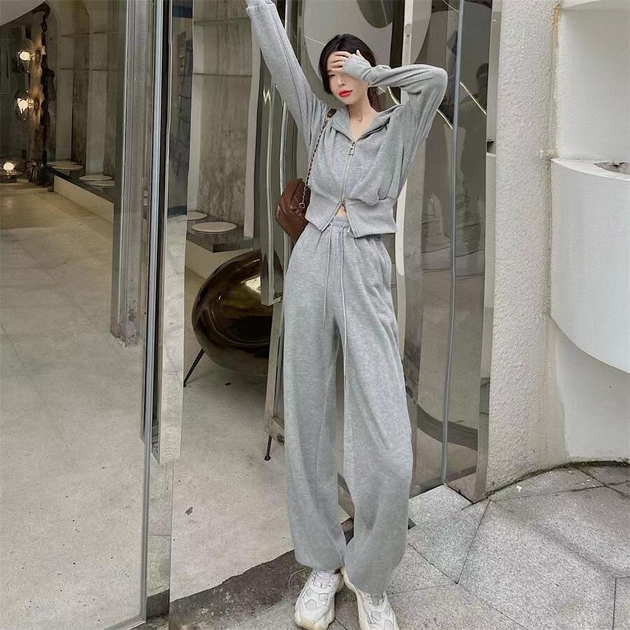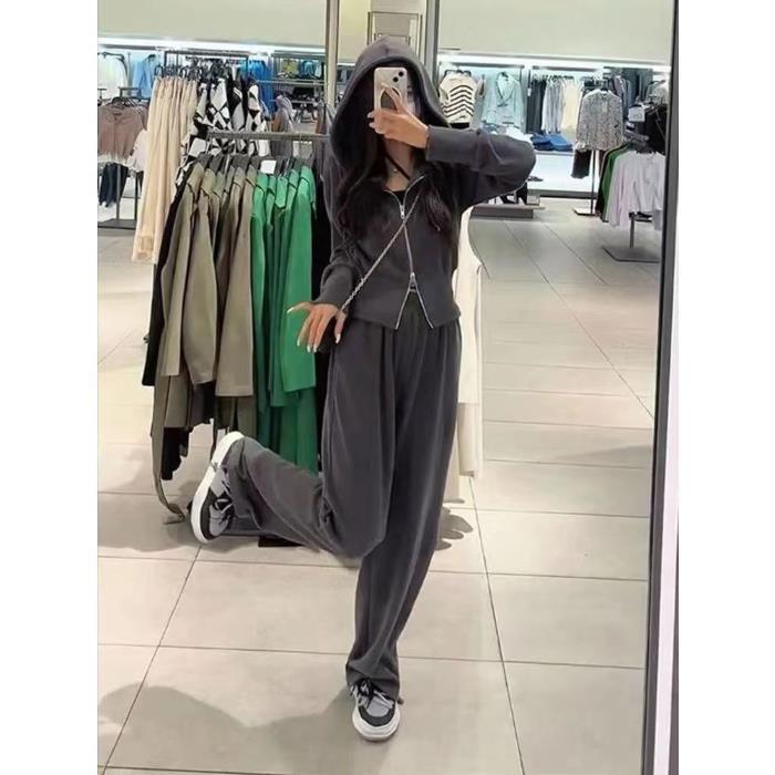 스포츠 세트 여자 2025 가을 새로운 한국식 느슨한 인터넷 연예인 캐주얼 땀 지퍼 넓은 다리 바지 투피스 세트스토어 가기