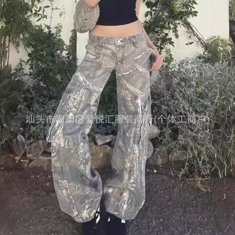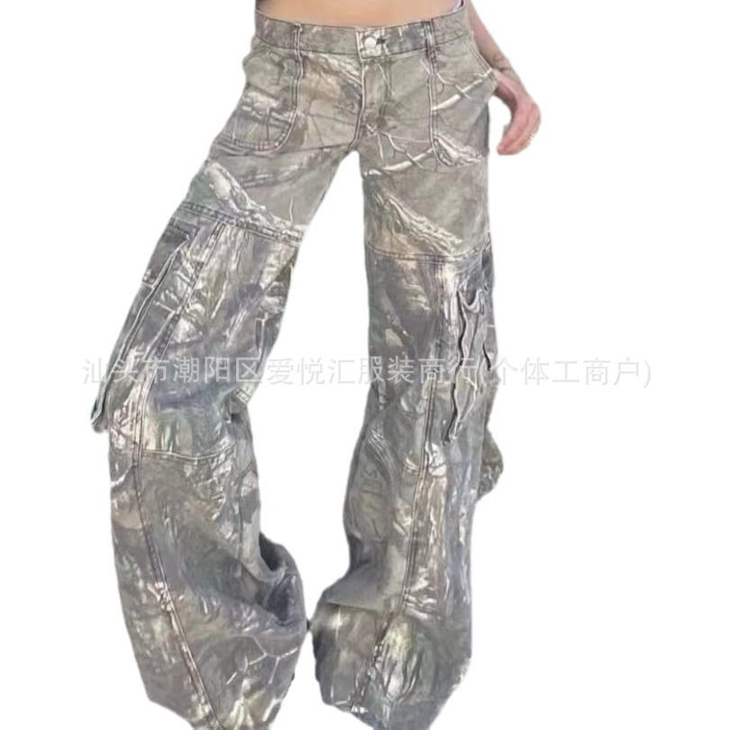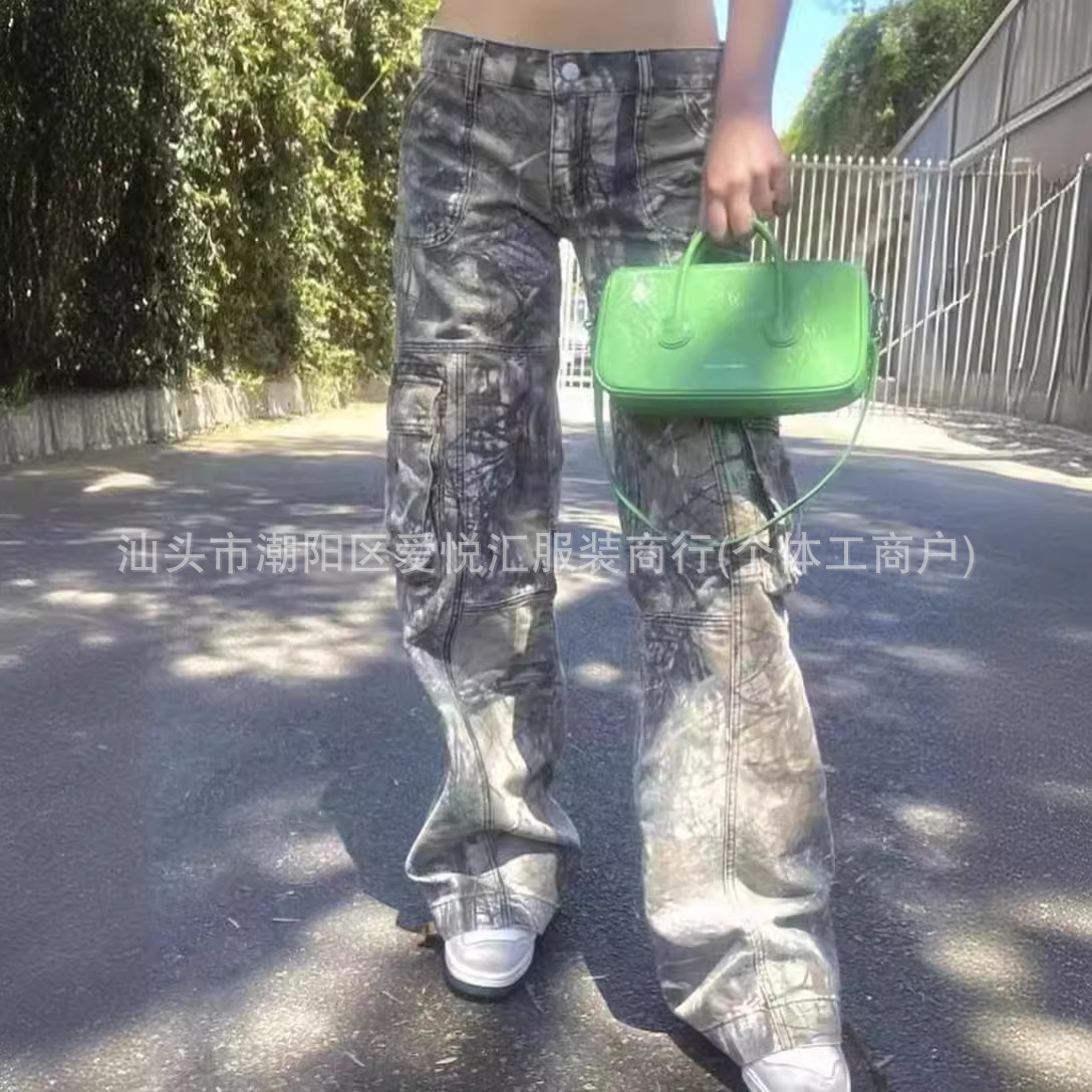 새로운 가을 바지 향신료 소녀 위장 바지 스트레이트 튜브 느슨한 낮은 허리 포켓 청바지 여성 매일 캐주얼 바지