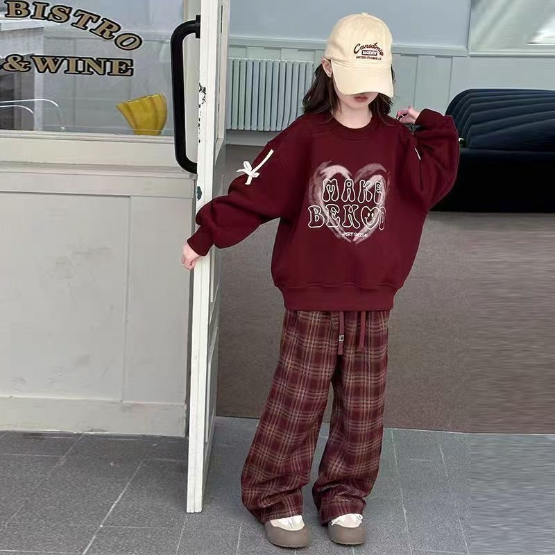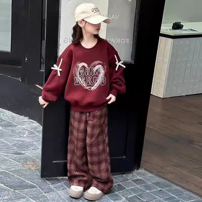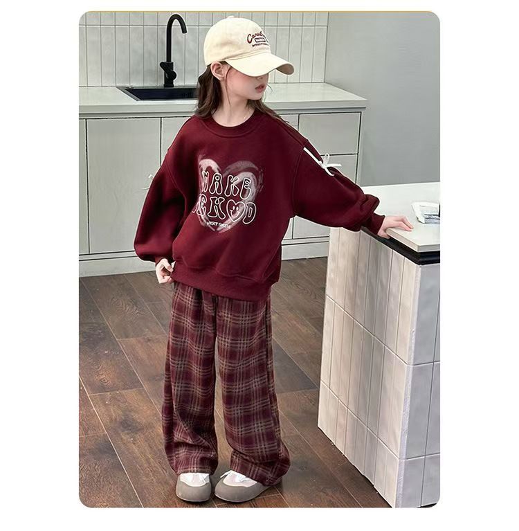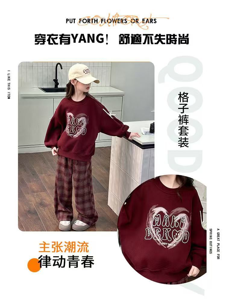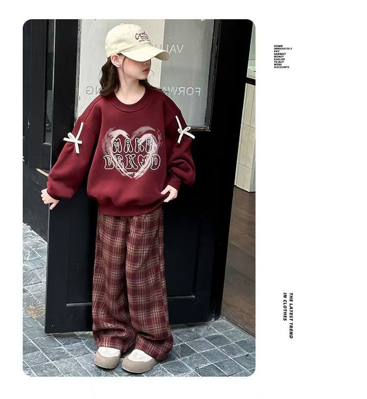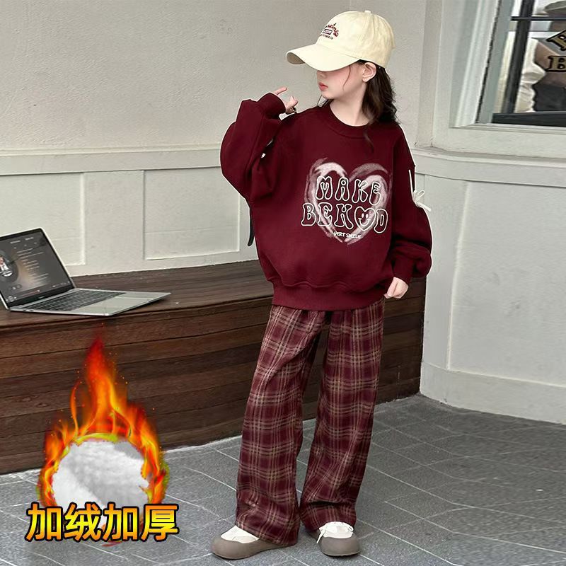 어린이 여성 기모 세트 새로운 서양식 가을과 겨울 기모 두꺼운 땀 중간과 큰 어린이 사랑 후드 격자 무늬