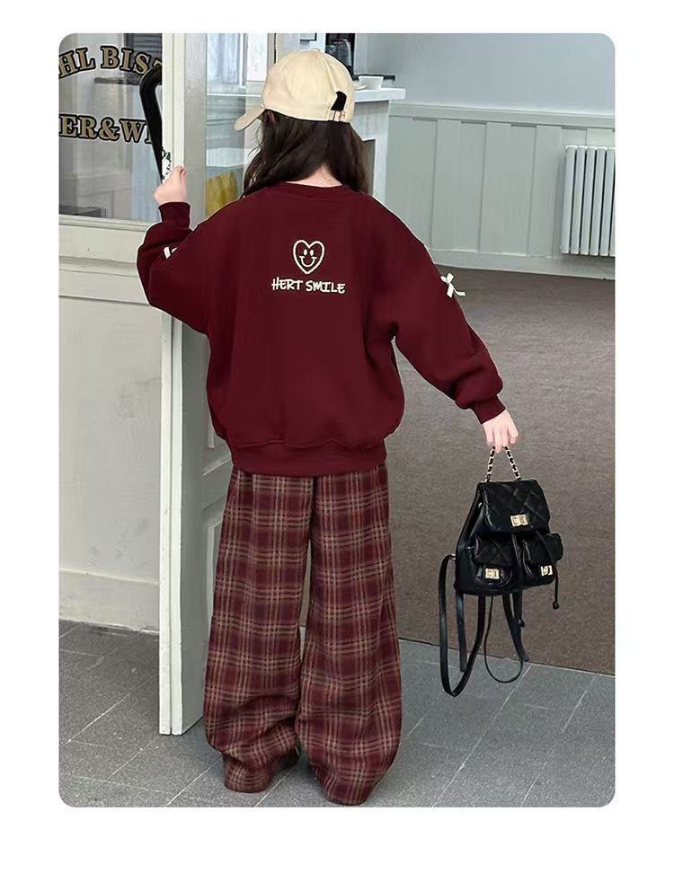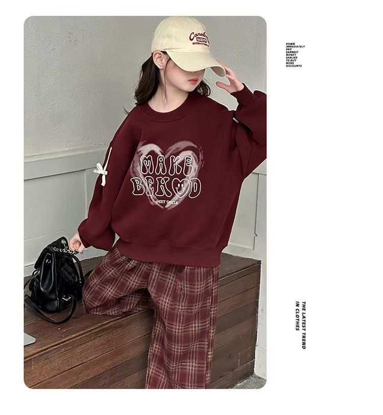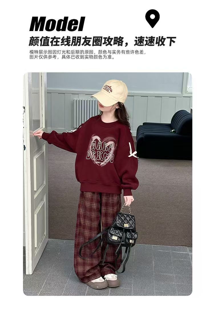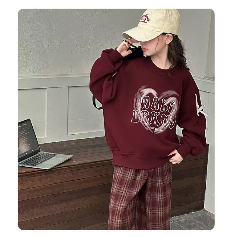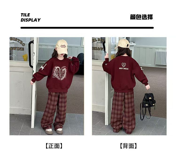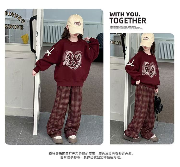어린이 여성 기모 세트 새로운 서양식 가을과 겨울 기모 두꺼운 땀 중간과 큰 어린이 사랑 후드 격자 무늬