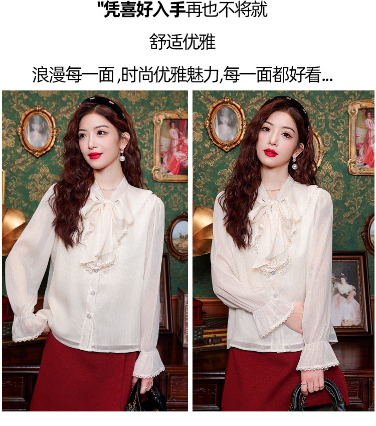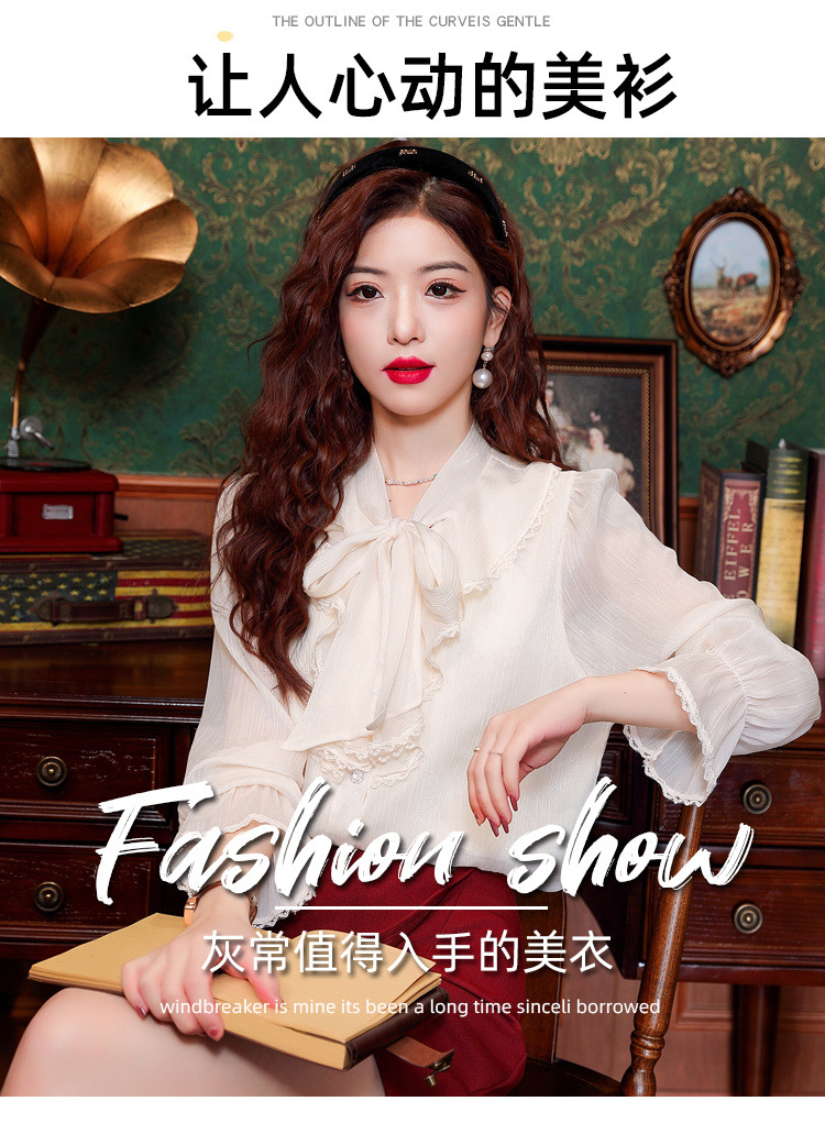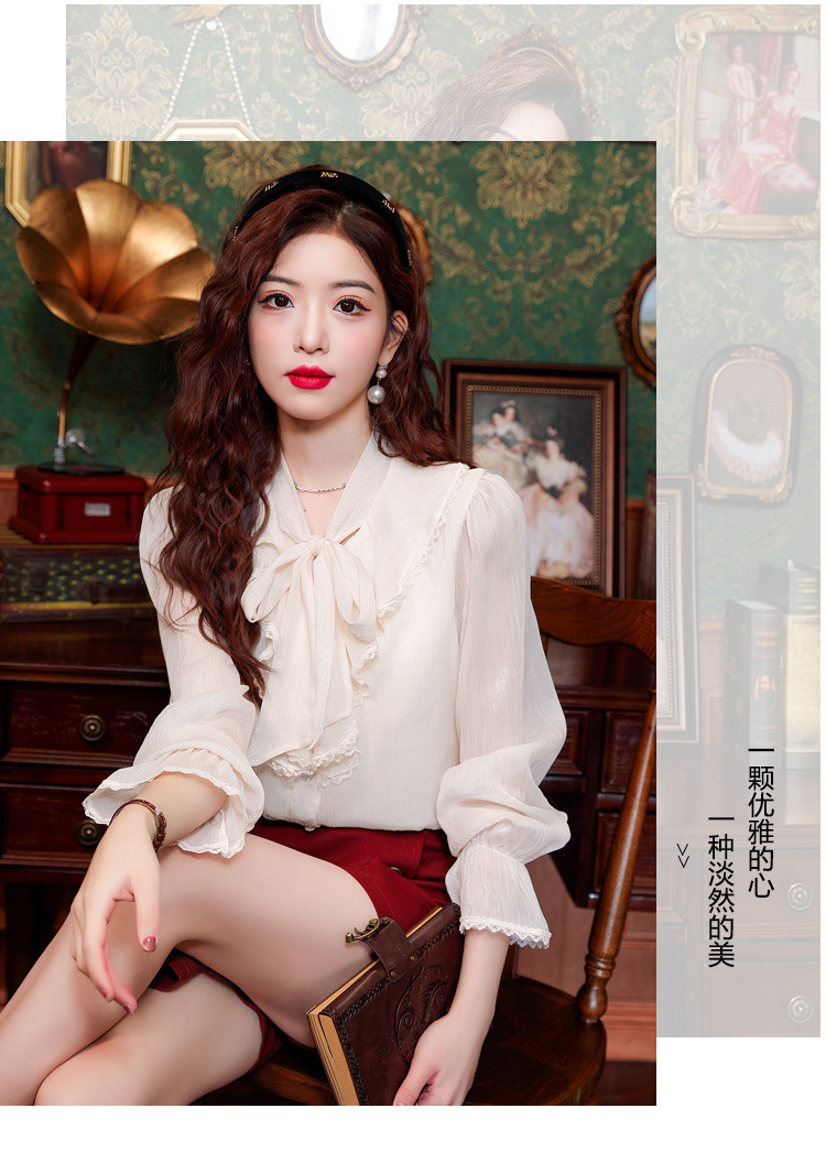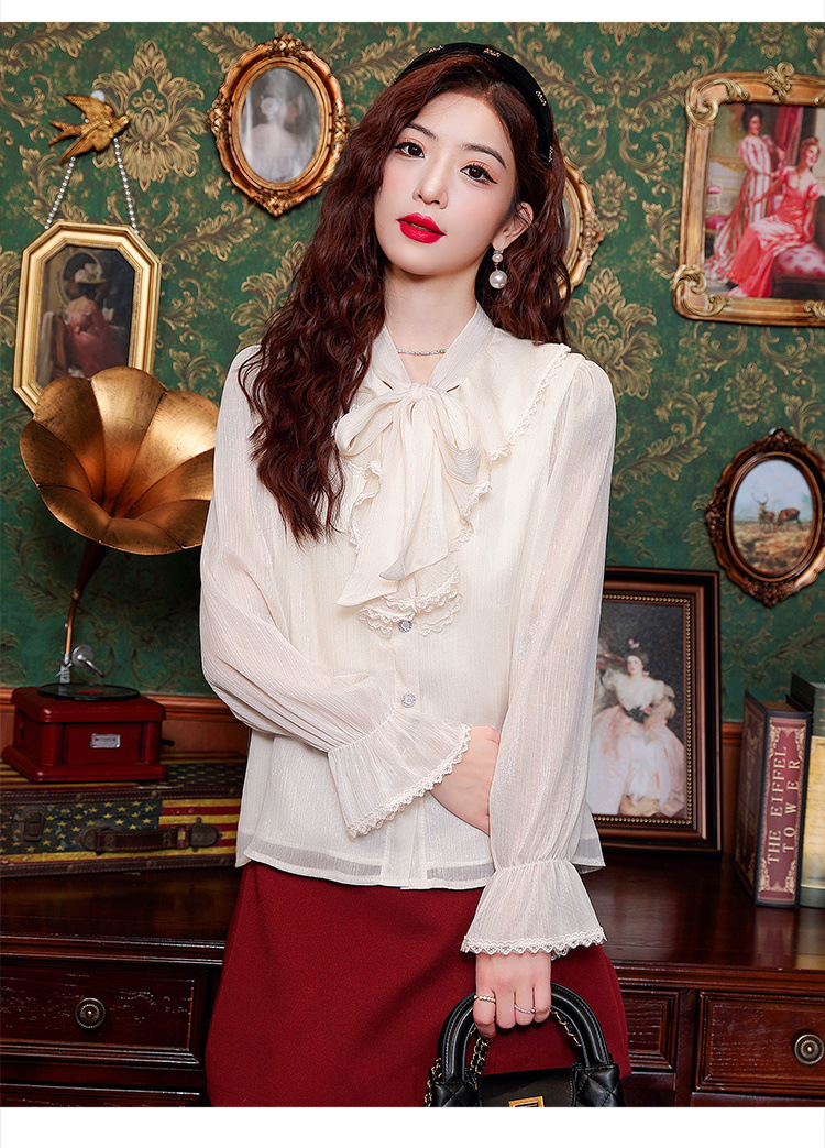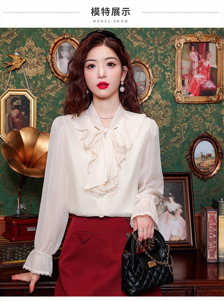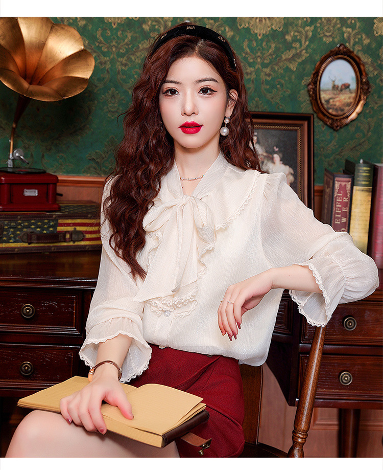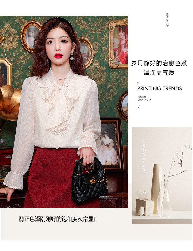Y9Z 시리즈 레트로 리본 장식 긴팔 쉬폰 셔츠 여성용 봄 신상품 다용도 슬림핏 패셔너블한 벨 슬리브스토어 가기