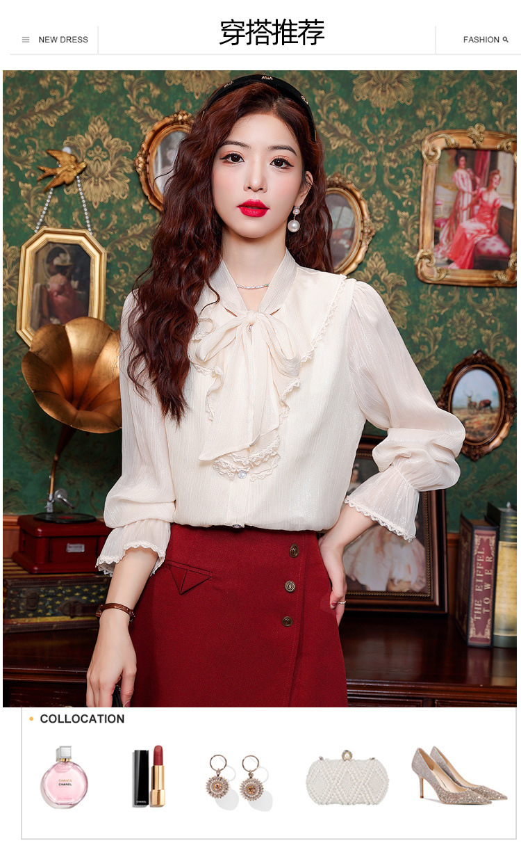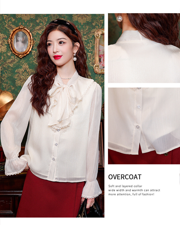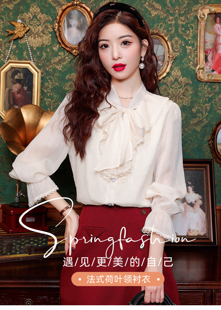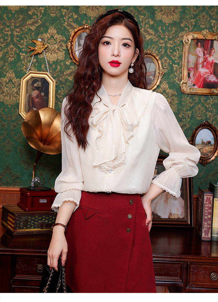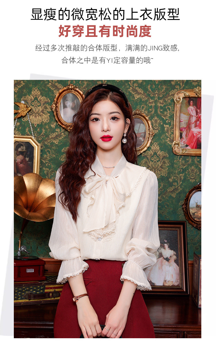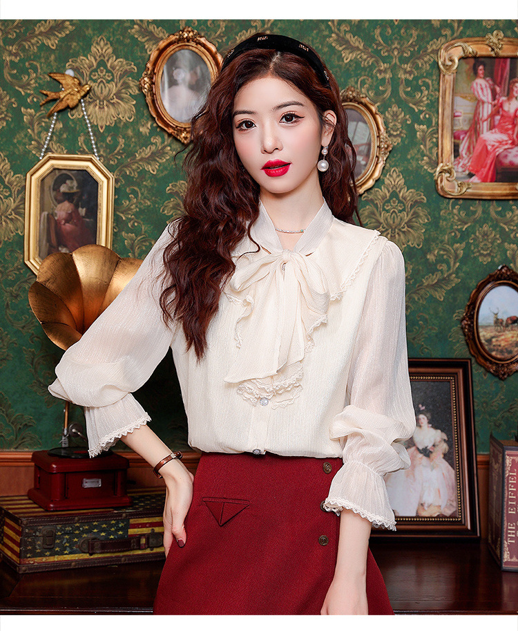 Y9Z 시리즈 레트로 리본 장식 긴팔 쉬폰 셔츠 여성용 봄 신상품 다용도 슬림핏 패셔너블한 벨 슬리브스토어 가기