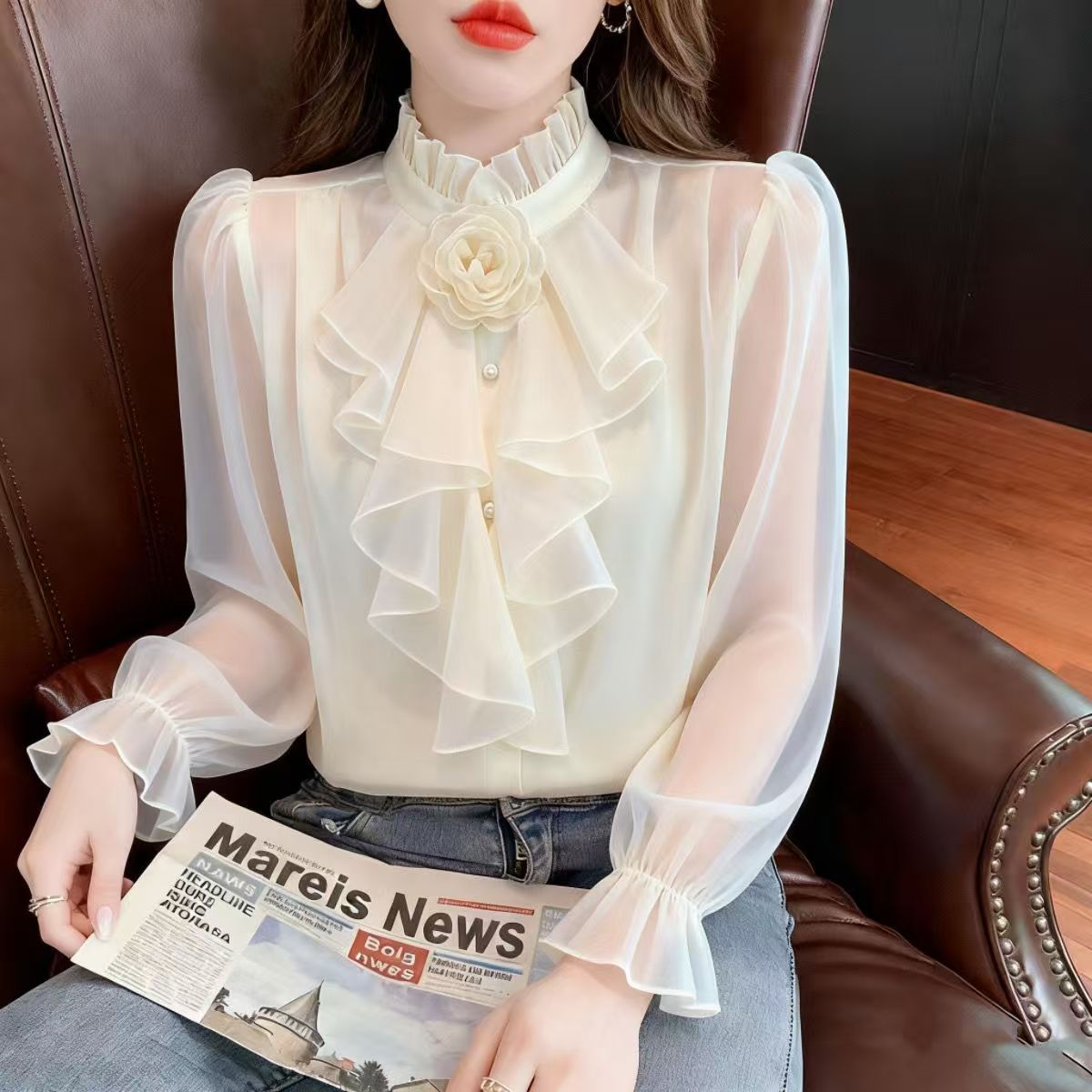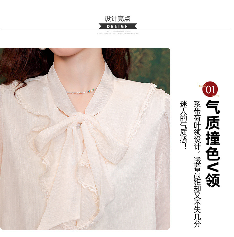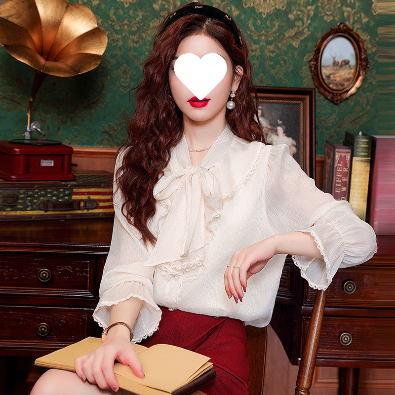 Y9Z 시리즈 레트로 리본 장식 긴팔 쉬폰 셔츠 여성용 봄 신상품 다용도 슬림핏 패셔너블한 벨 슬리브