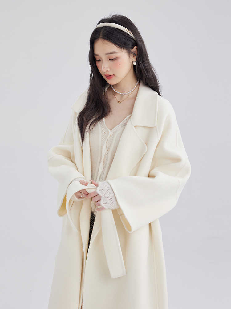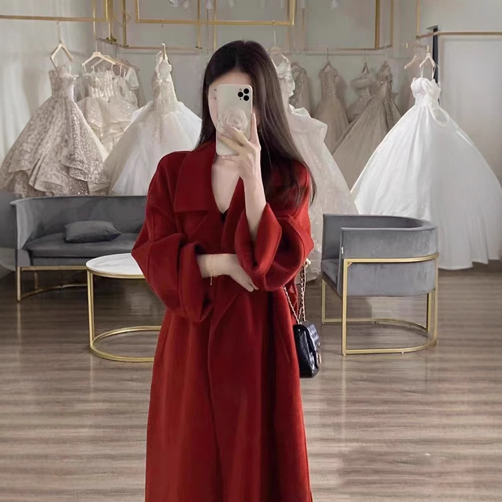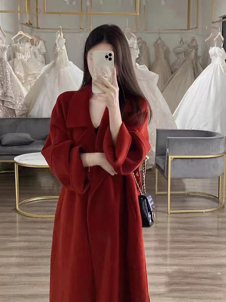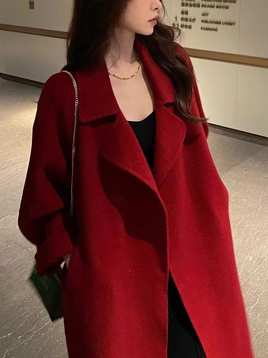 시칠리아 양면 울 코트 레드 벨트 슈트 칼라 롱 울 코트 여성용 레이지 스타일스토어 가기