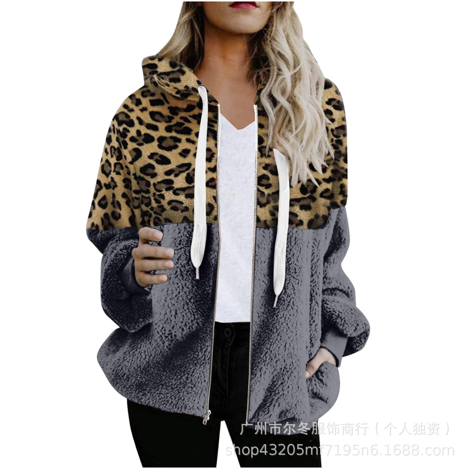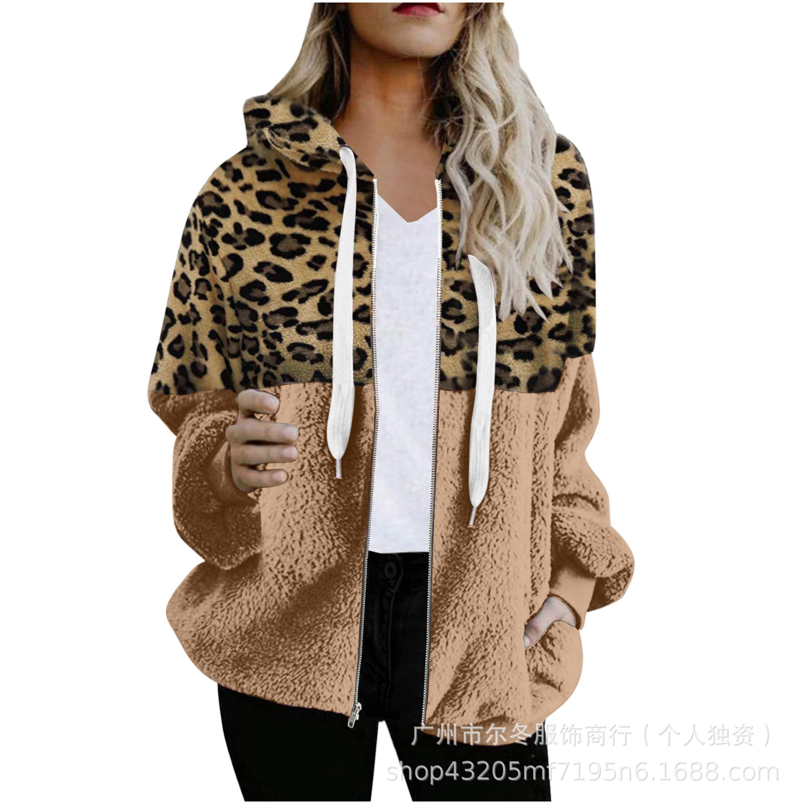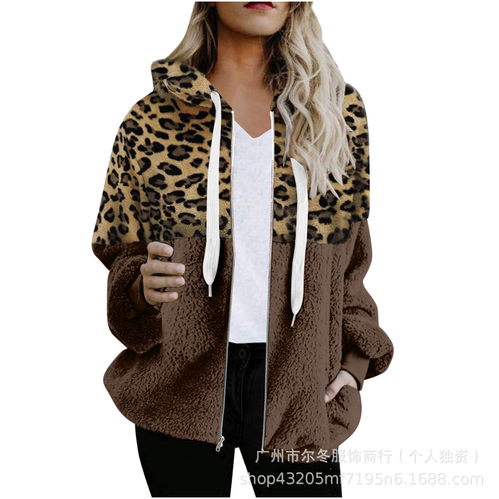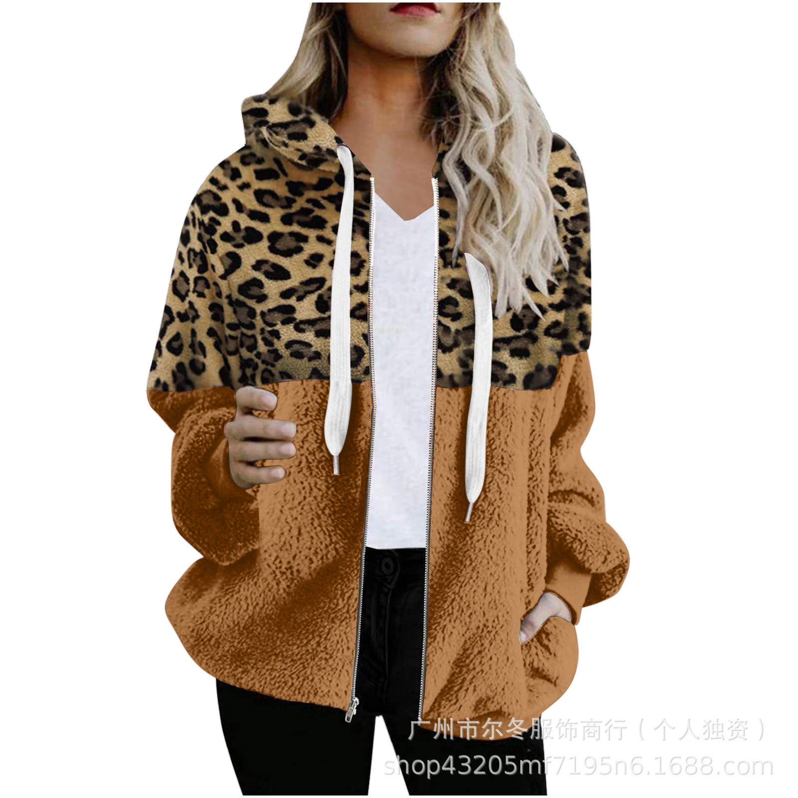 2024년 가을 겨울 아마존 레오파드 프린트 체크 패치워크 지퍼 재킷 플러시 가디건 스웨트셔츠 배색 동물 무늬
