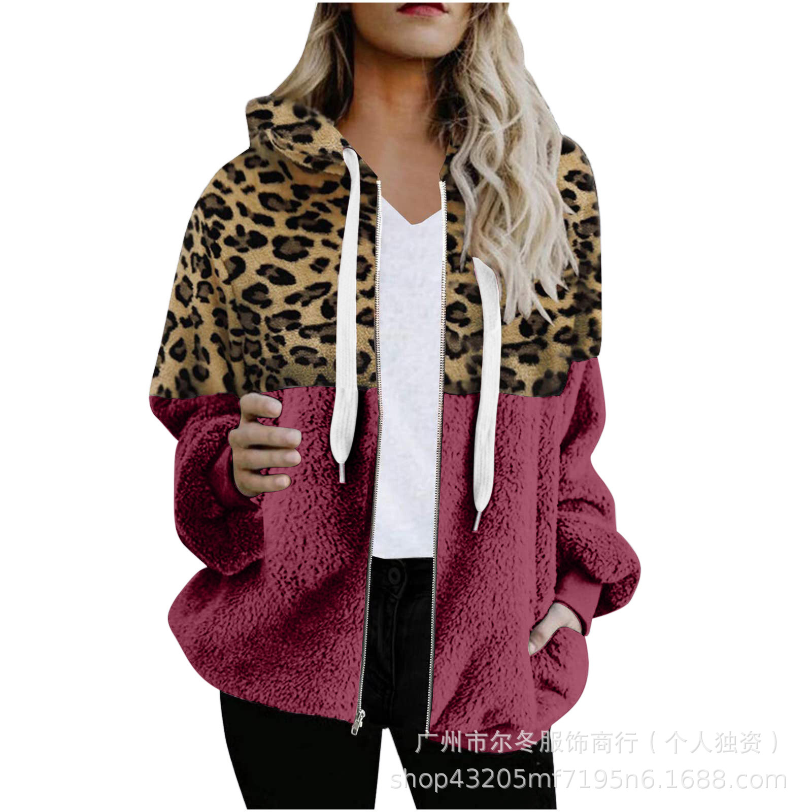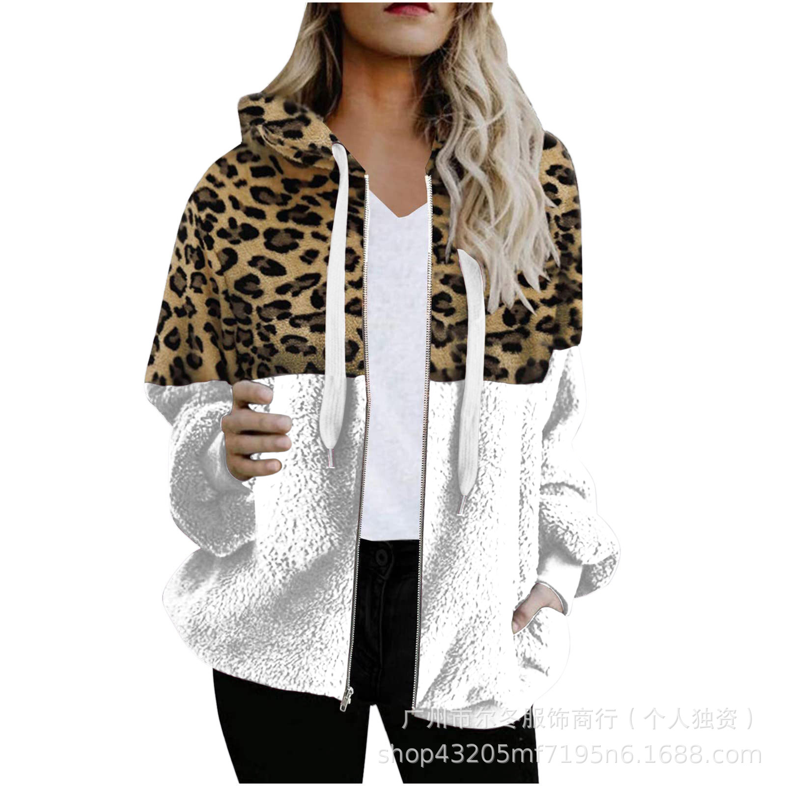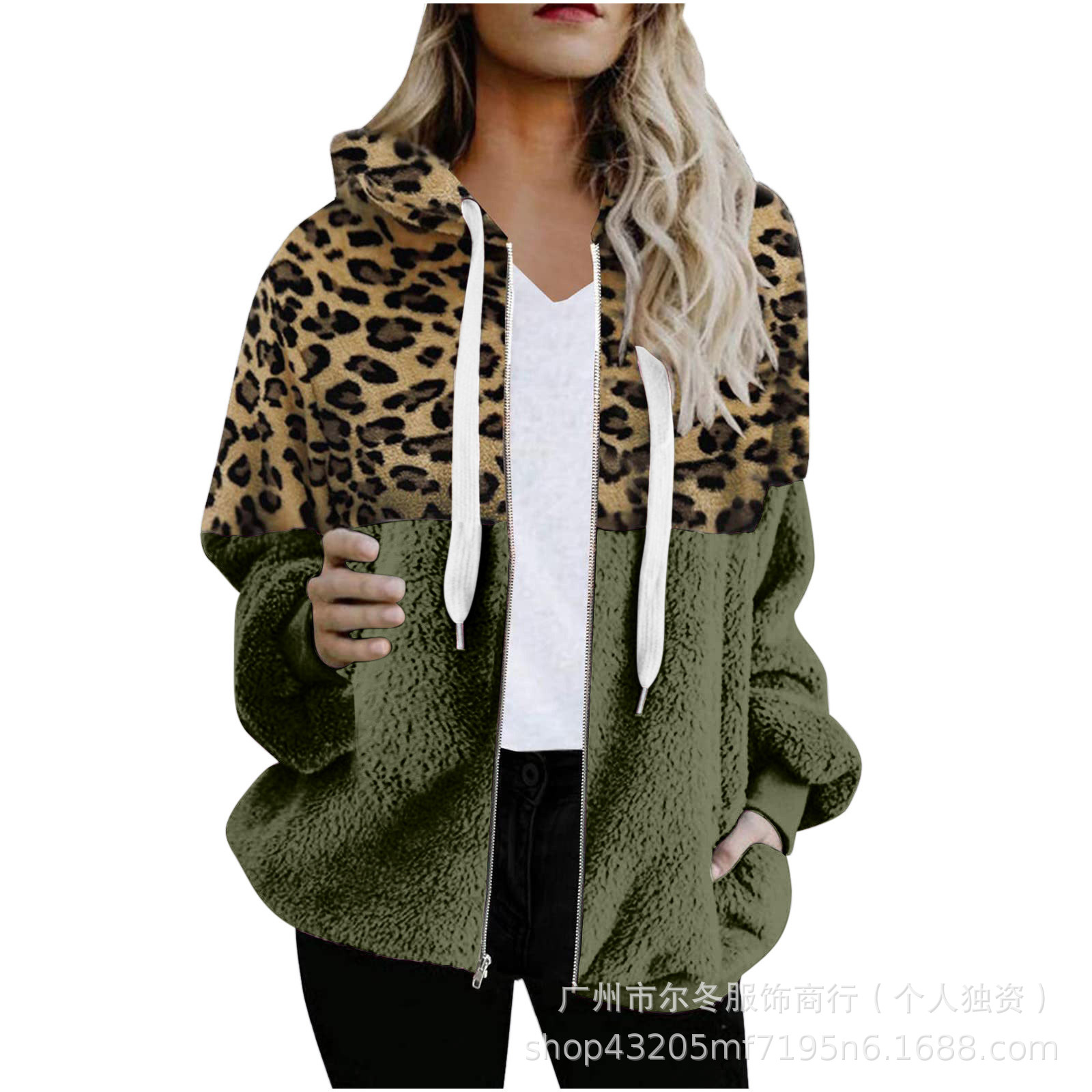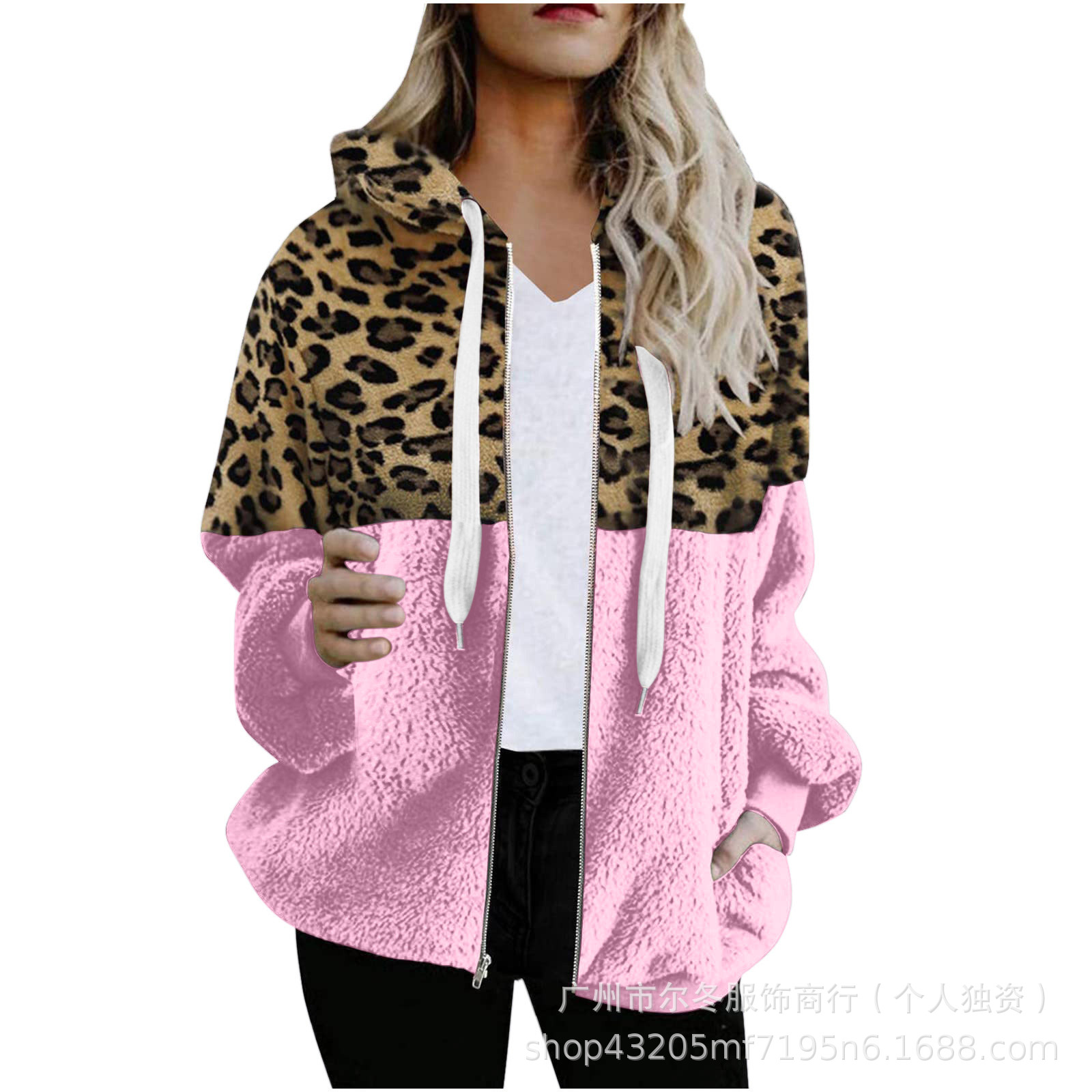 2024년 가을 겨울 아마존 레오파드 프린트 체크 패치워크 지퍼 재킷 플러시 가디건 스웨트셔츠 배색 동물 무늬