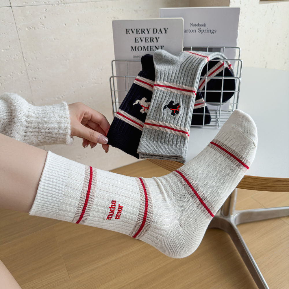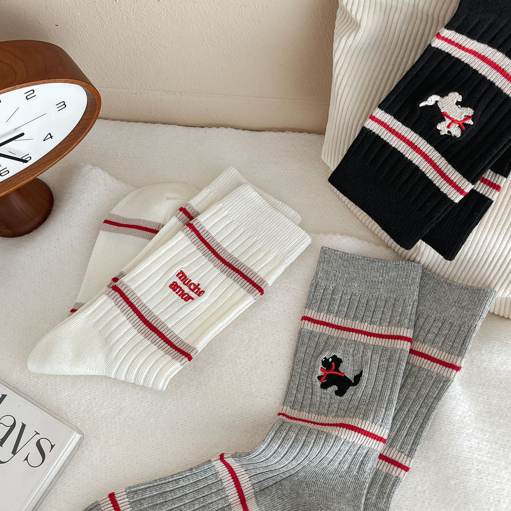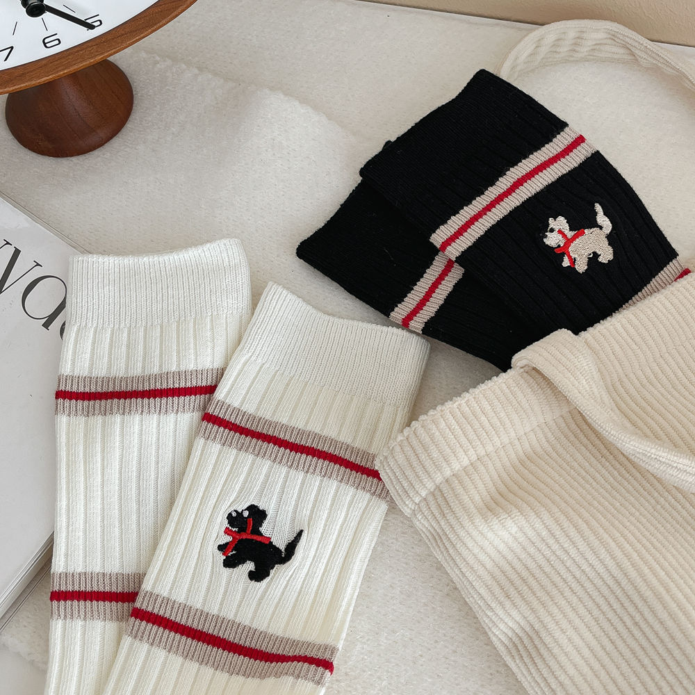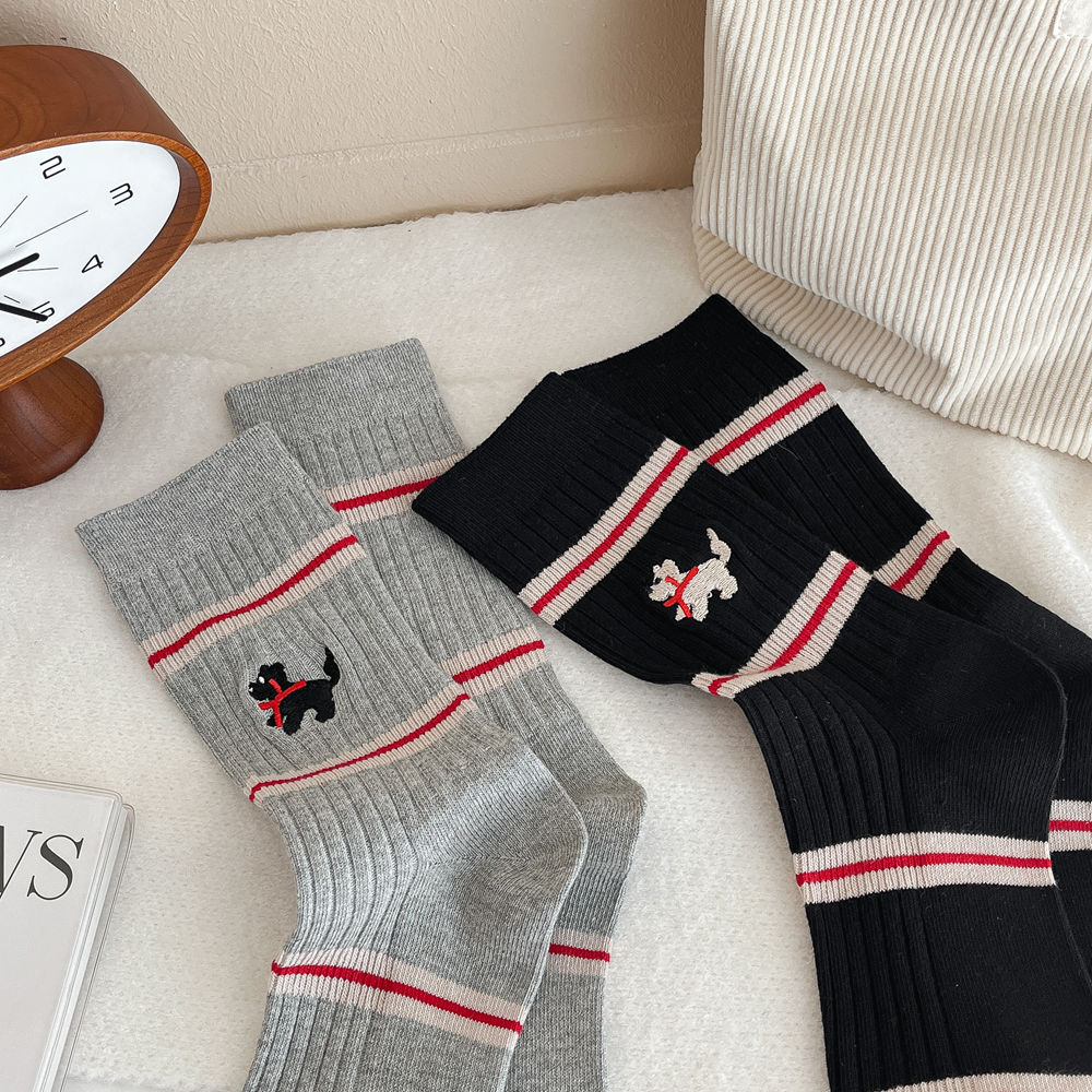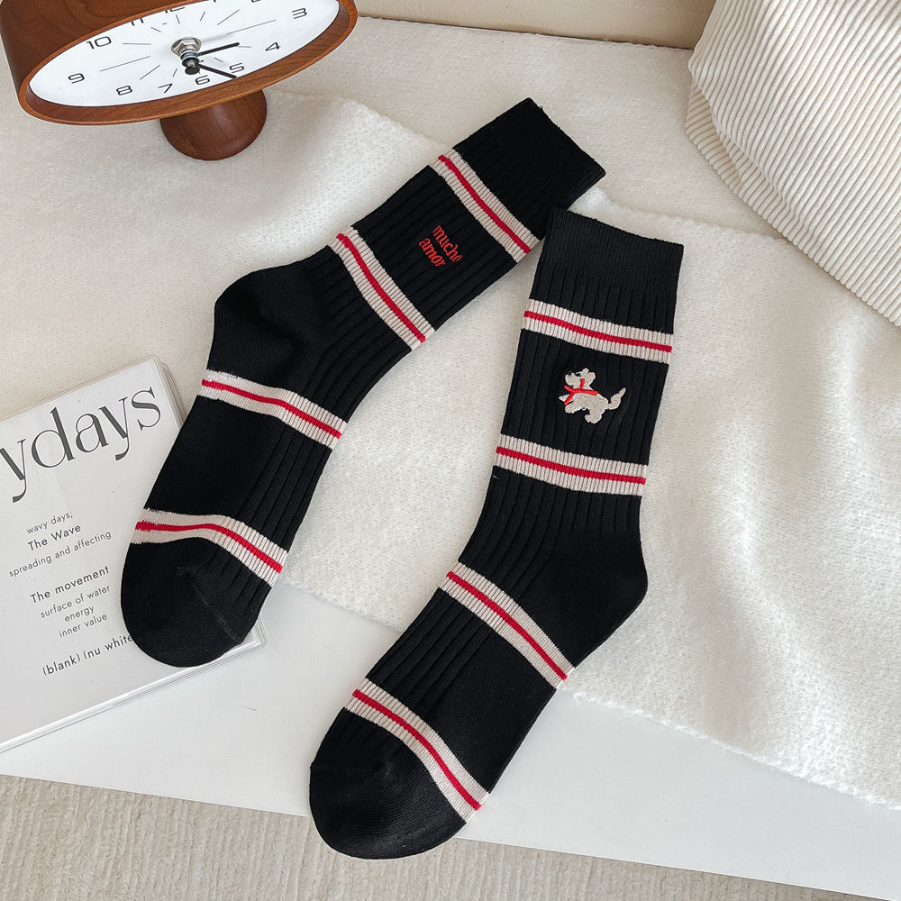 한국 줄무늬 AB 자수 강아지 양말 여성용 페어 코튼 미드 사이즈 양말 유럽식 트렌디 한 아웃웨어 스택 양말