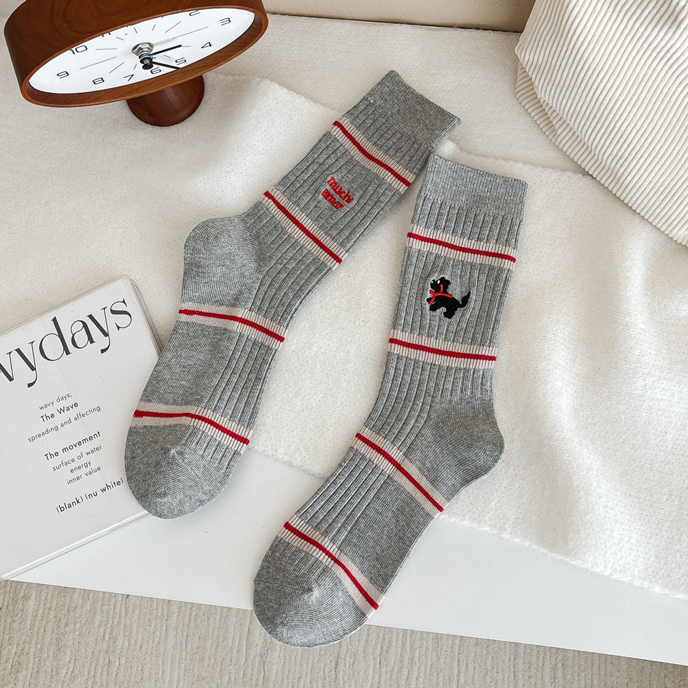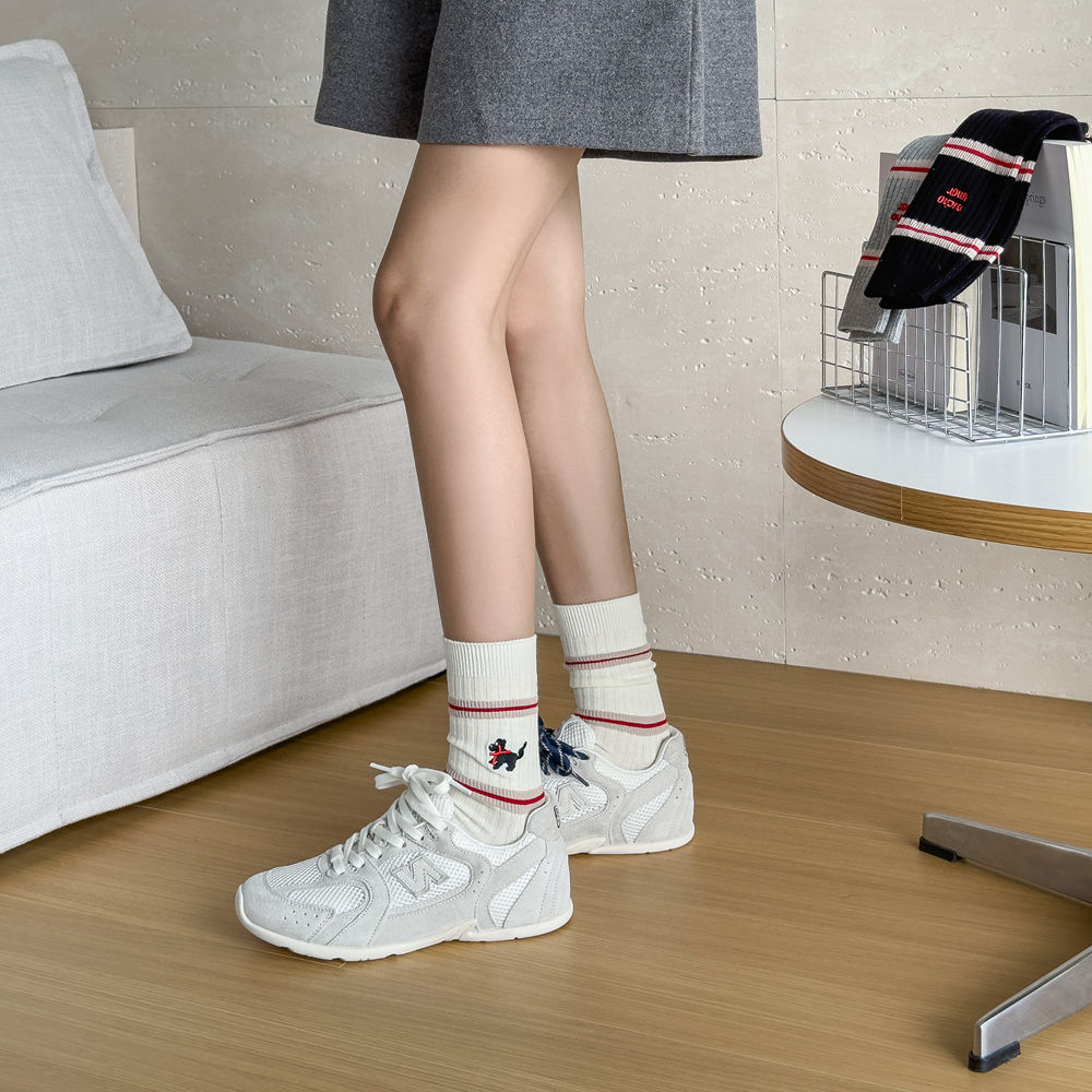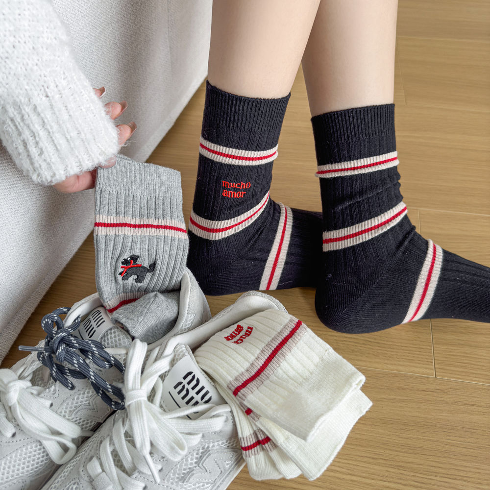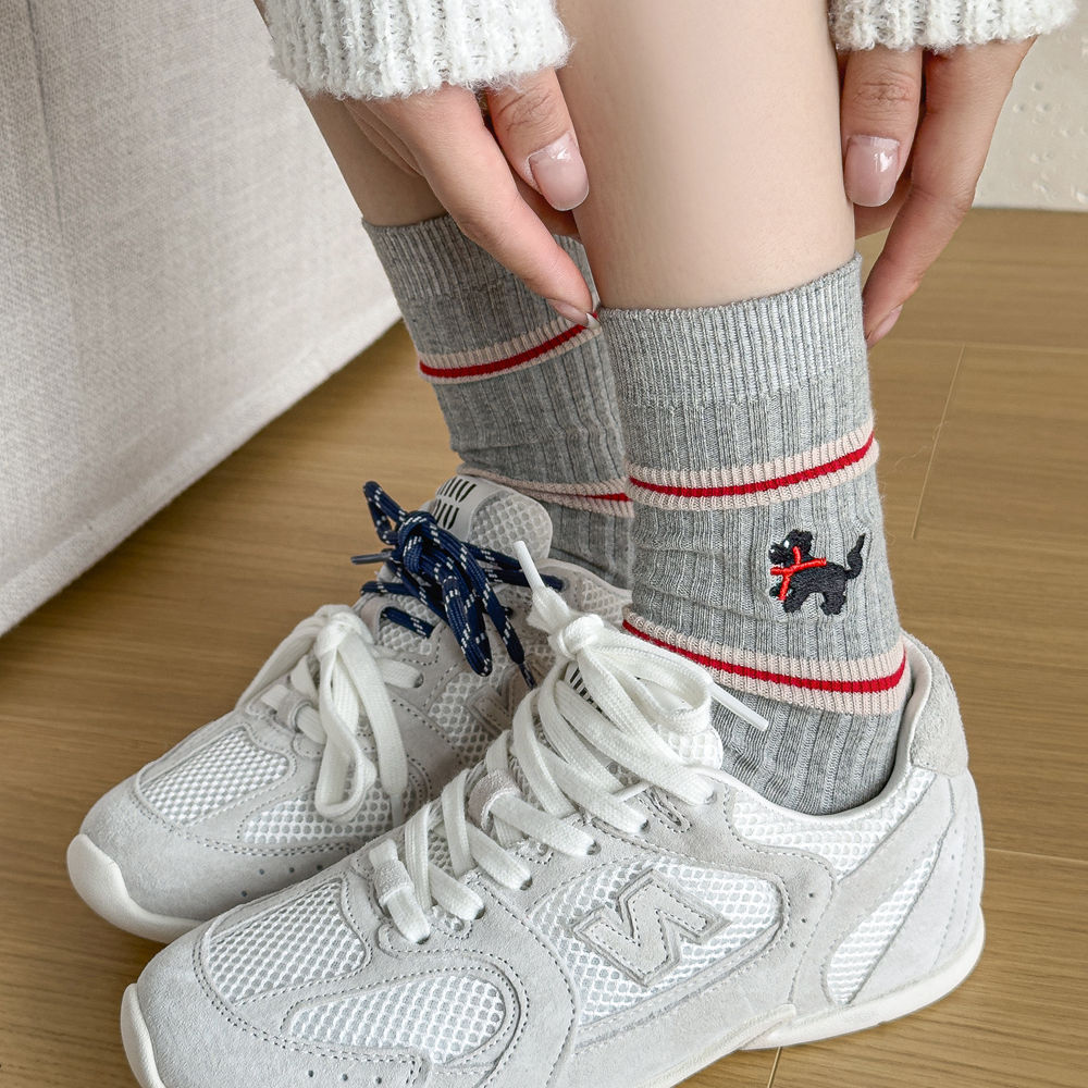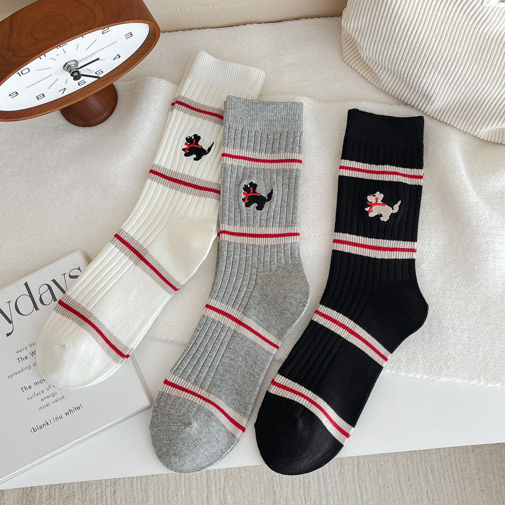 한국 줄무늬 AB 자수 강아지 양말 여성용 페어 코튼 미드 사이즈 양말 유럽식 트렌디 한 아웃웨어 스택 양말