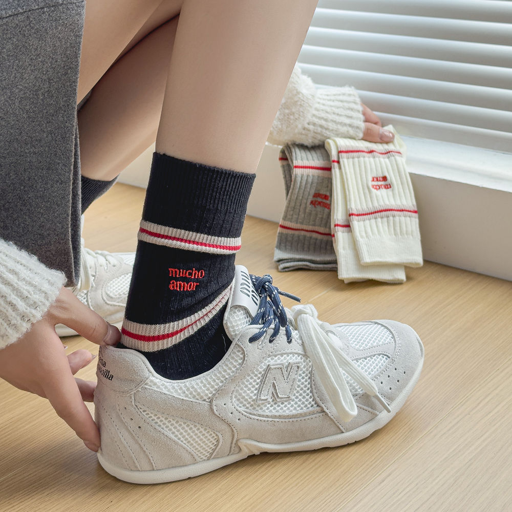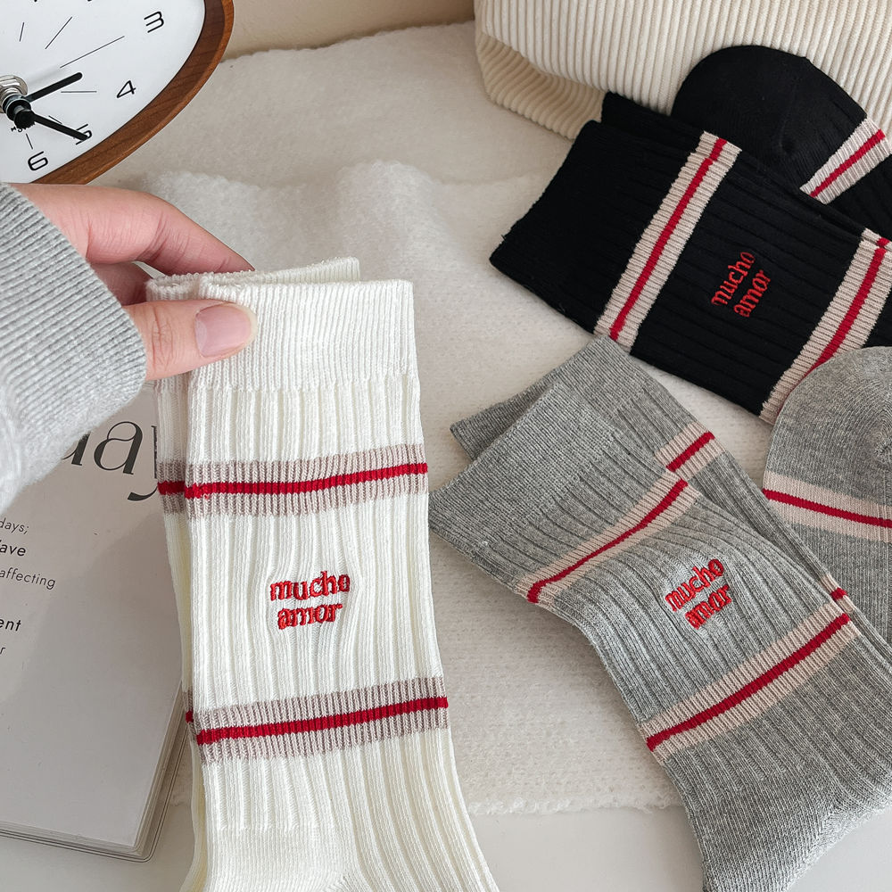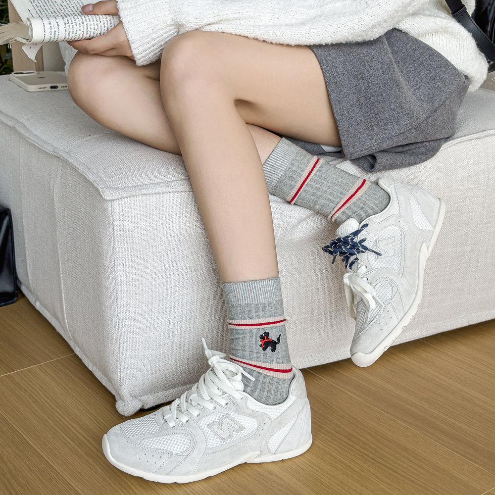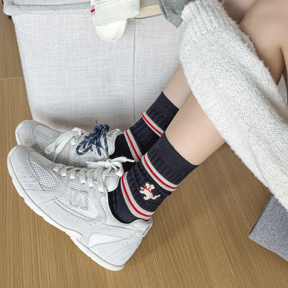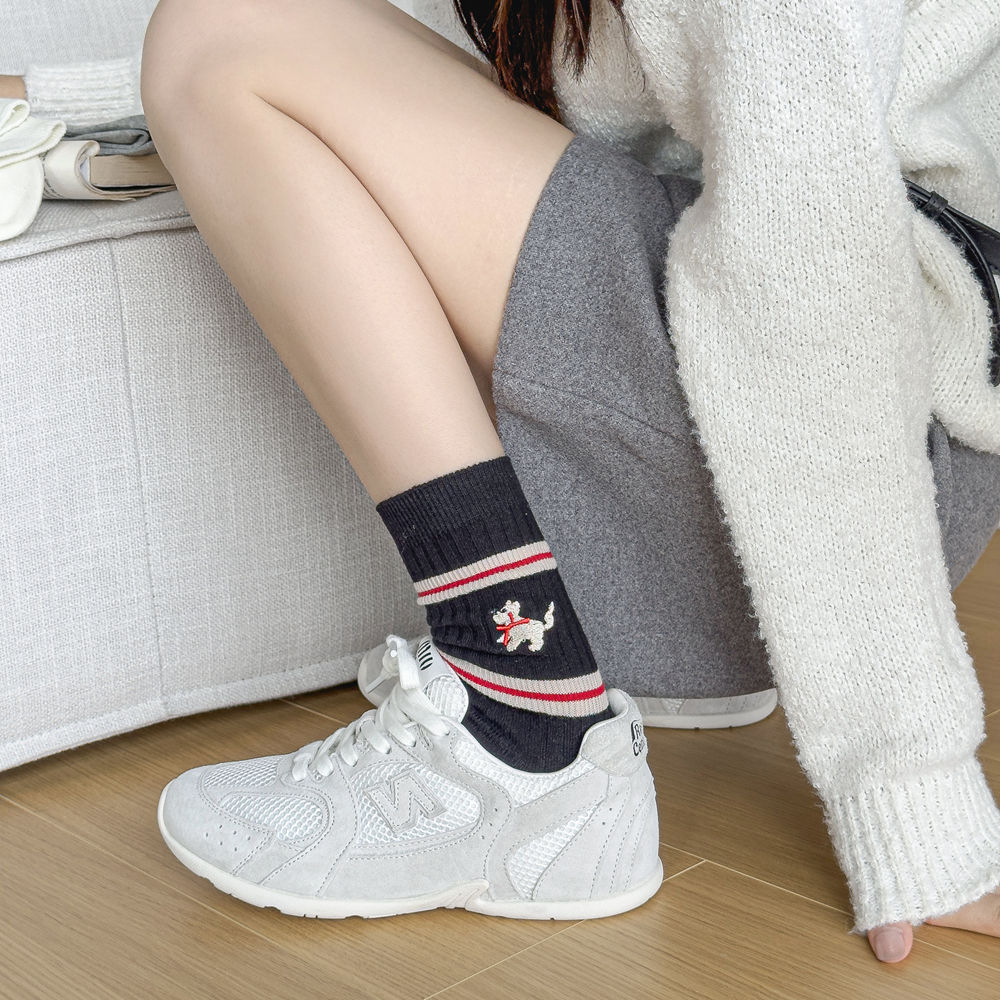 한국 줄무늬 AB 자수 강아지 양말 여성용 페어 코튼 미드 사이즈 양말 유럽식 트렌디 한 아웃웨어 스택 양말