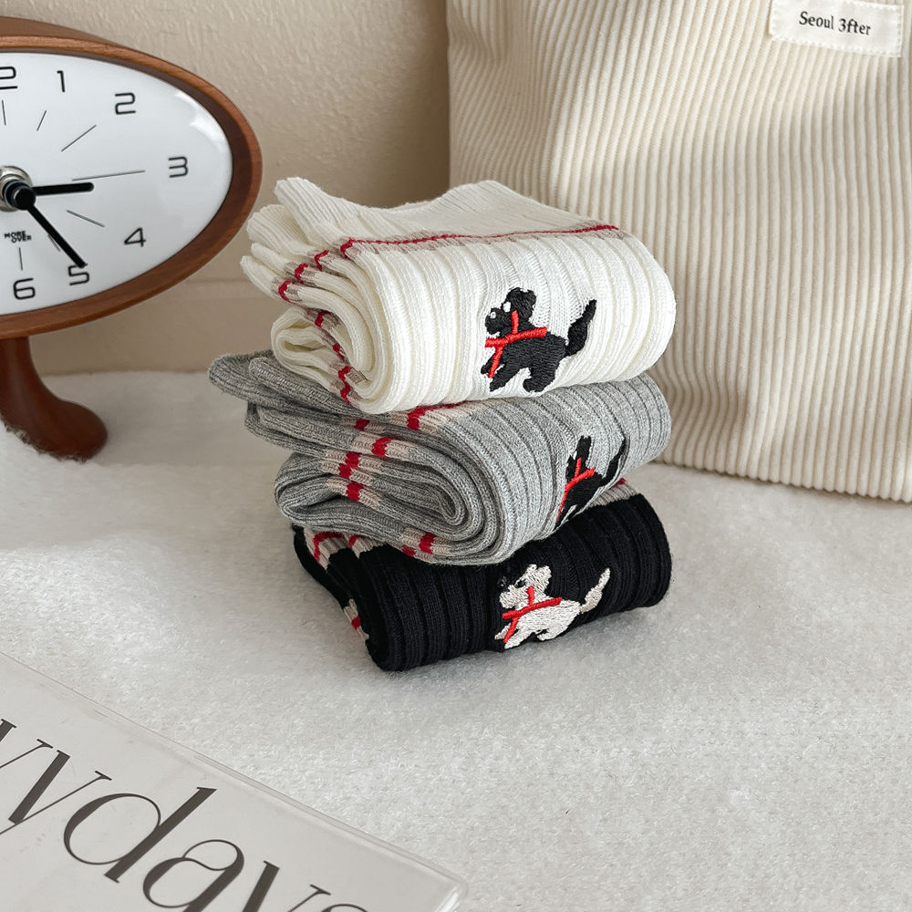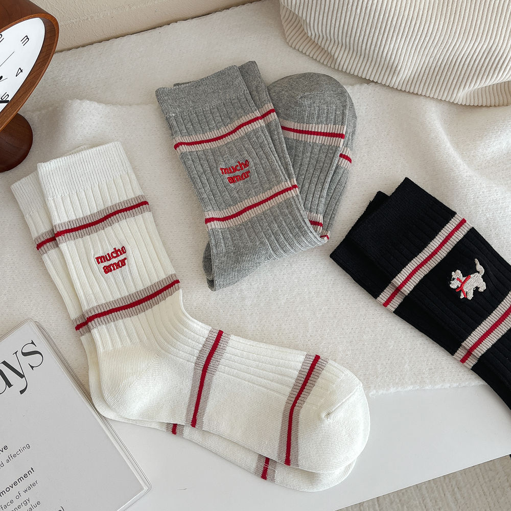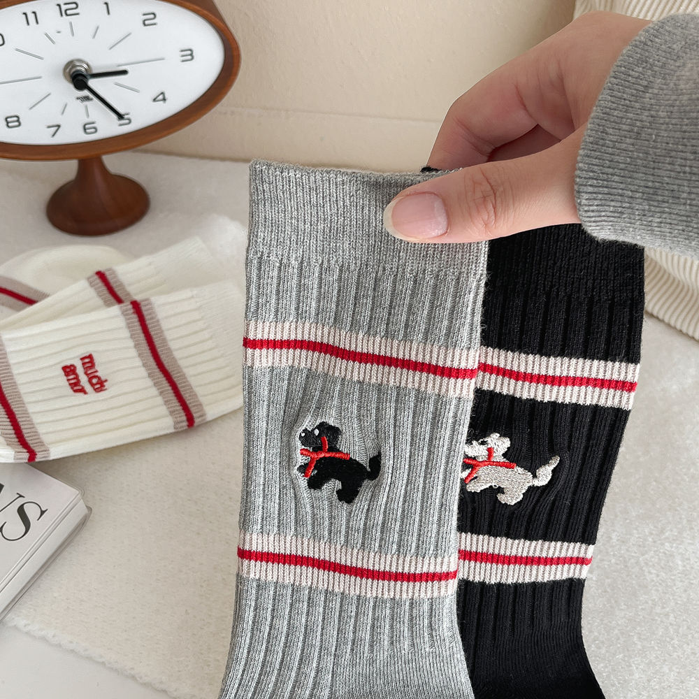 한국 줄무늬 AB 자수 강아지 양말 여성용 페어 코튼 미드 사이즈 양말 유럽식 트렌디 한 아웃웨어 스택 양말스토어 가기