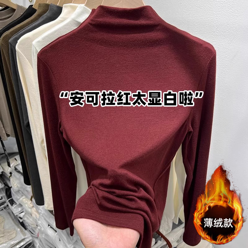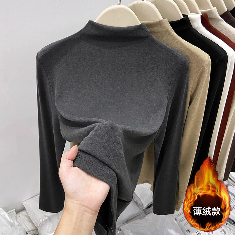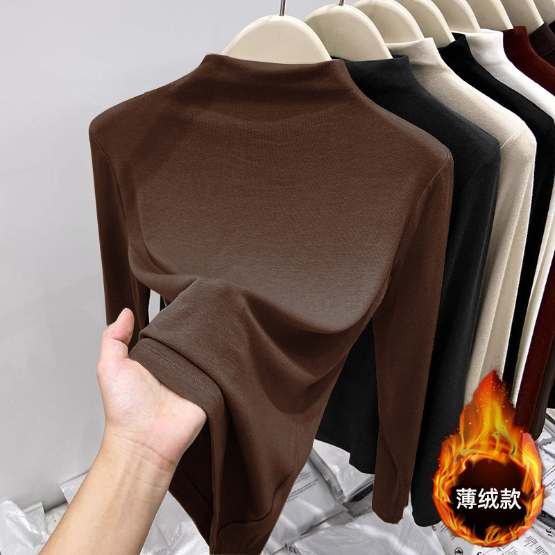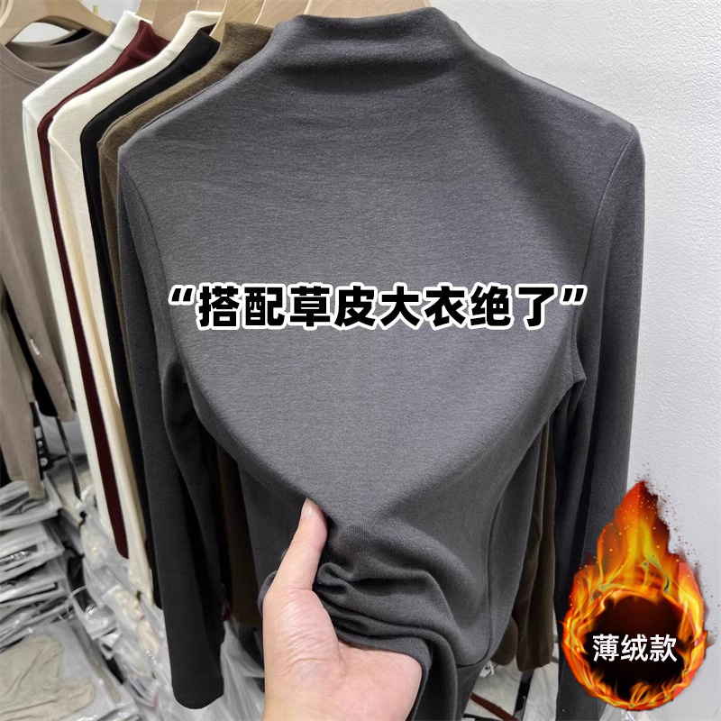 여성을위한 유럽 스레드 하프 터틀넥 바닥 셔츠 2025 가을, 겨울 새로운 스타일 기모 얇은 벨벳 긴팔 이너 탑 티셔츠 유행스토어 가기