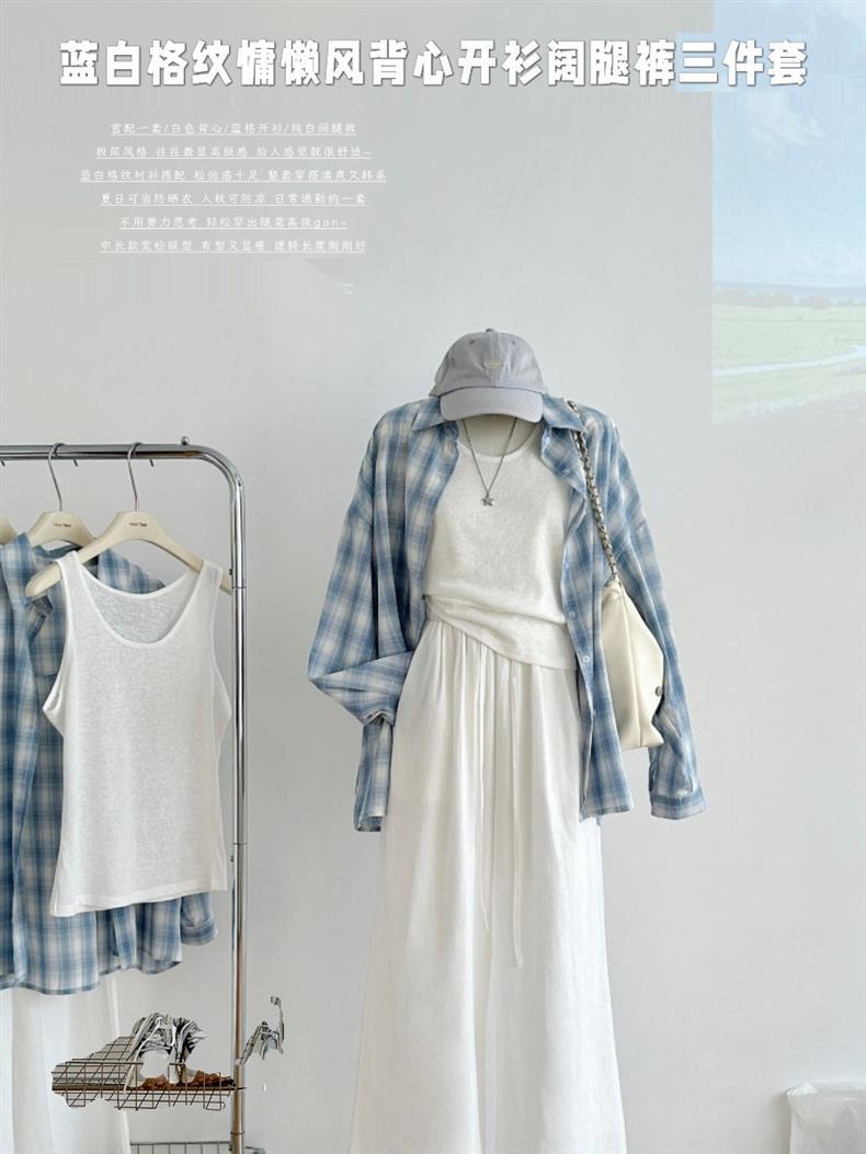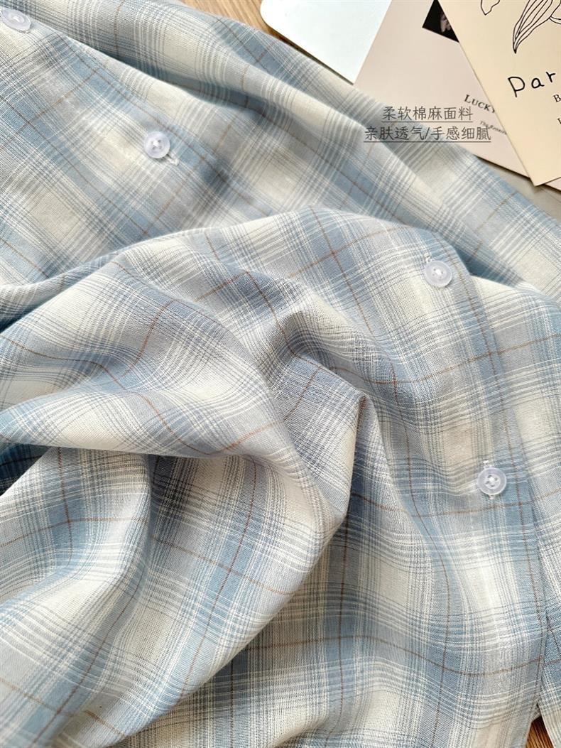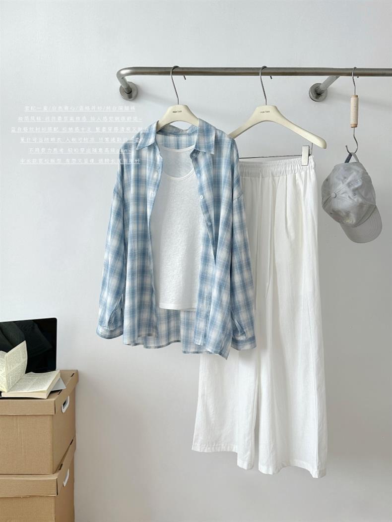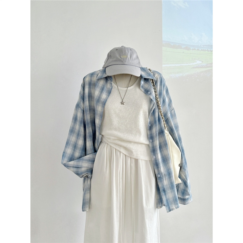 여성을위한 한국 스타일 게으른 스타일 파란색 격자 무늬 긴팔 셔츠 봄, 가을, 여름 새로운 다목적 태양 보호 외부 셔츠 탑