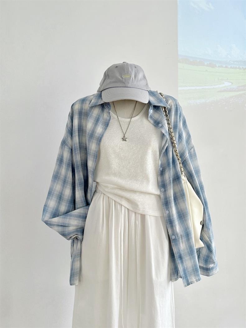 여성을위한 한국 스타일 게으른 스타일 파란색 격자 무늬 긴팔 셔츠 봄, 가을, 여름 새로운 다목적 태양 보호 외부 셔츠 탑스토어 가기