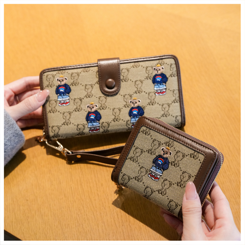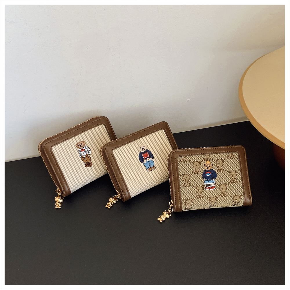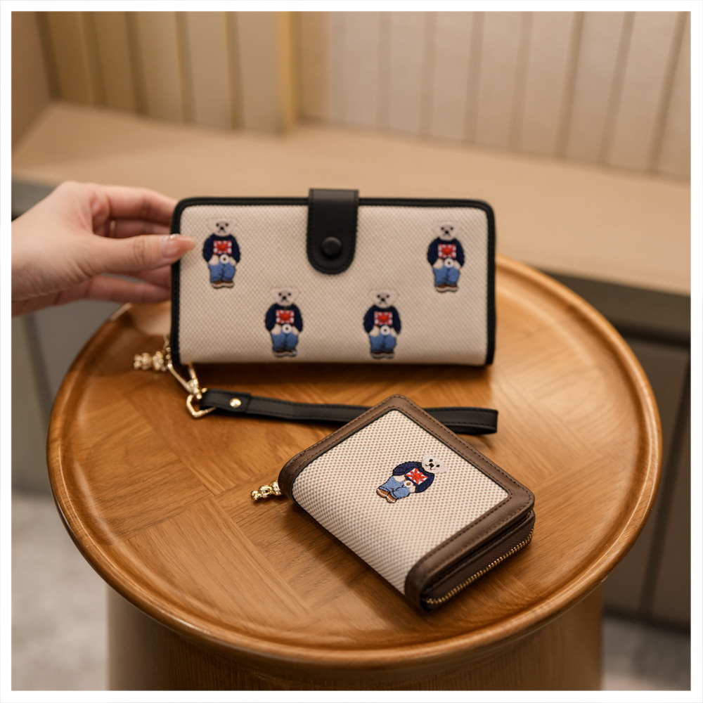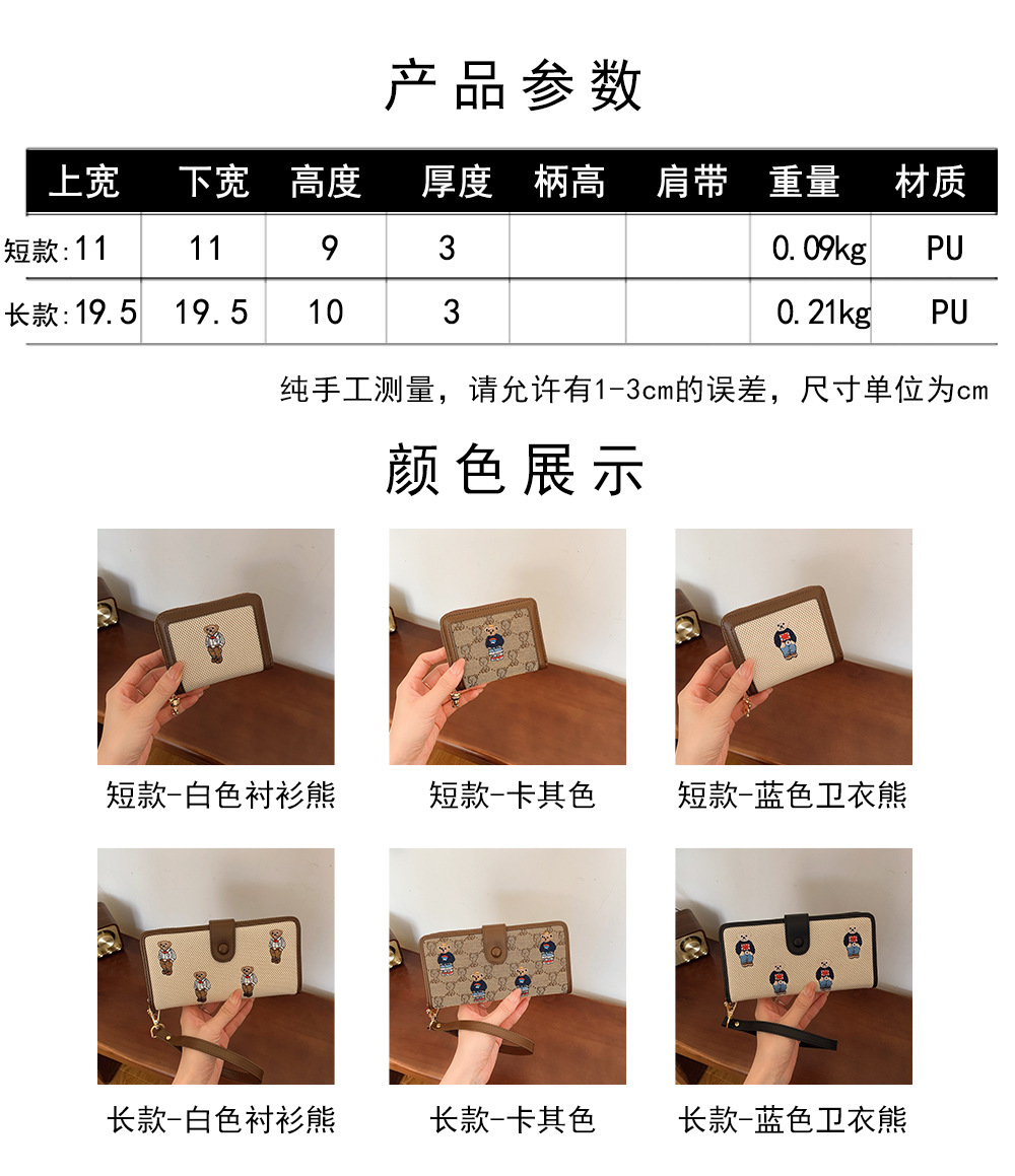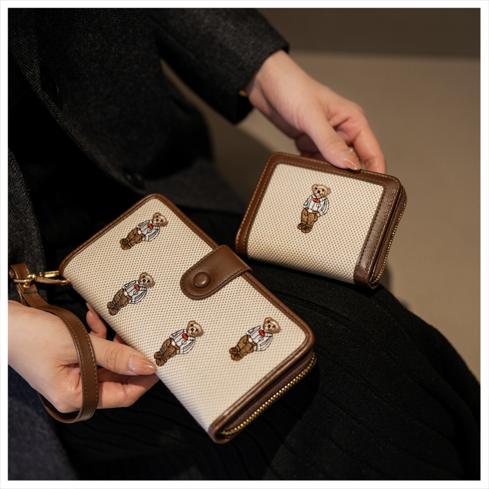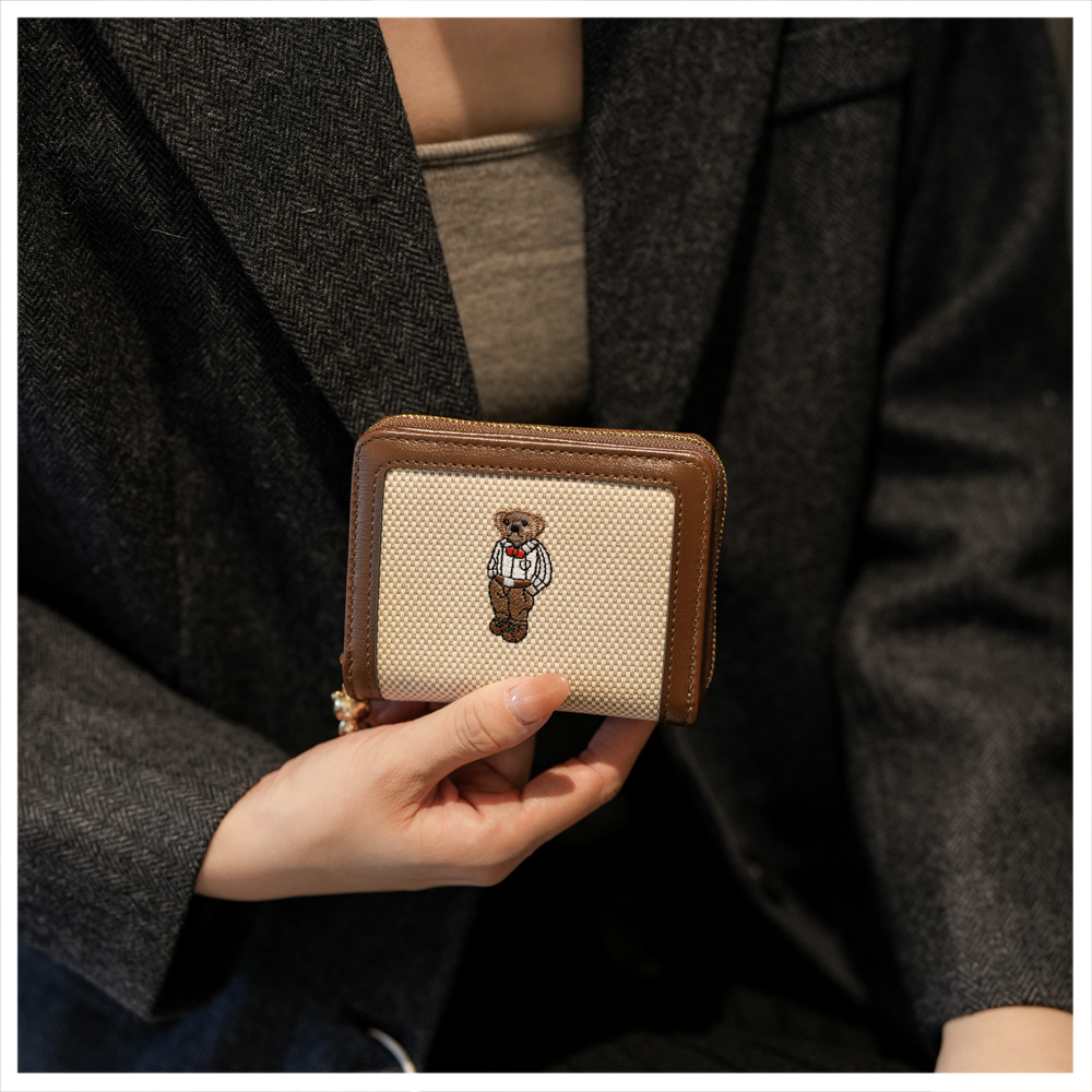 2024新款女士钱包短款钱夹大容量小熊刺绣帆布手包折叠卡通零钱包
