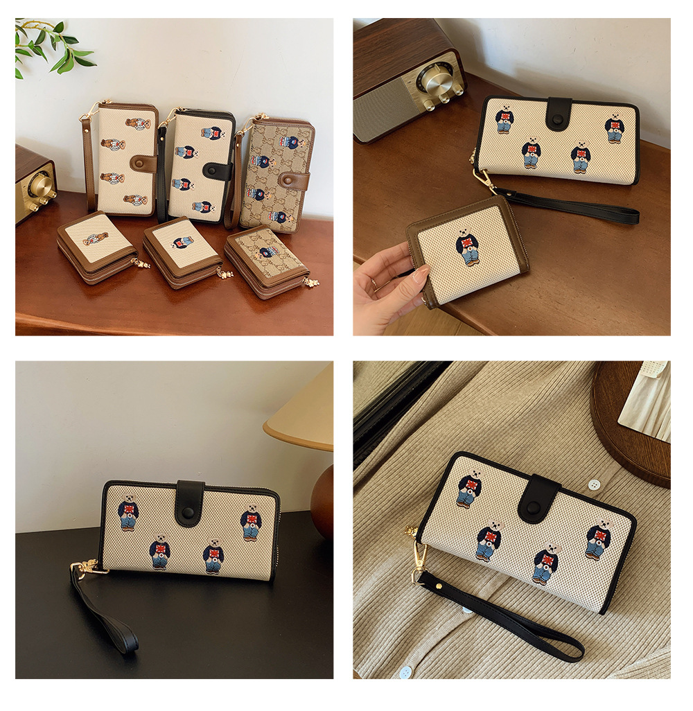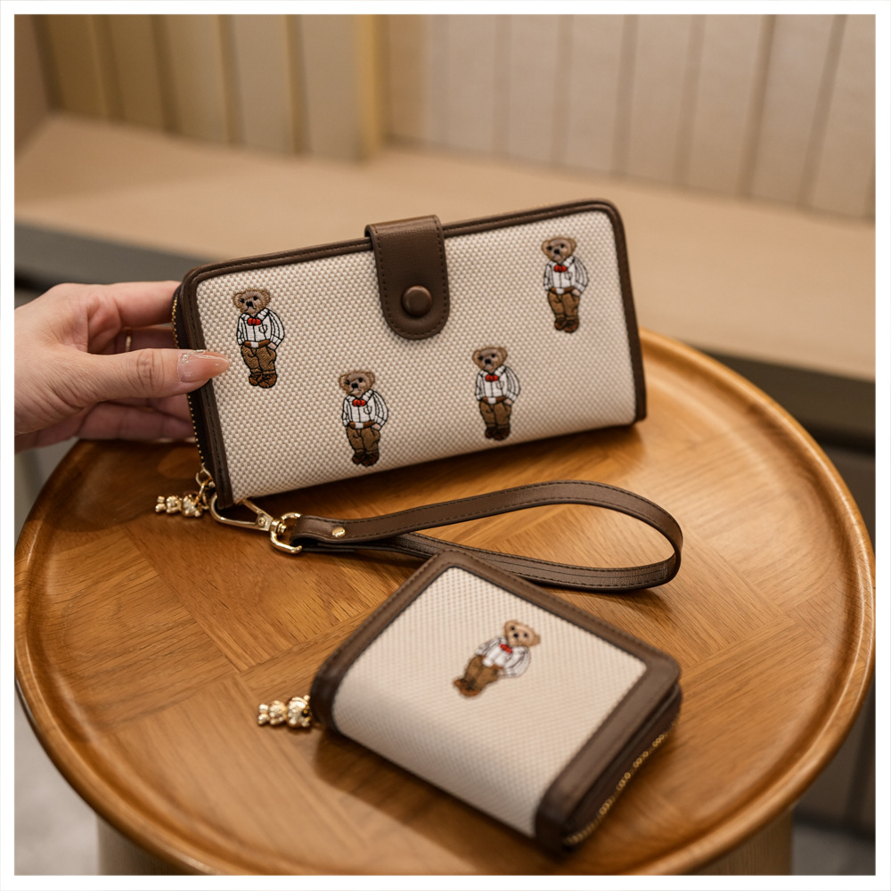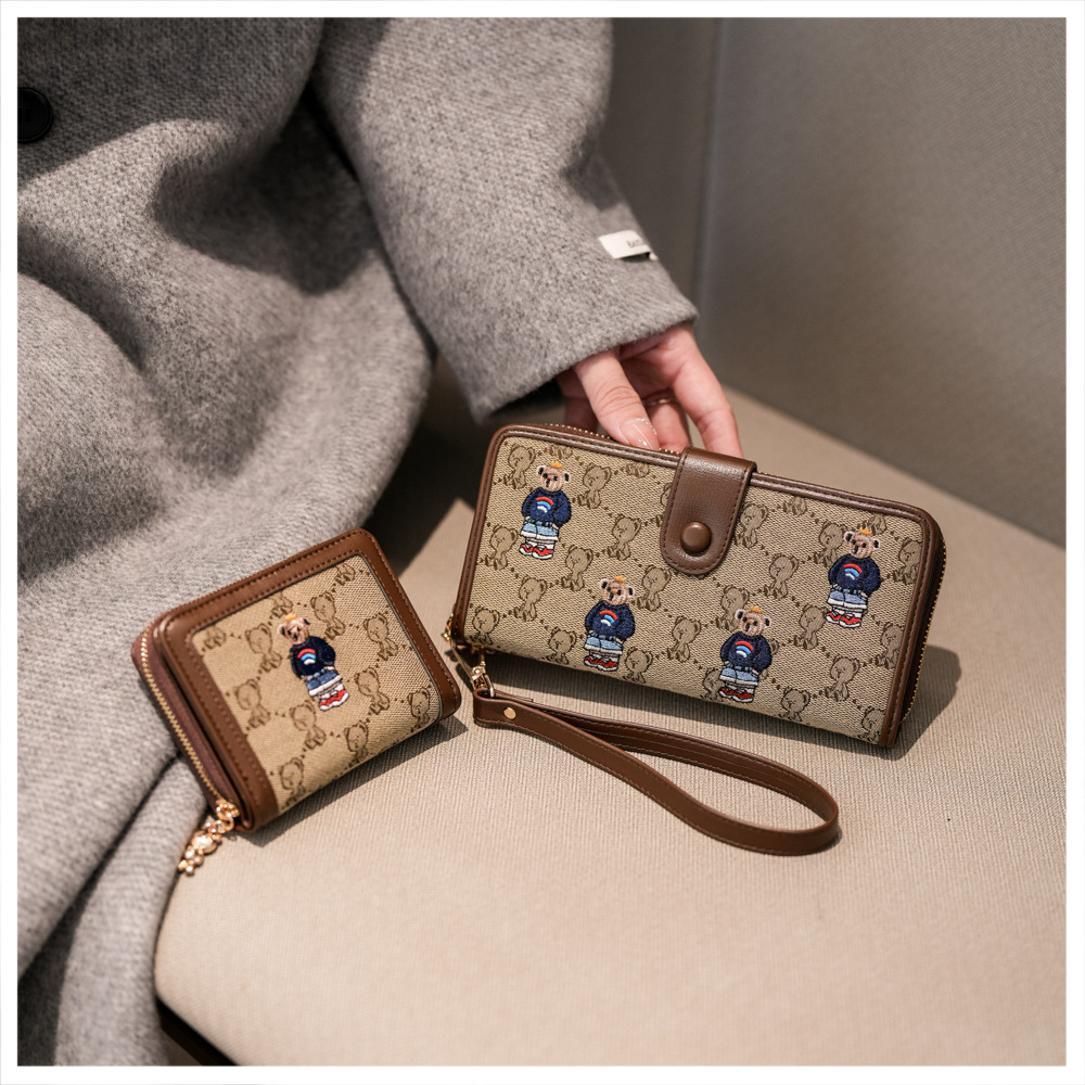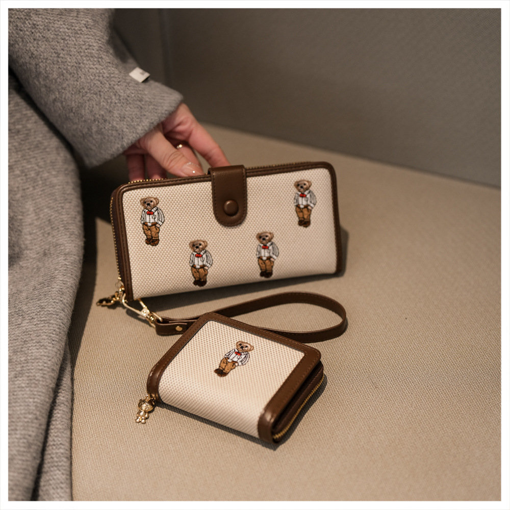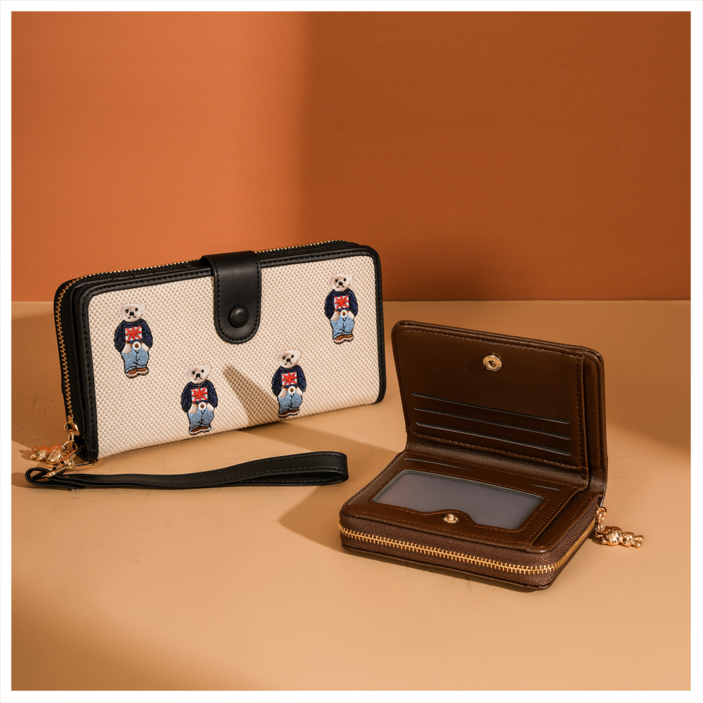 2024新款女士钱包短款钱夹大容量小熊刺绣帆布手包折叠卡通零钱包