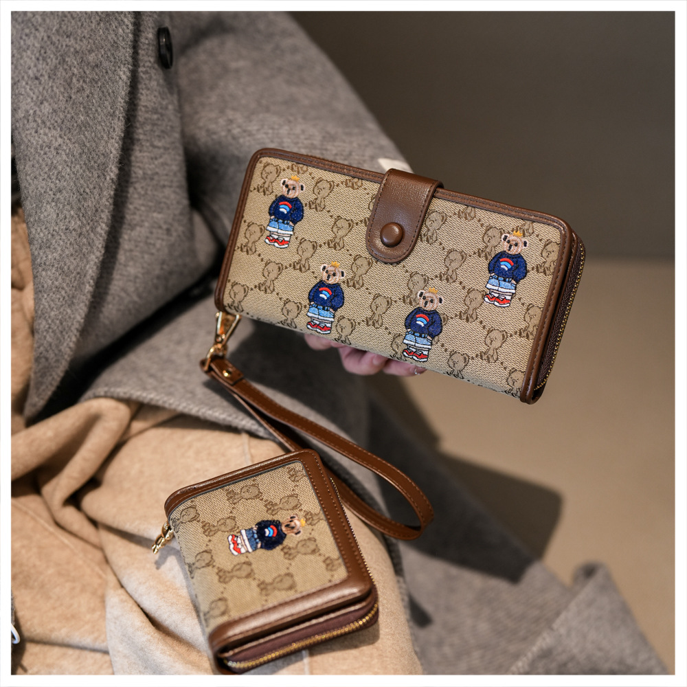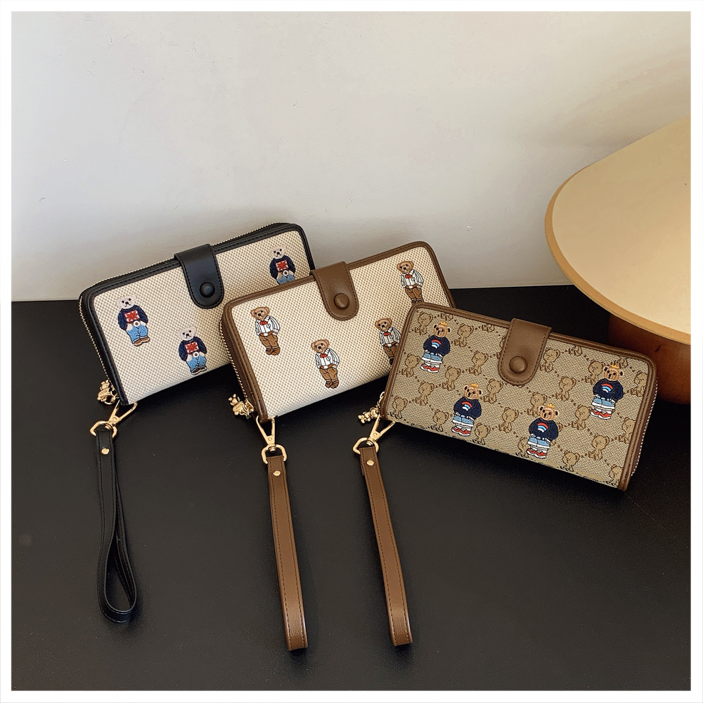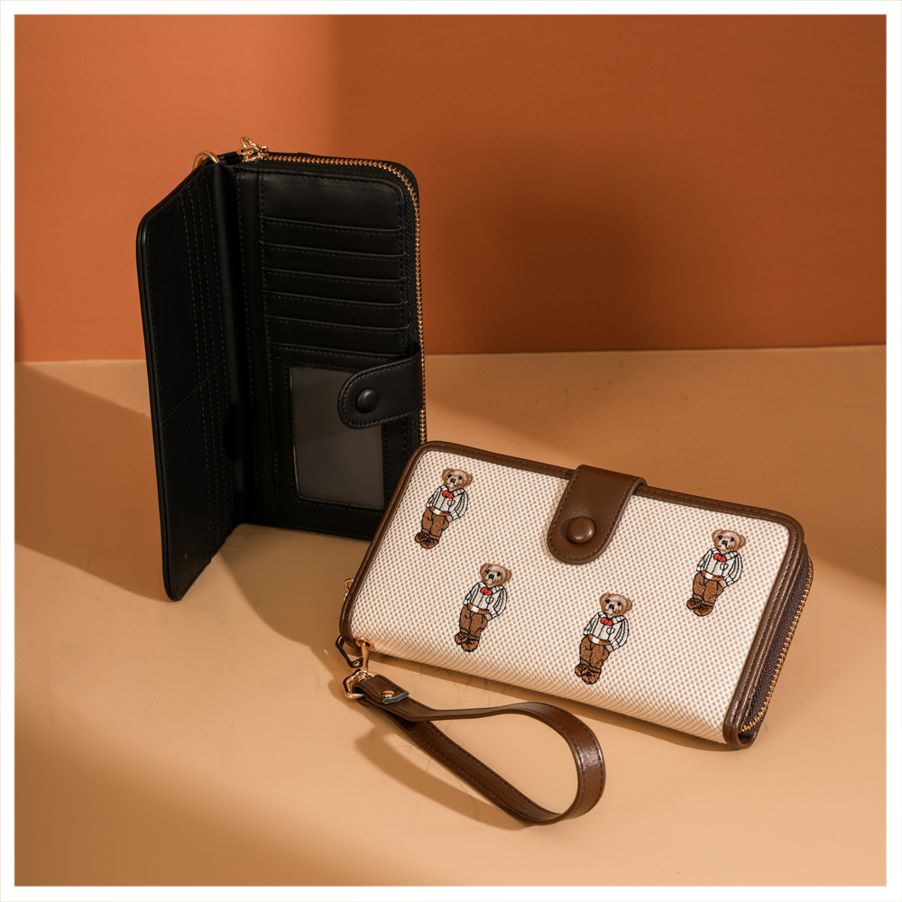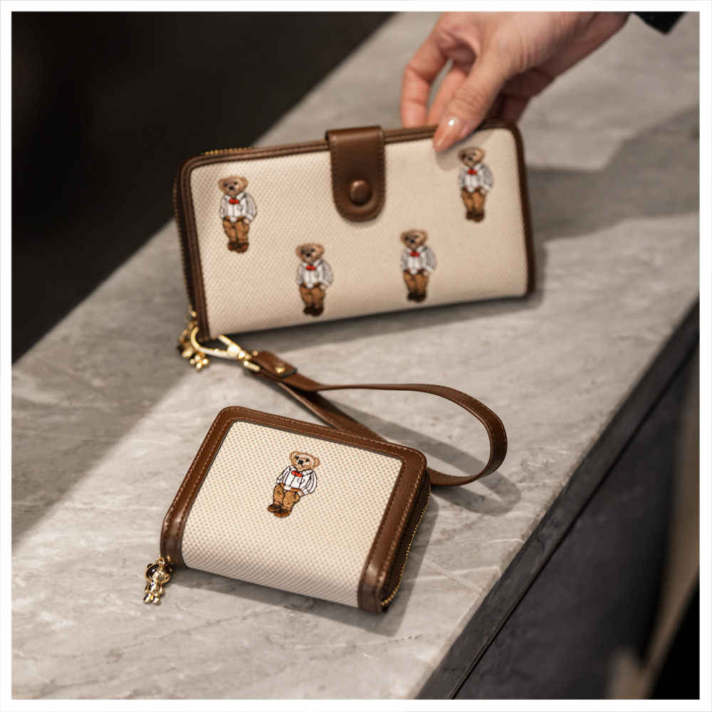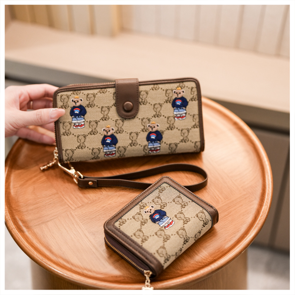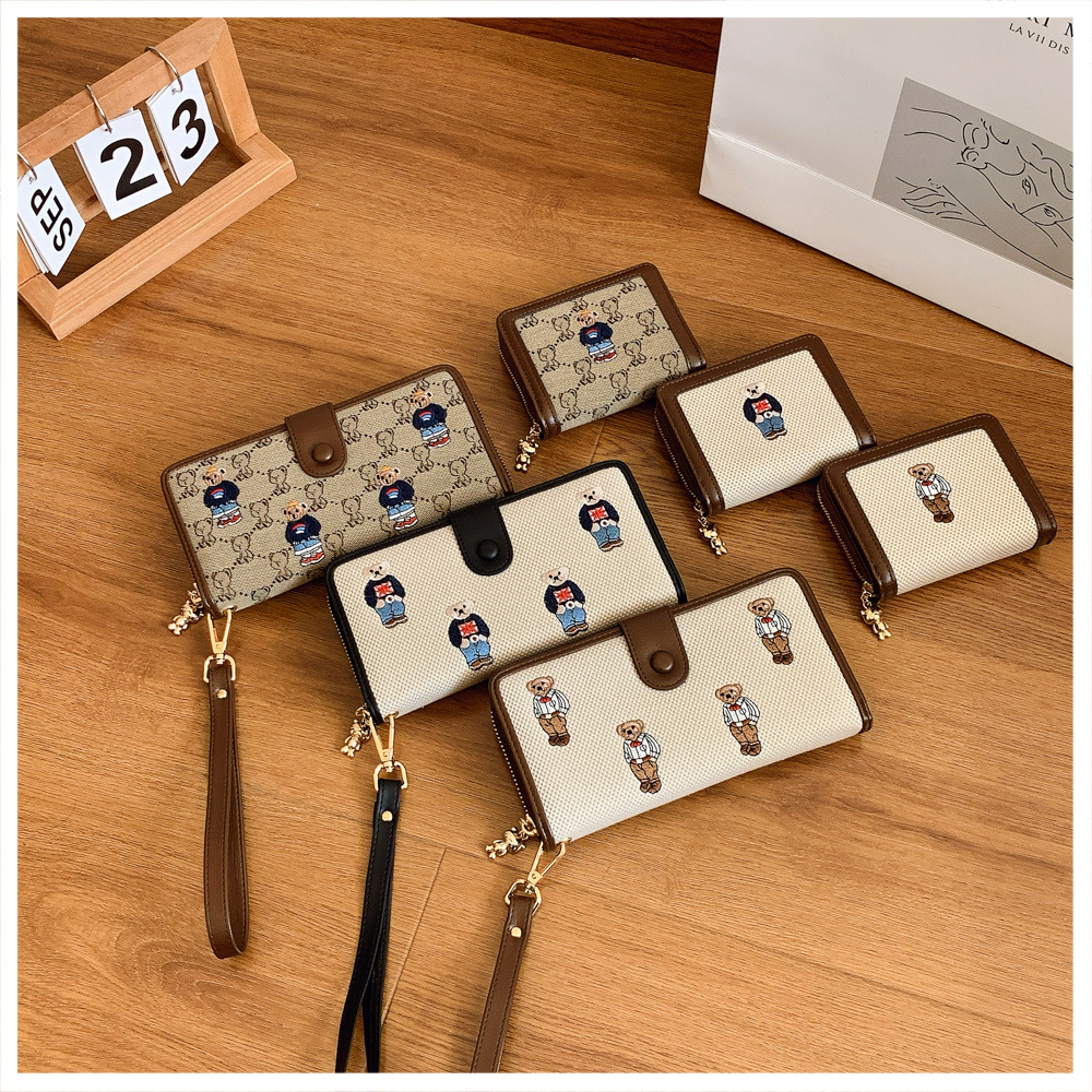 2024新款女士钱包短款钱夹大容量小熊刺绣帆布手包折叠卡通零钱包