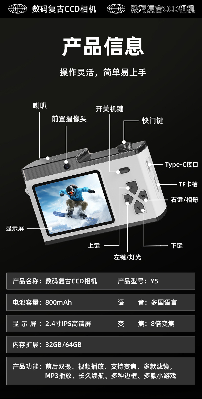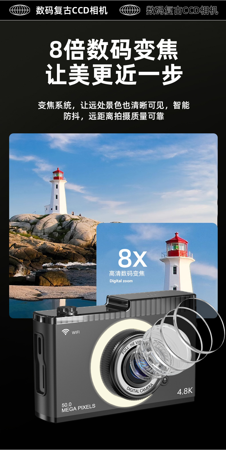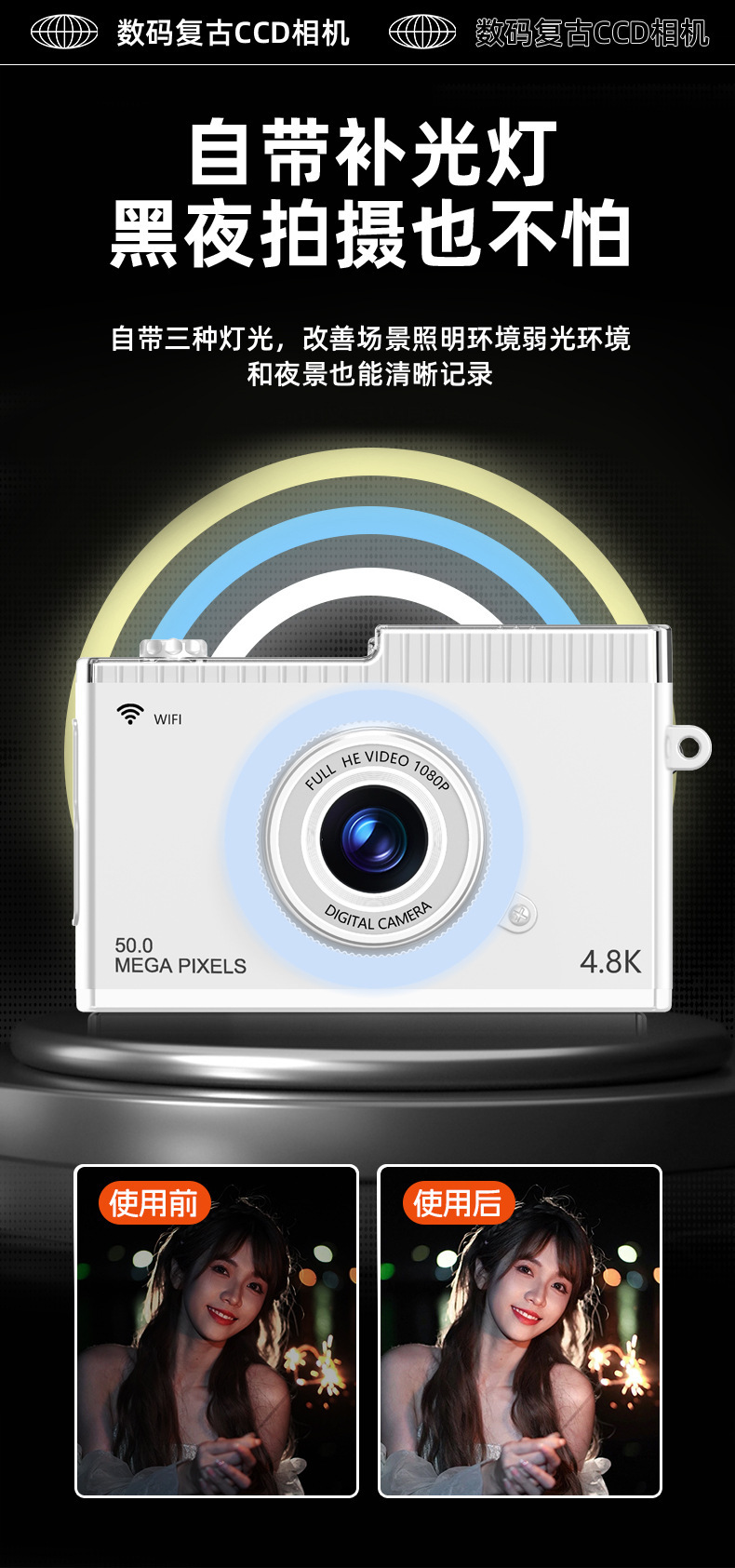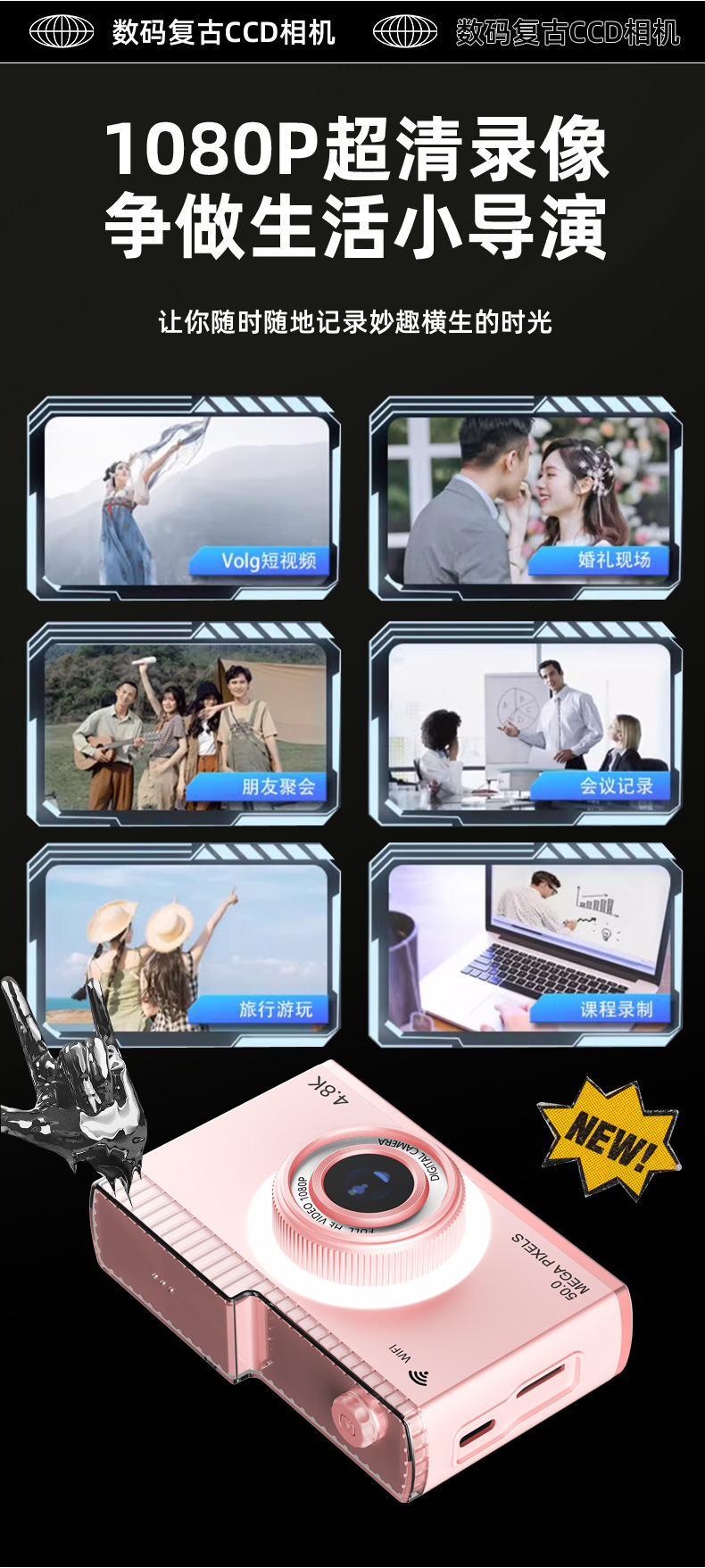 支持WIFI传输CCD校园学生相机5000W高清双摄迷你复古数码相机玩具