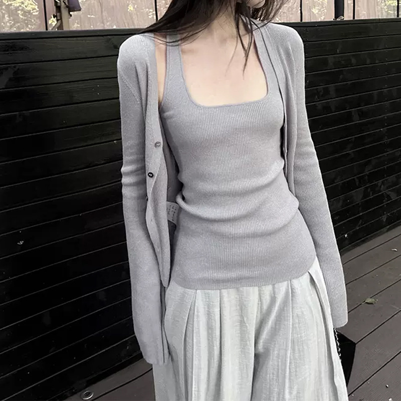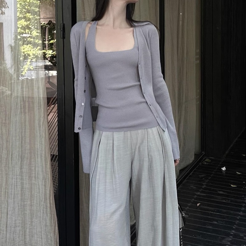 니트 카디건 코트 여성의 가을 긴 소매 얇은 목 조끼 보라색 디자인 느낌 투피스 세트 패션스토어 가기