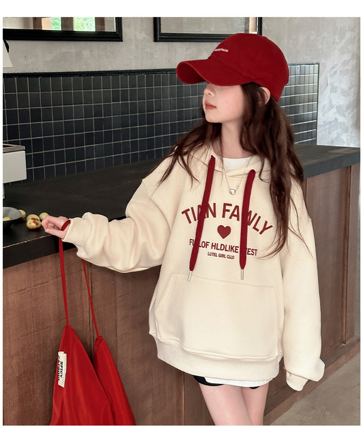 여아 캐주얼 코트 후드 티셔츠 가을, 겨울 2025 새로운 스타일 중대형 어린이 스타일 러브 프린트 풀오버 탑