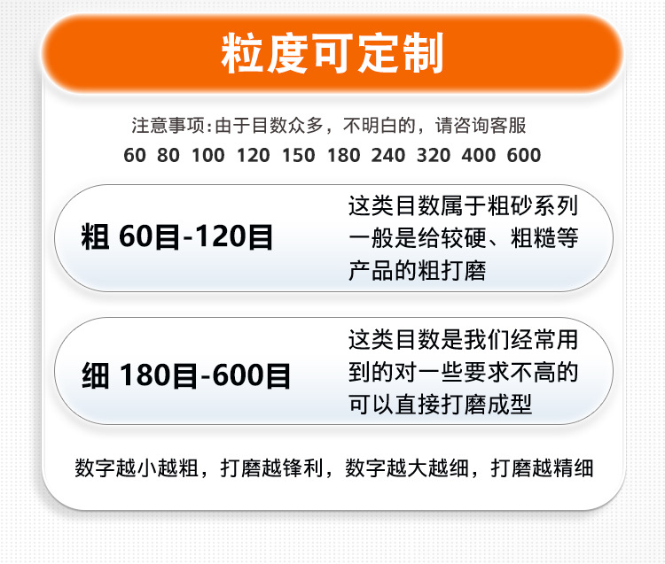 我们可以按照客户图纸或样品定制各类材质尺寸的打磨抛光产品,打样周期2-3天。还为有需要的客户提供OEM服务,包括设计独特品牌logo和包装。并持续关注客户的售后体验,让客户享受安心的产品和服务。