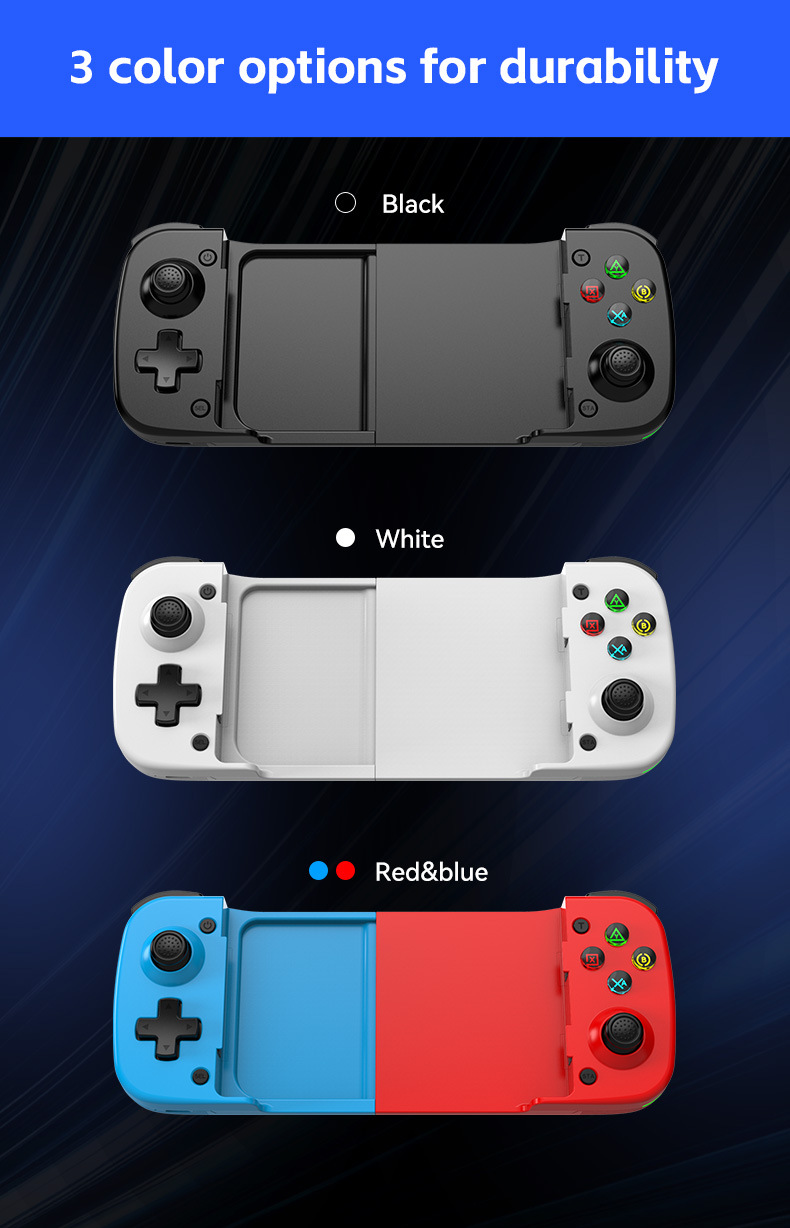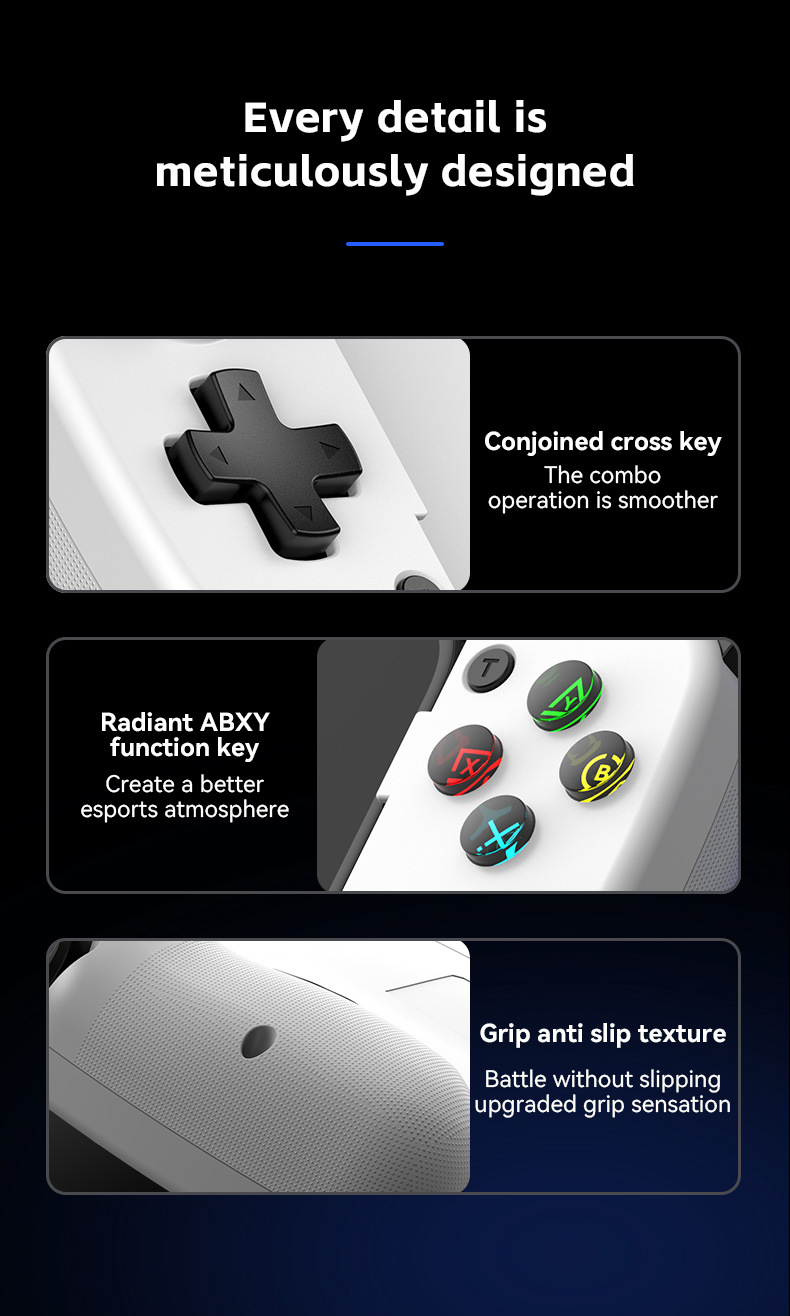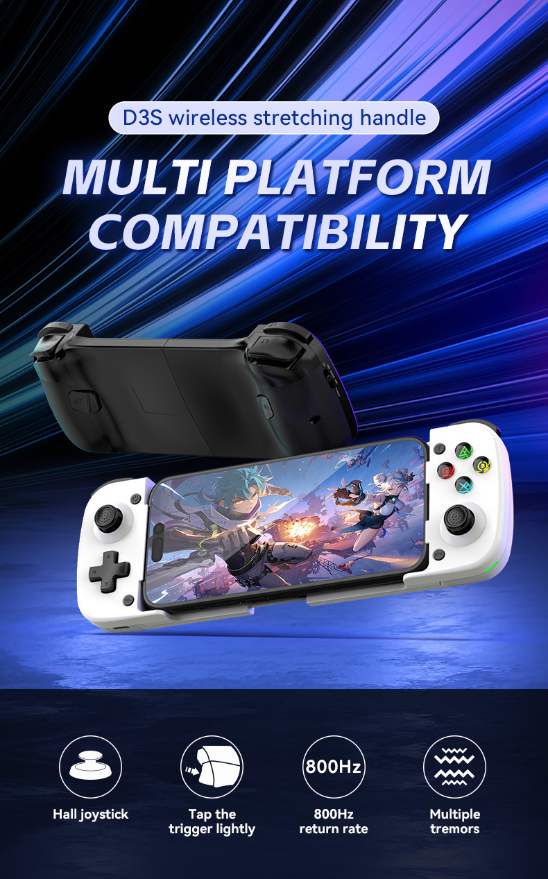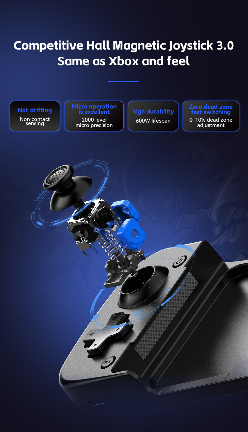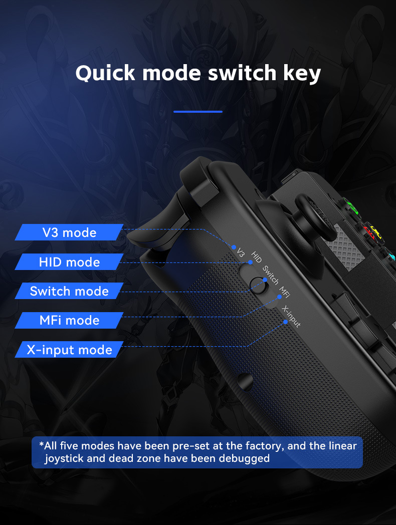 此款与D3区别:模式切换开关,无需要复合按键,不同模式直接切换,连接更简单更直接。带有霍尔摇杆和扳机。内置双震动摇摆马达