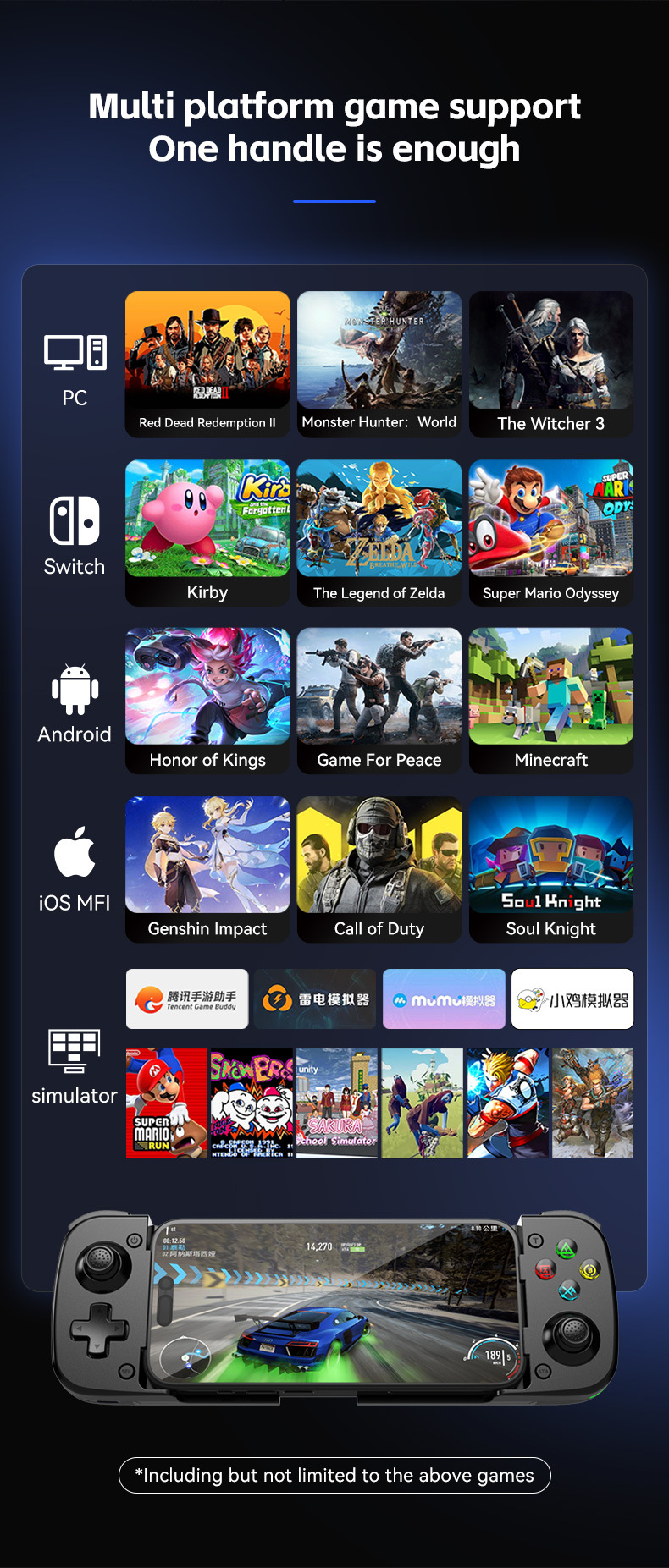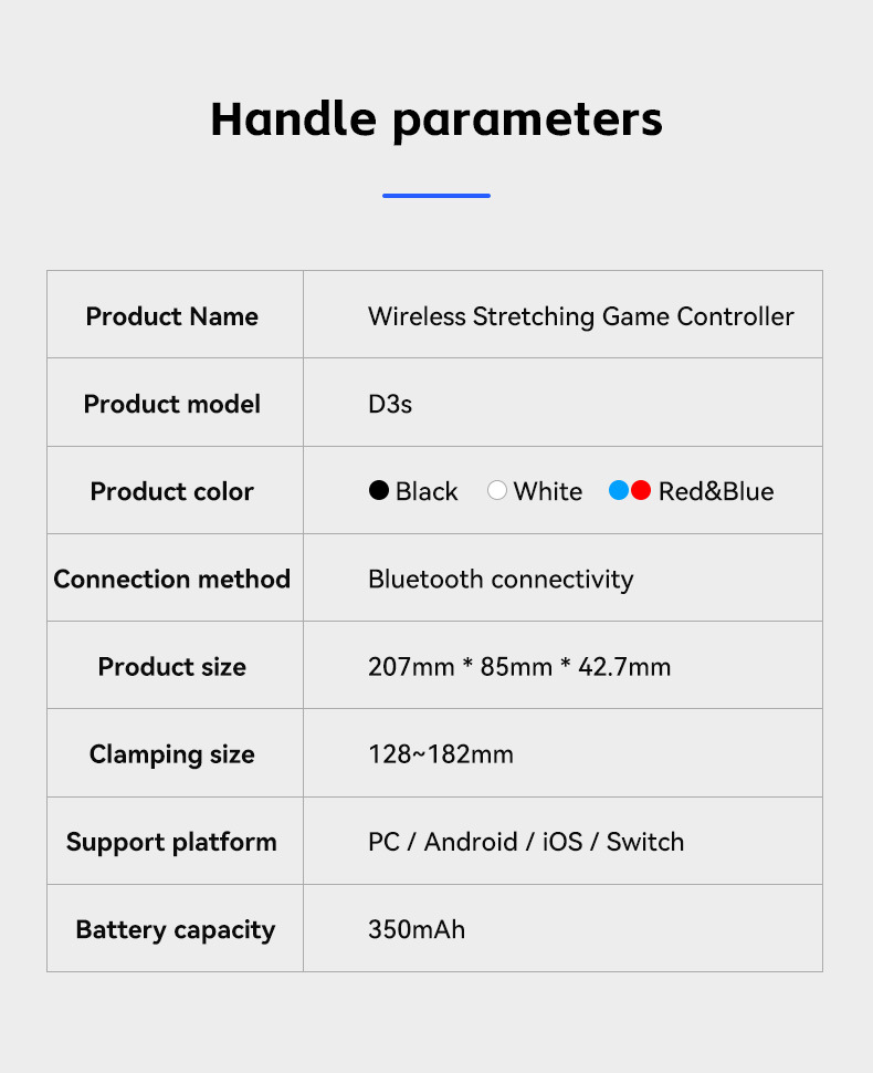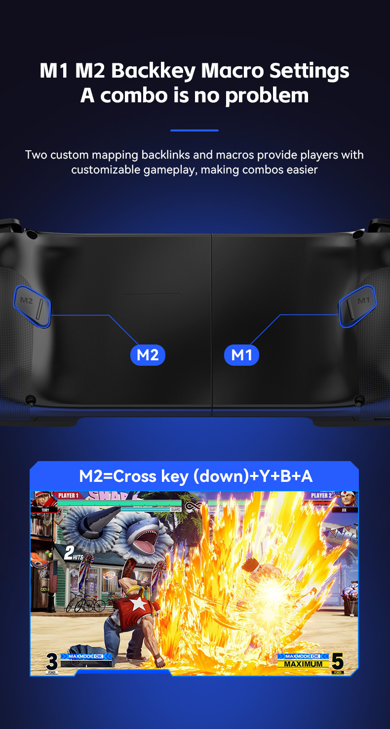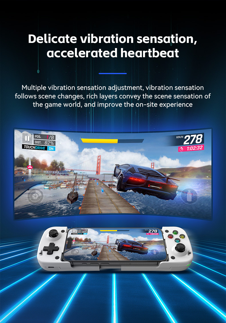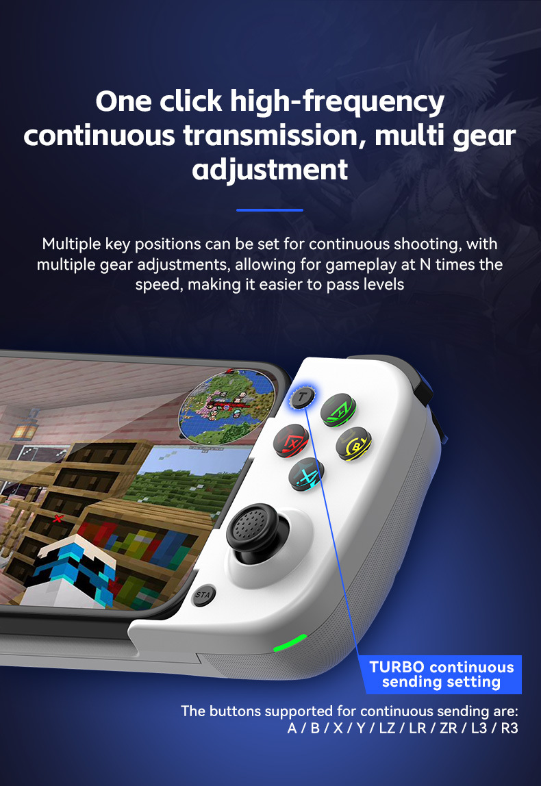 此款与D3区别:模式切换开关,无需要复合按键,不同模式直接切换,连接更简单更直接。带有霍尔摇杆和扳机。内置双震动摇摆马达