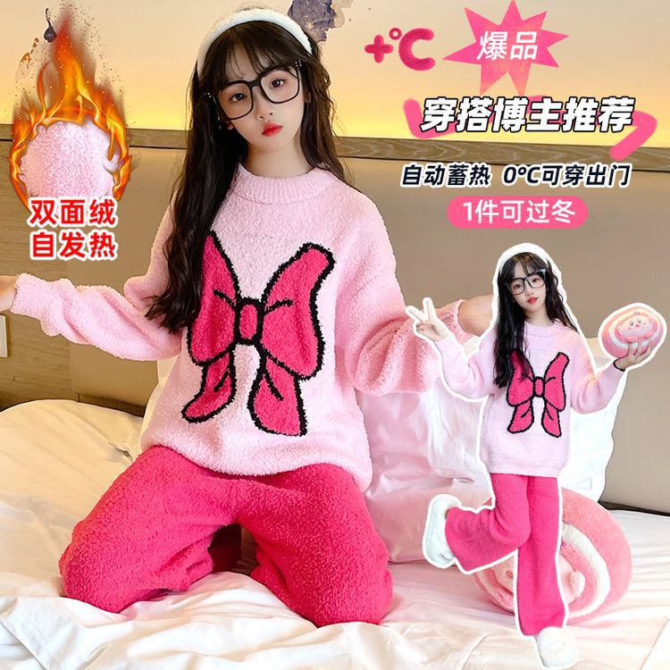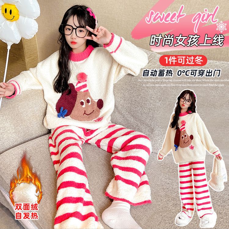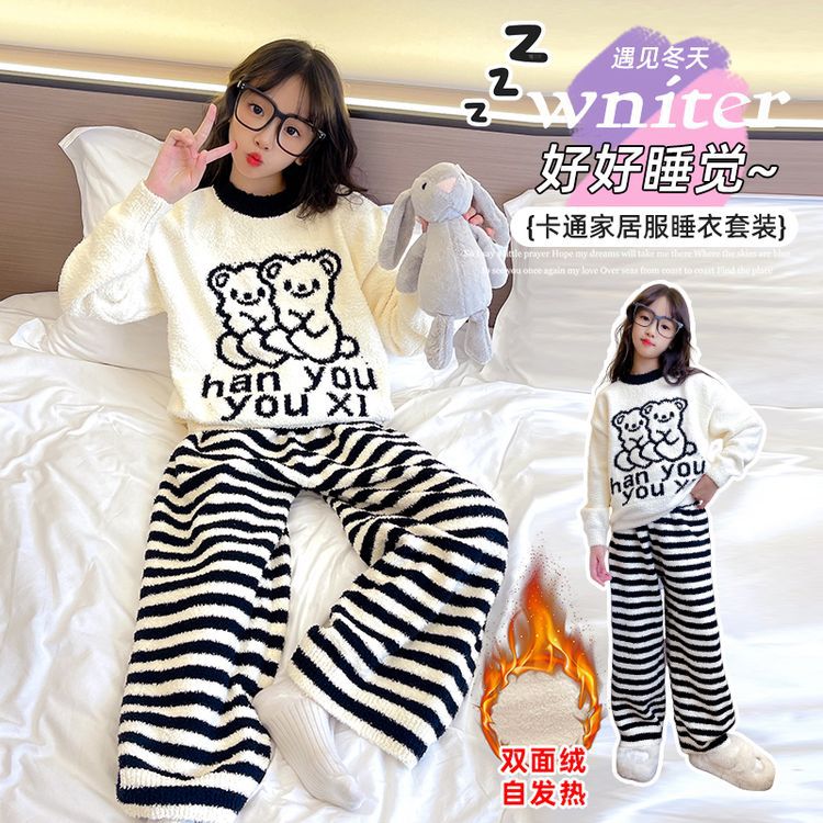 여아 가을 겨울 홈웨어 세트 2024 새로운 한국 스타일 여아 패션 스트라이프 바지 겉옷 잠옷 투피스 세트스토어 가기