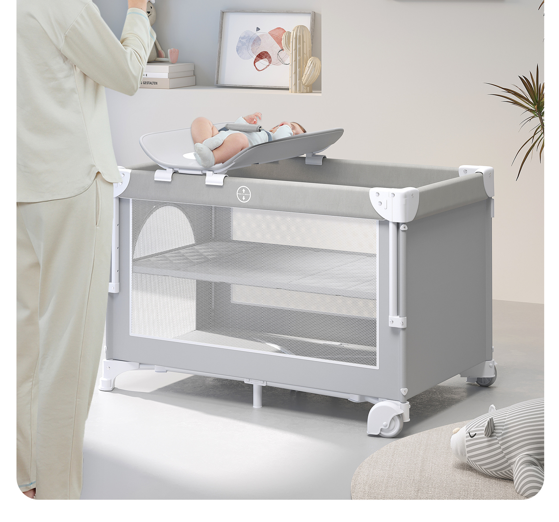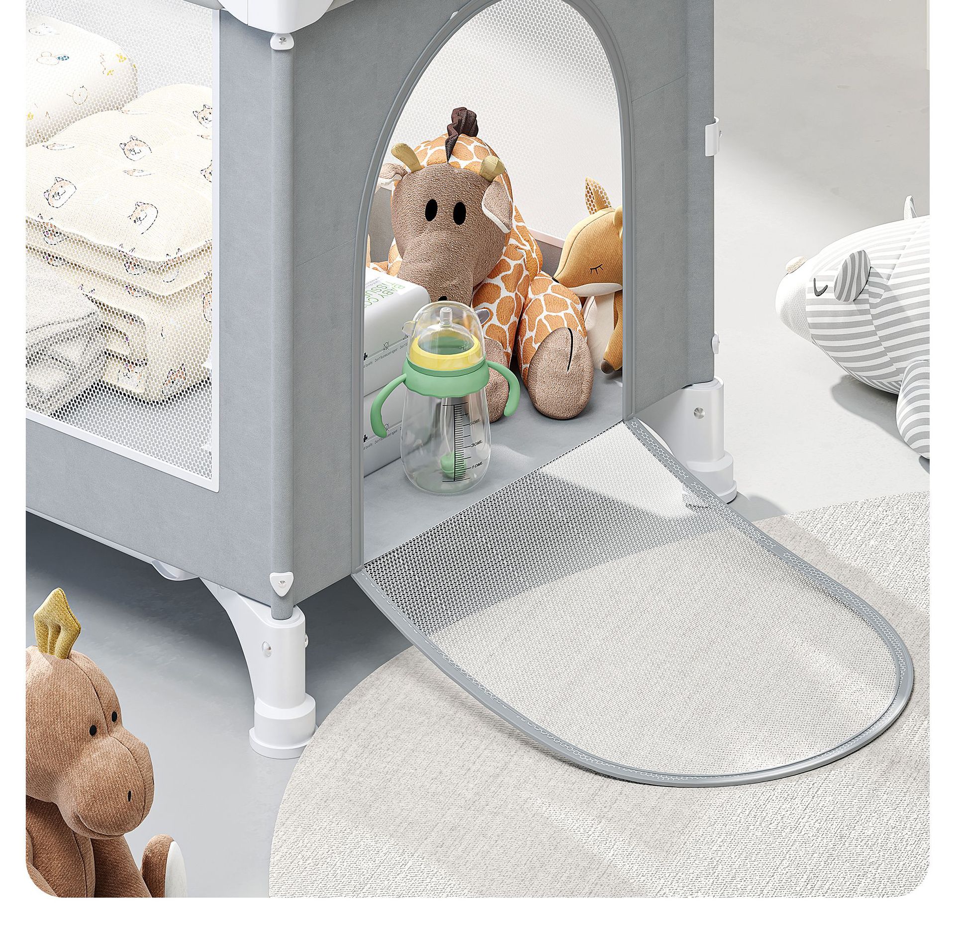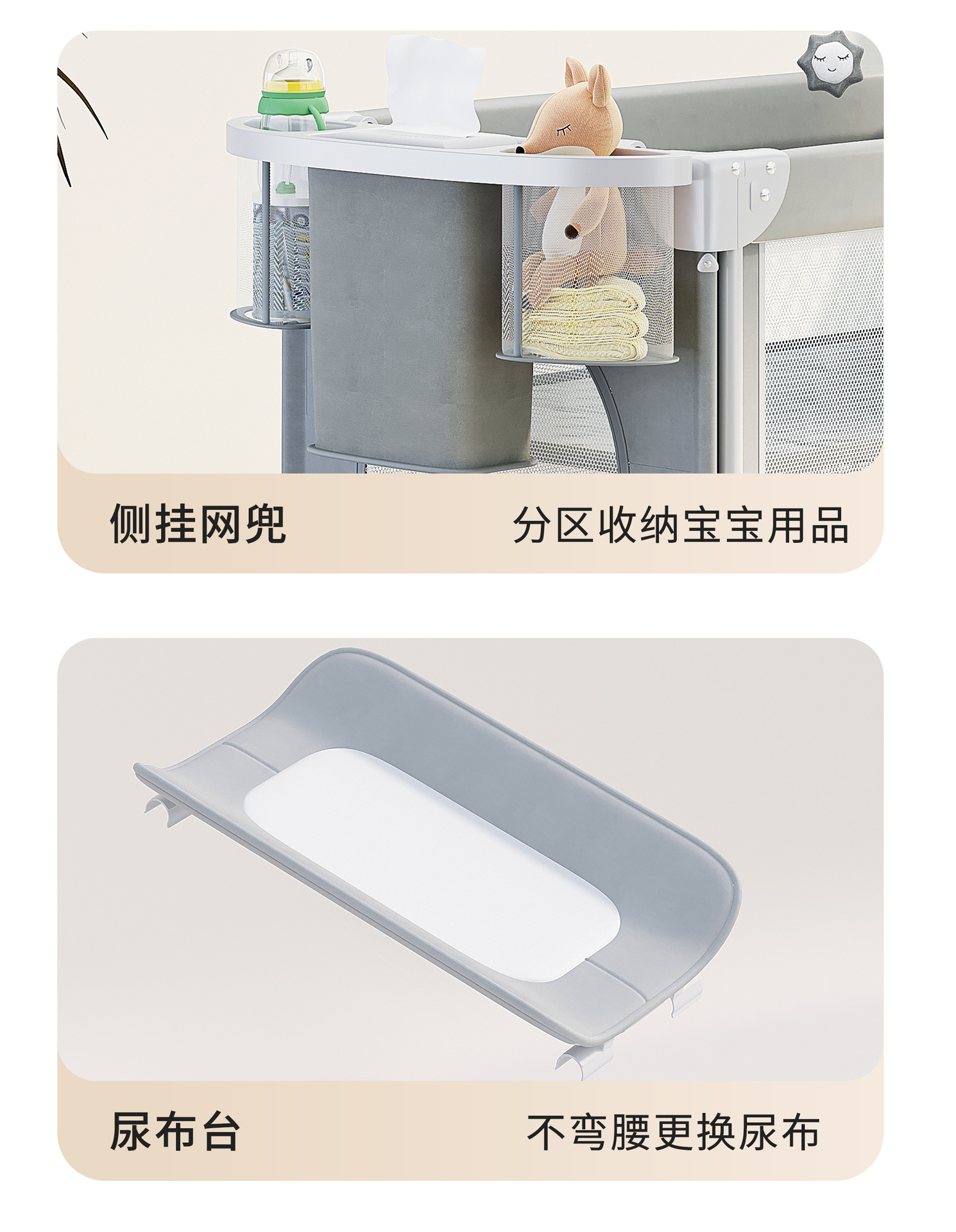 • 라이트 그레이 [이층 게임 스플라이싱 리프트] 침대 + 5종 세트 (모기장 + 수납 블루 + 기저귀 교환대 + 침대 벨 + 로커)