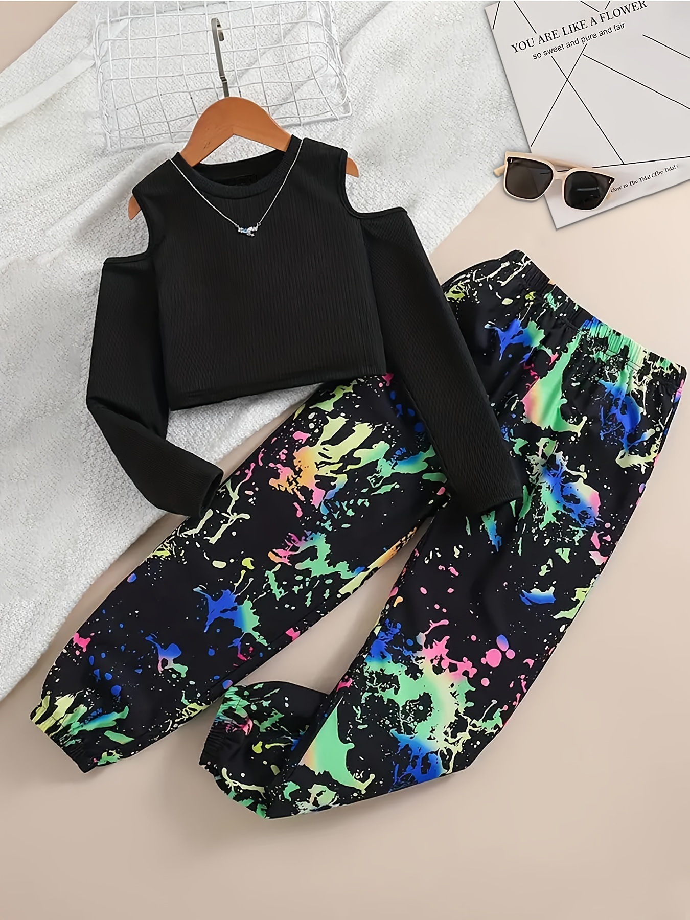 국경 간 대외 무역 INS 소녀 가을 세트 어깨 긴팔 티셔츠 탑 잉크 낙서 인쇄 다리 바지 세트