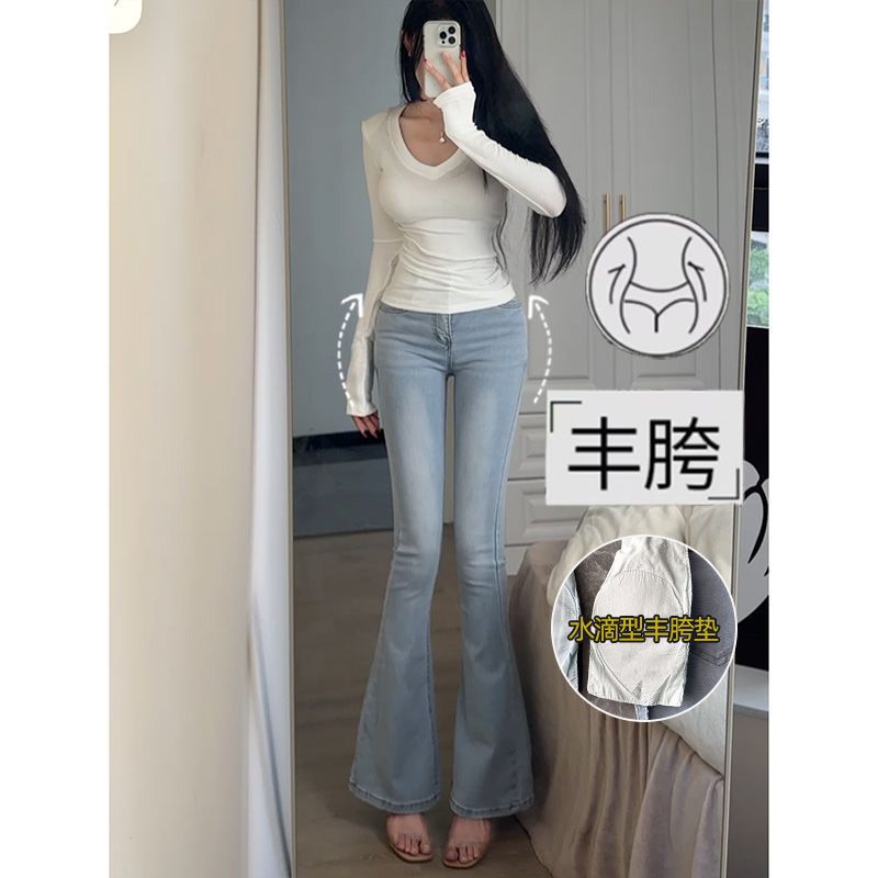 라이트 블루 높은 허리 지방 엉덩이 청바지 여성의 2024 봄과 가을 새로운 슬림 핏 높은 허리 슬리밍 다리 긴 벨 바지스토어 가기
