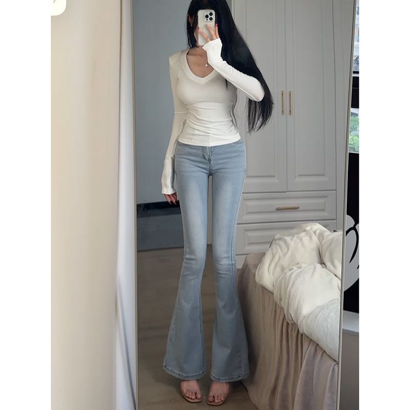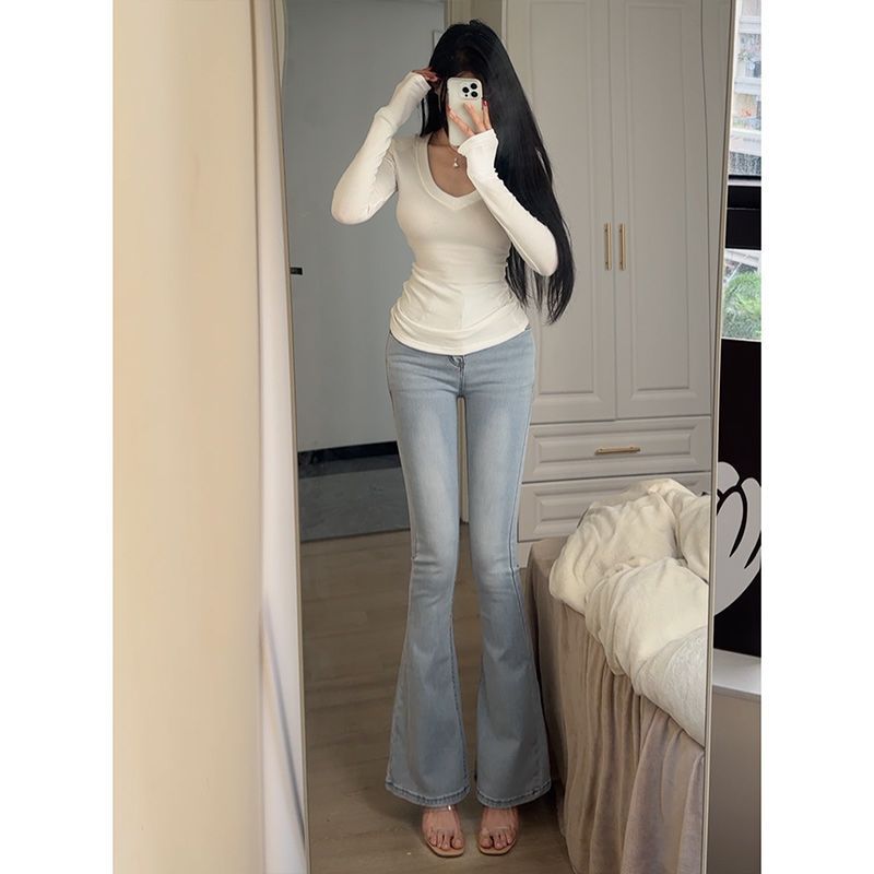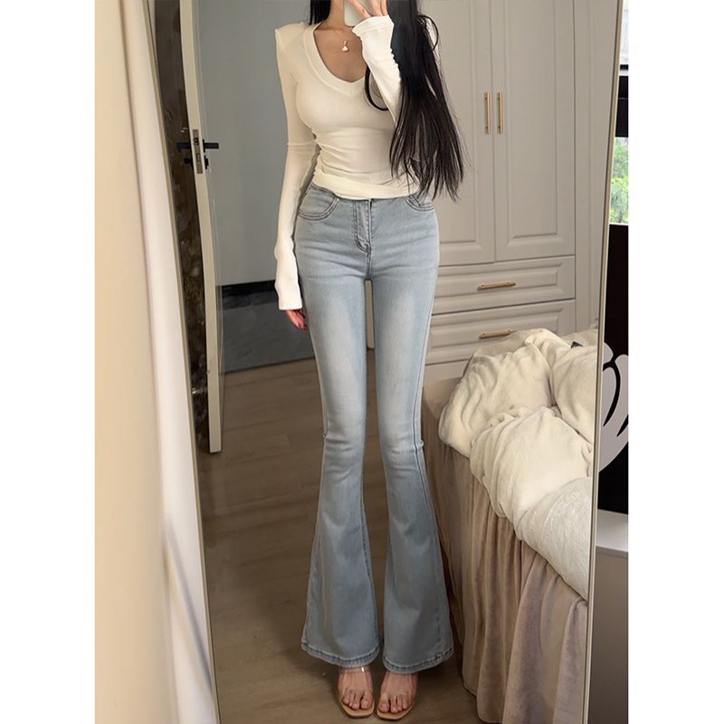 라이트 블루 높은 허리 지방 엉덩이 청바지 여성의 2024 봄과 가을 새로운 슬림 핏 높은 허리 슬리밍 다리 긴 벨 바지