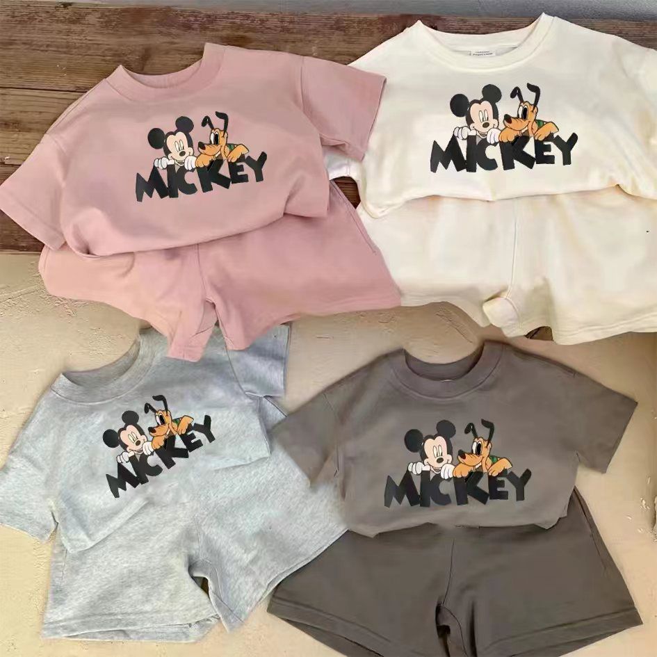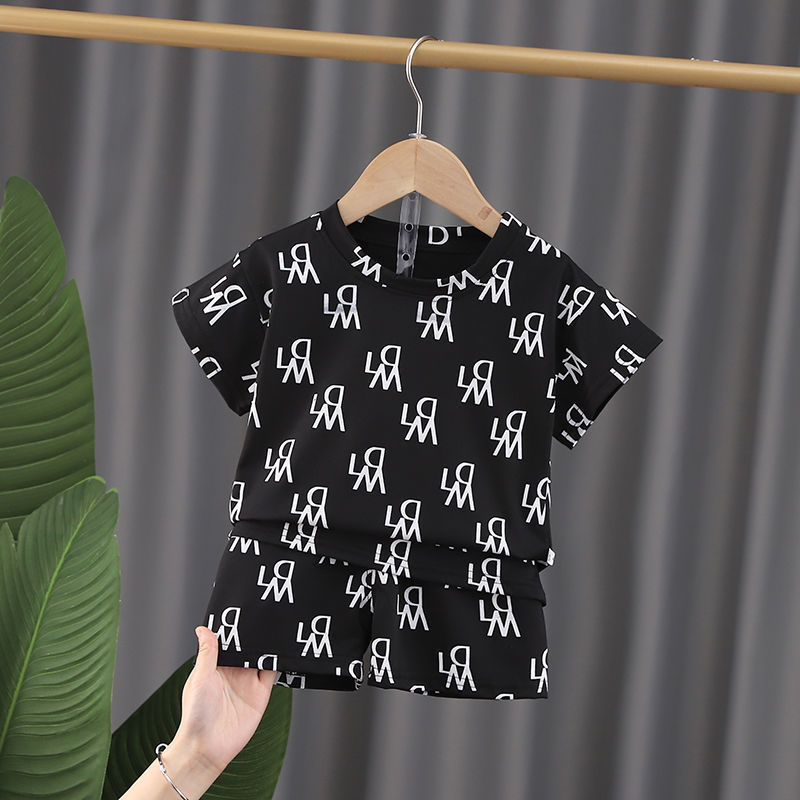 여름 새로운 어린이 서양식 소년 소녀 패션 투피스 세트 중소 어린이 반팔 반바지 둥근 목 세트 트렌디