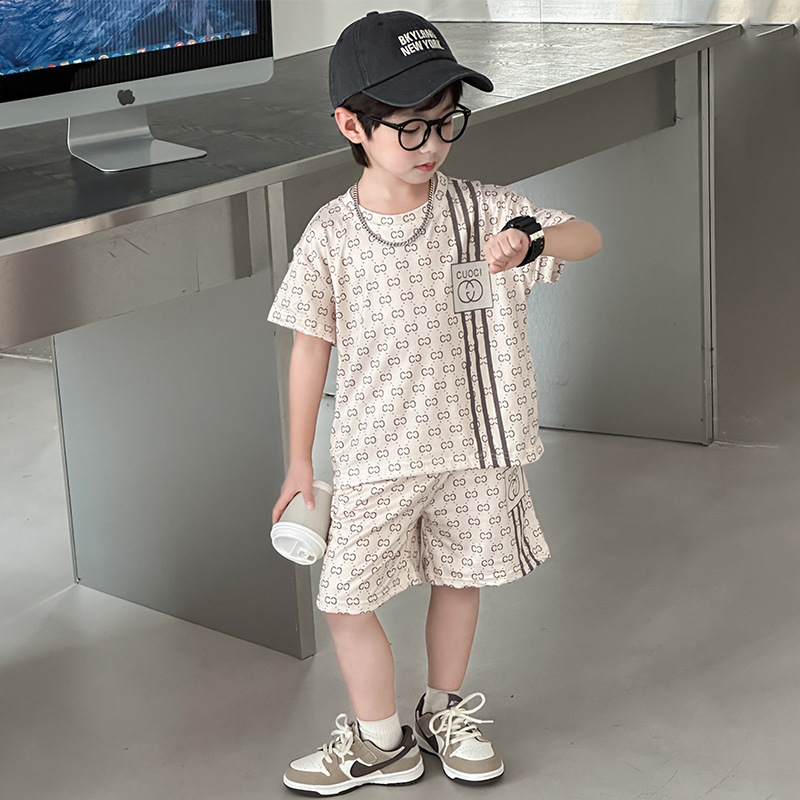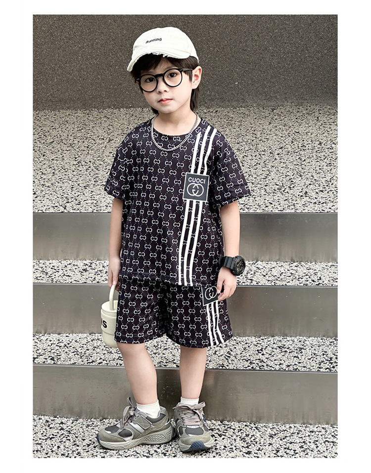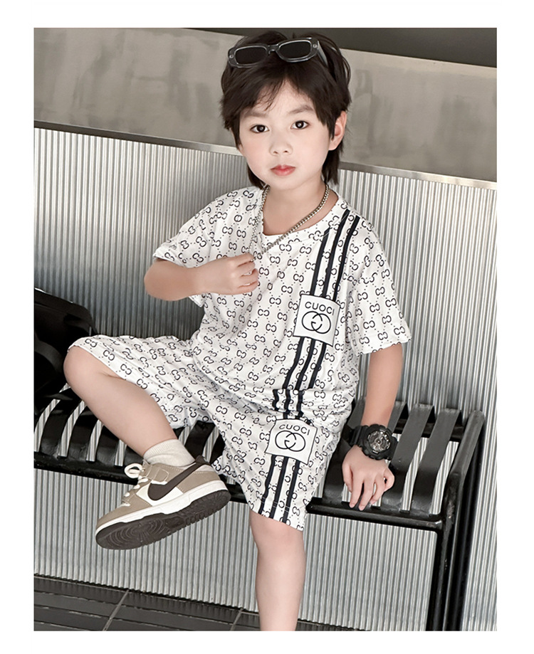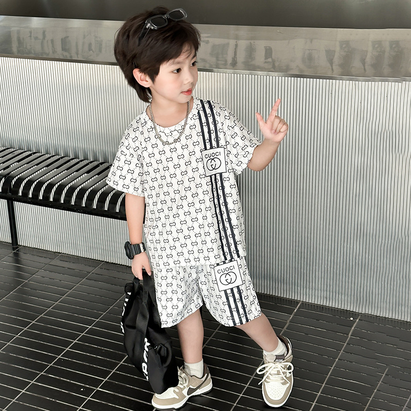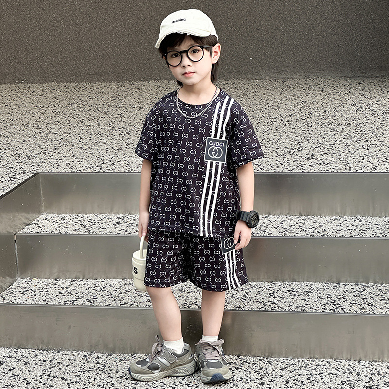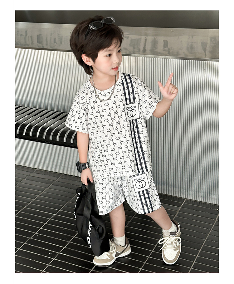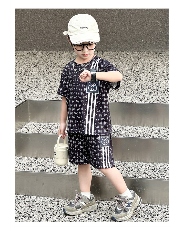 여름 새로운 어린이 서양식 소년 소녀 패션 투피스 세트 중소 어린이 반팔 반바지 둥근 목 세트 트렌디스토어 가기