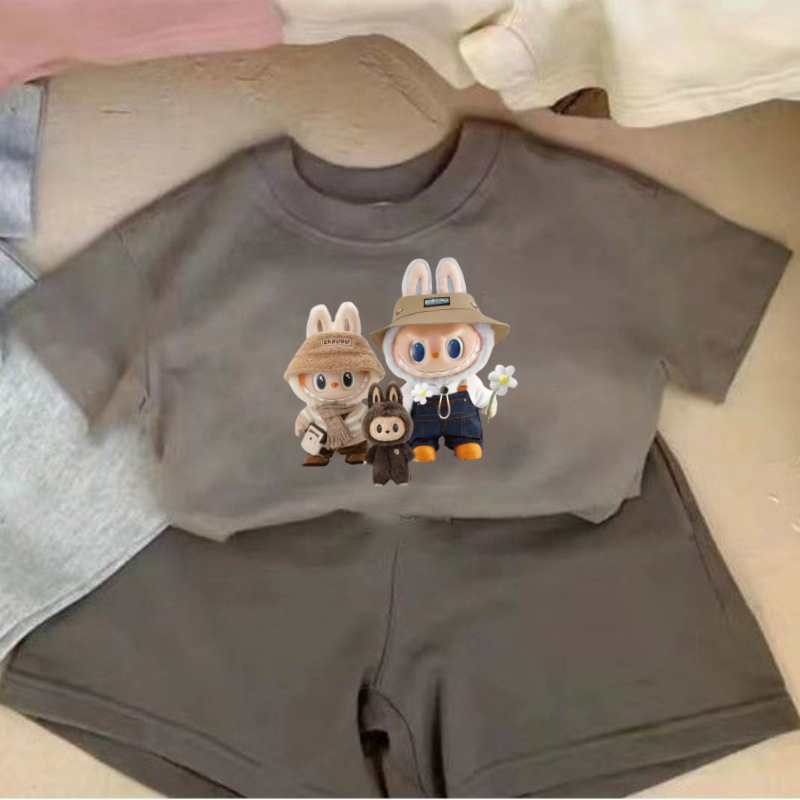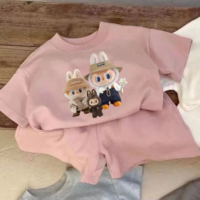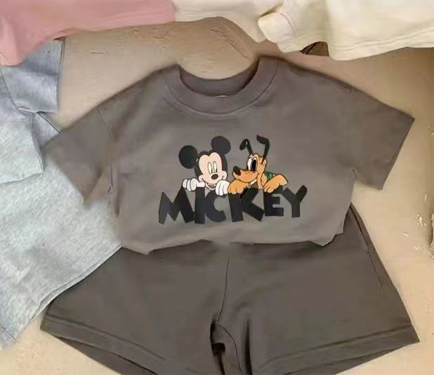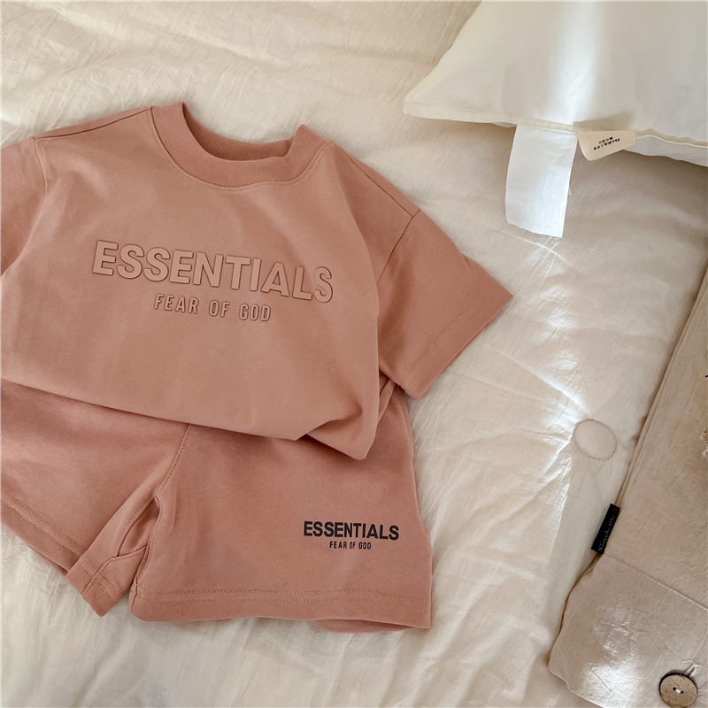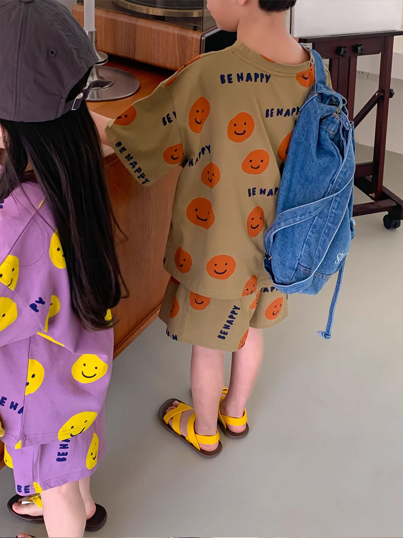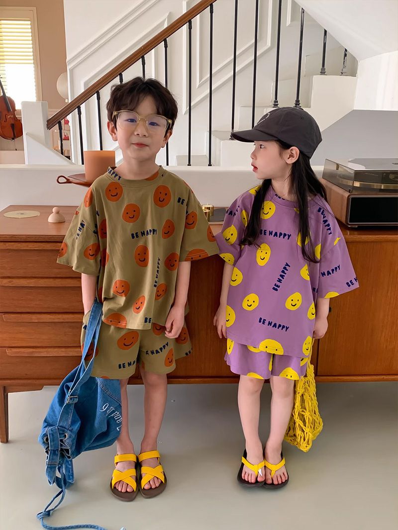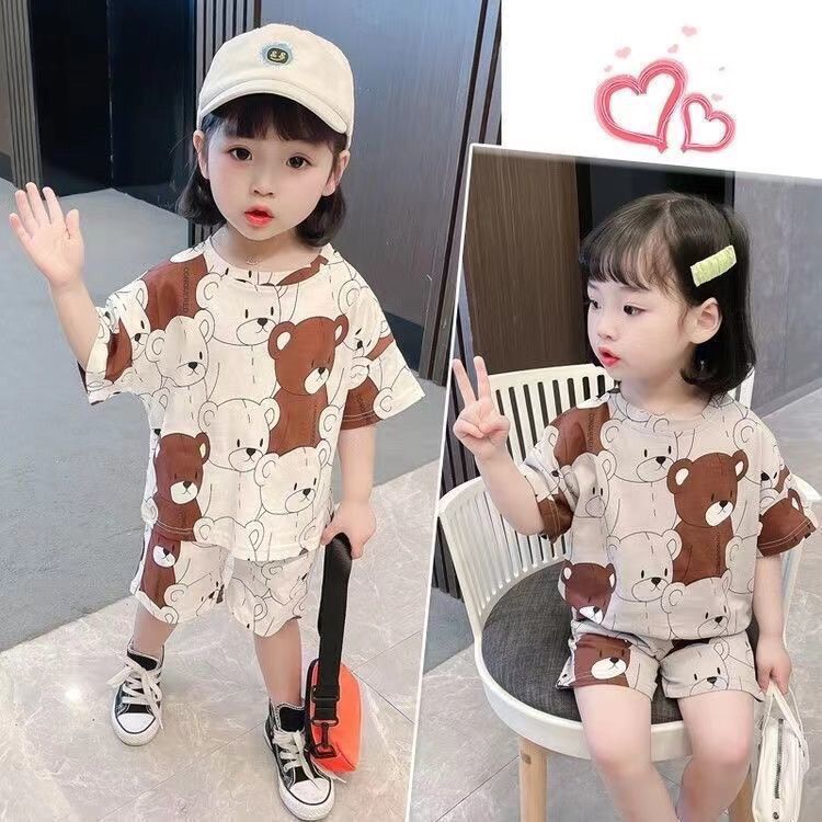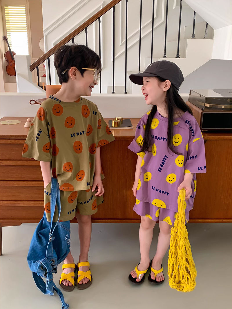여름 새로운 어린이 서양식 소년 소녀 패션 투피스 세트 중소 어린이 반팔 반바지 둥근 목 세트 트렌디스토어 가기
