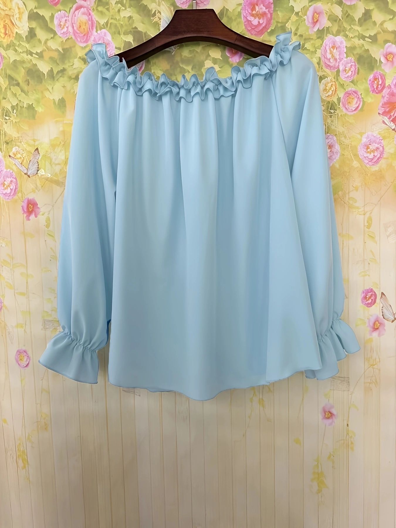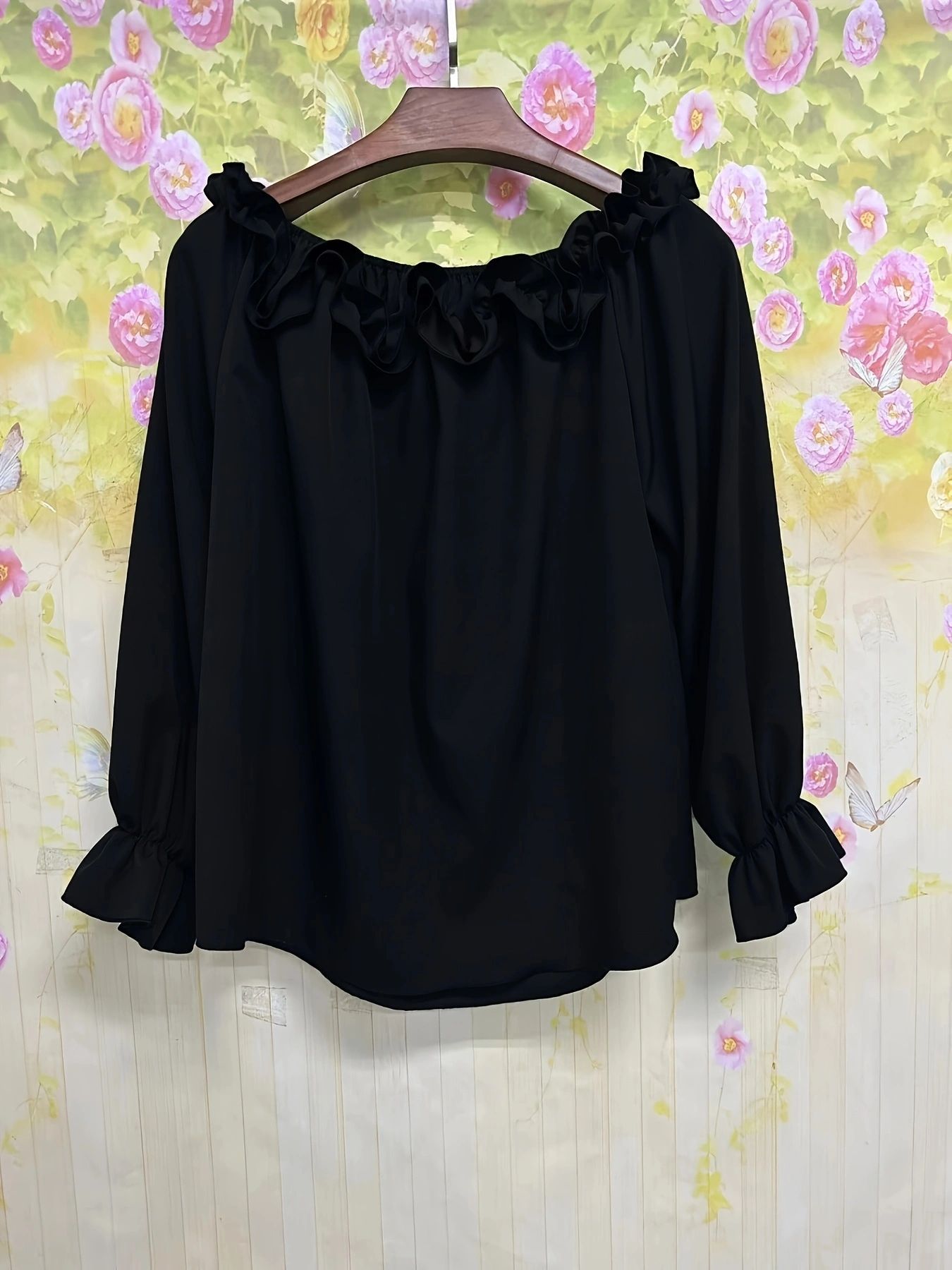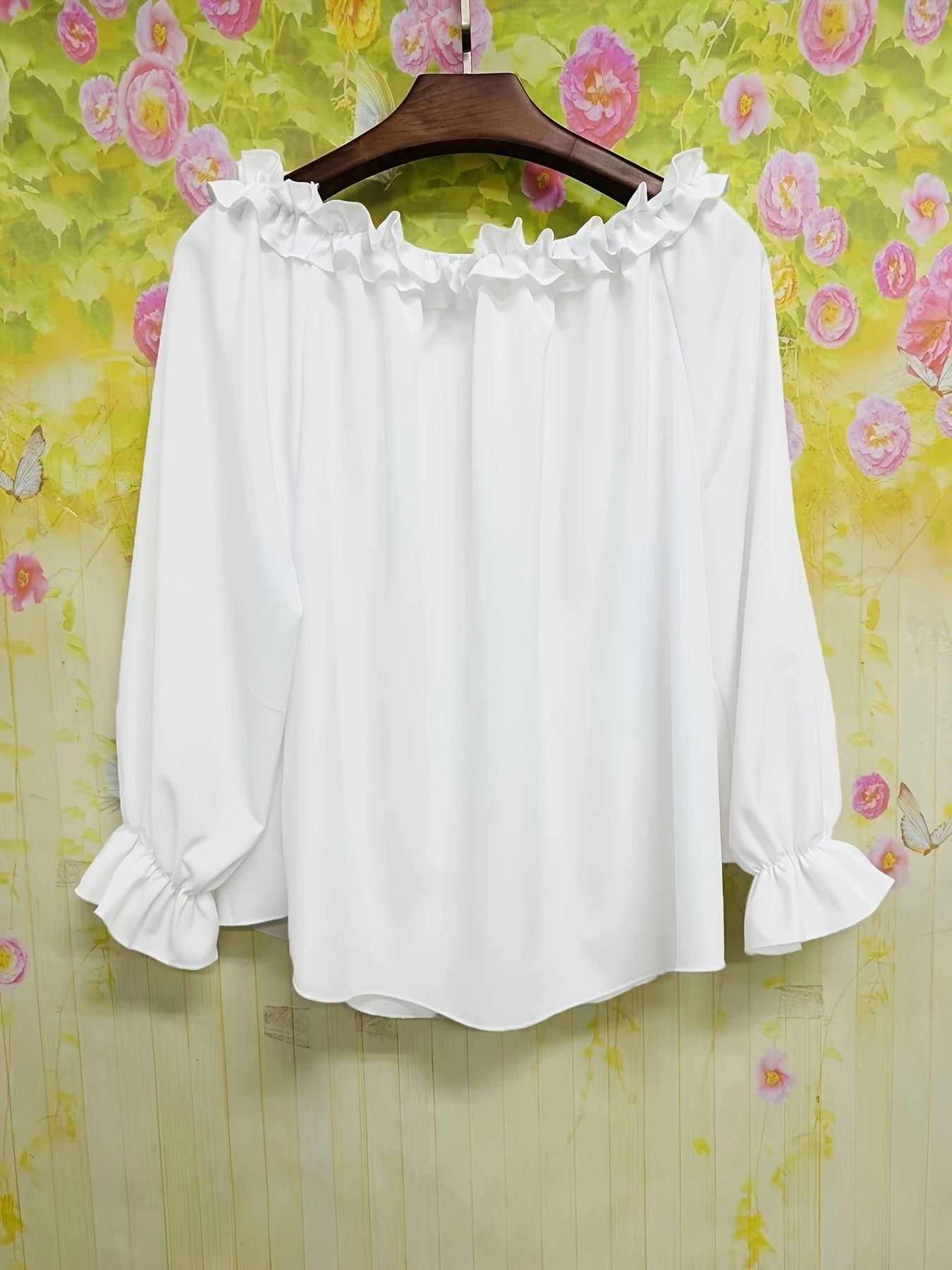 인기 신상품 우아한 스타일 캐주얼 원숄더 오픈숄더 긴팔 탑 러플 소매 셔츠 루즈핏 여성 의류스토어 가기