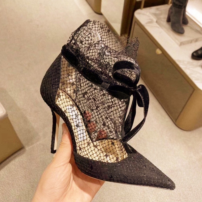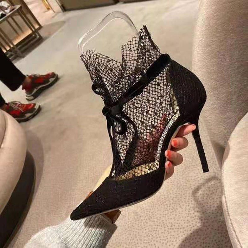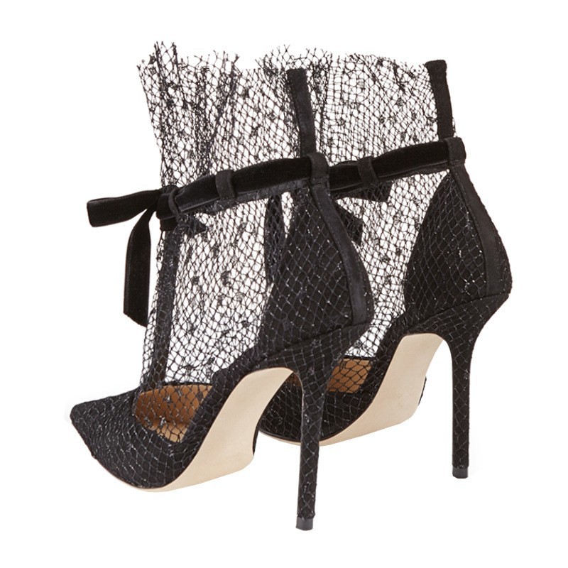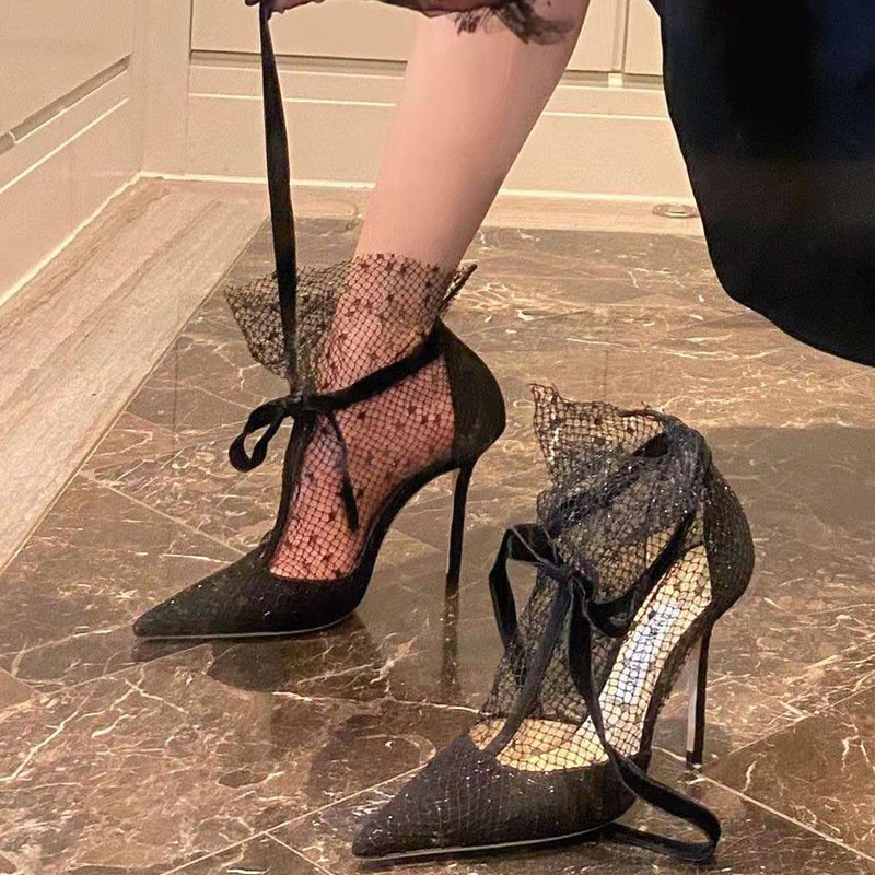 여름 로마 스트랩 섹시 블랙 스틸레토 하이힐 2025 신상 리본 샌들 레이스 포인티드 토 슈즈