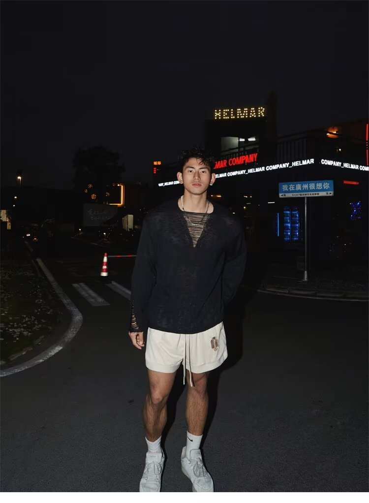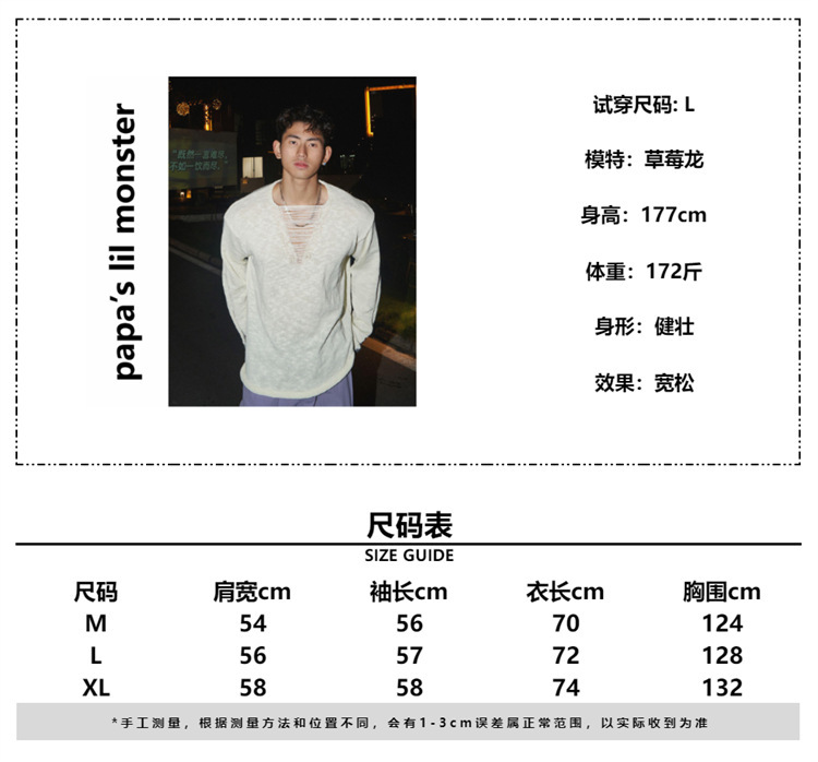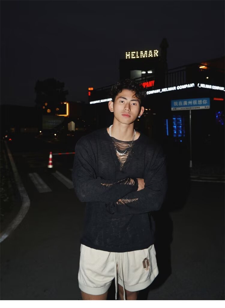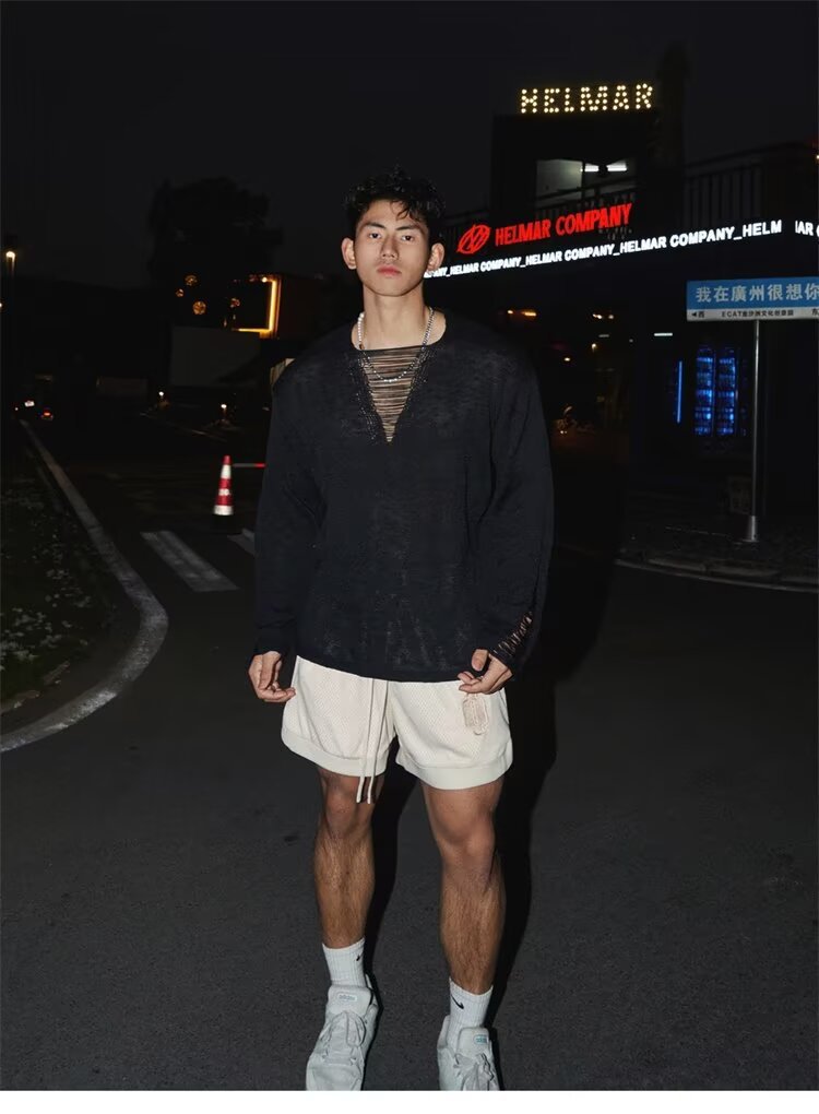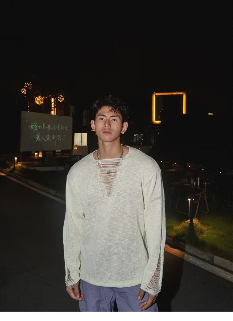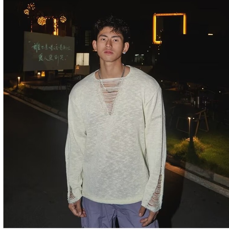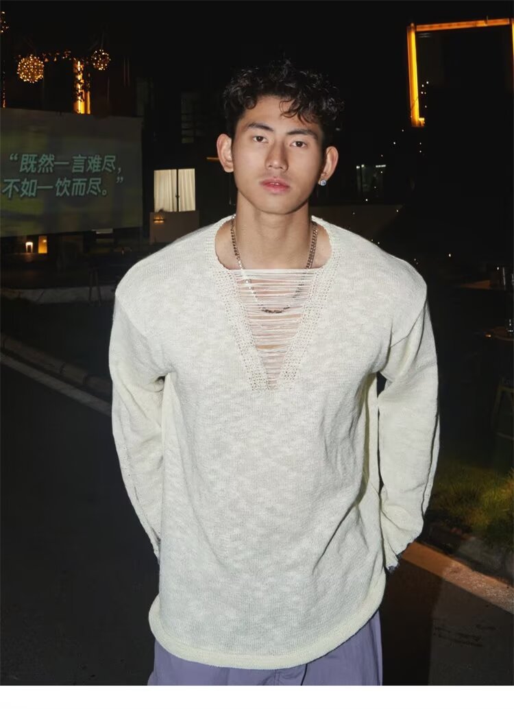 봄과 가을 긴장 중공 니트웨어 남자의 딥 V 게으른 스타일 풀오버 스웨터 남자의 얇은 파괴 디자인 탑스토어 가기
