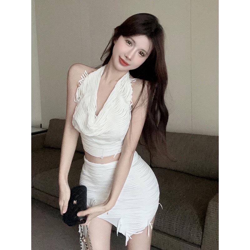 유럽과 미국 여성의 AliExpress 국경 새로운 핫 소녀 스타일 단색 목 조끼 섹시한 불규칙한 치마 세트