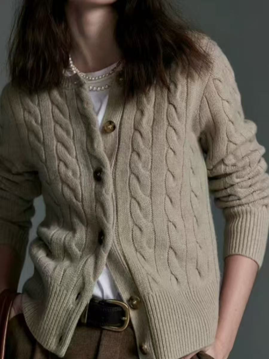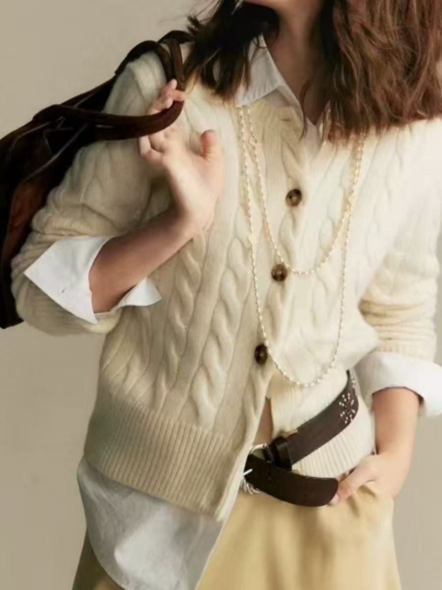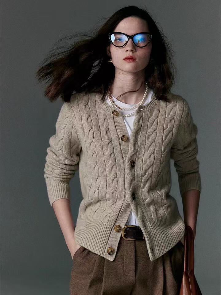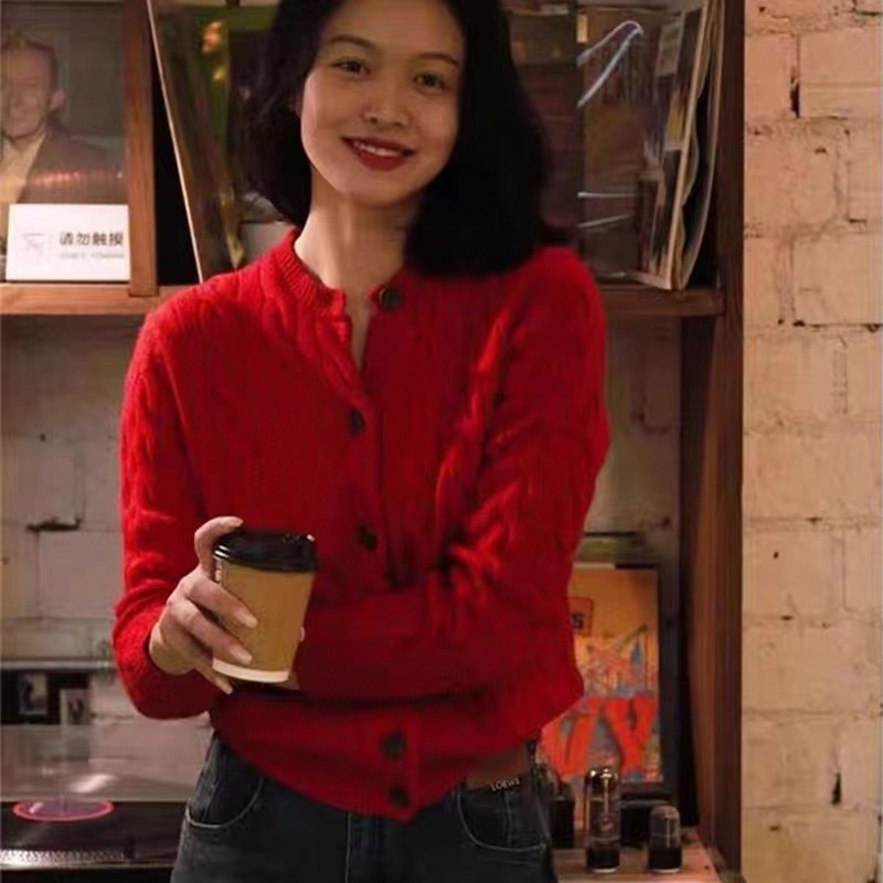 이지아! 올드 Qian Feng 가을과 겨울 새로운 트위스트 퓨어 울 카디건 여성 라운드 넥 두꺼운 빈티지 스웨터 자수 재킷