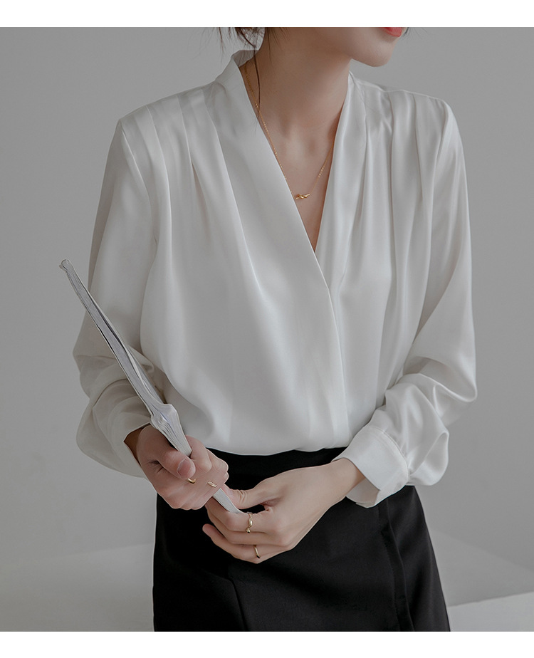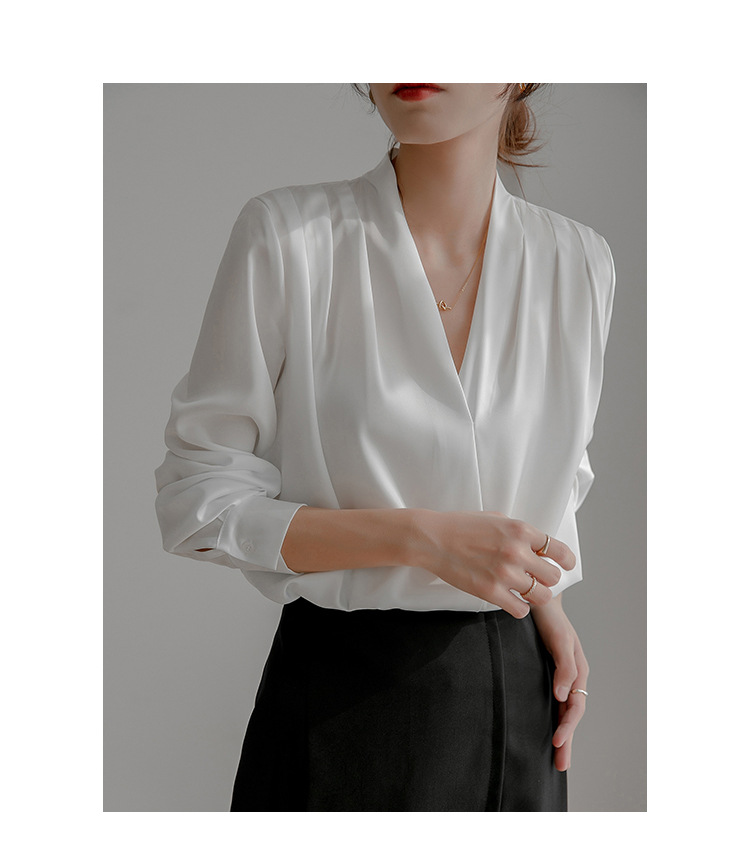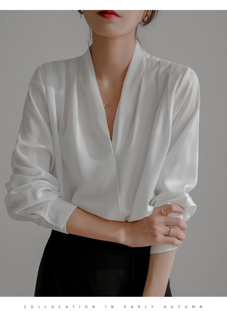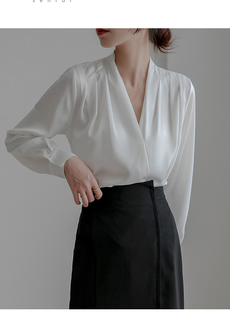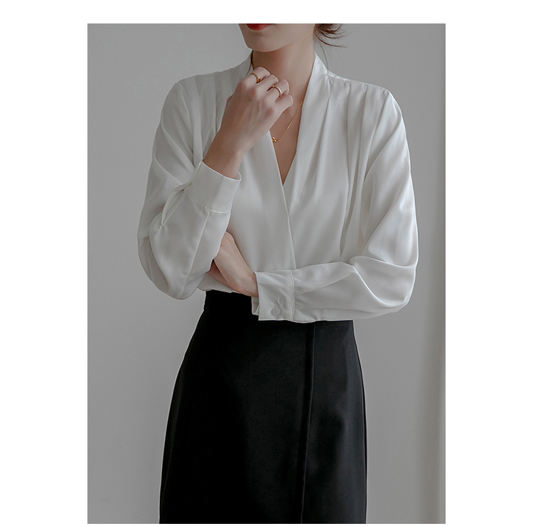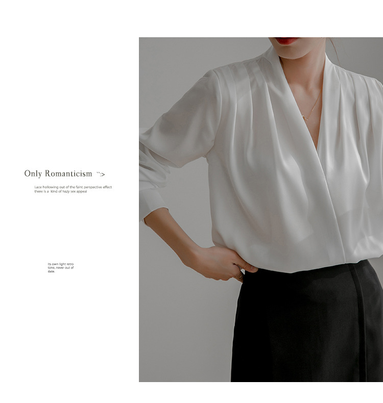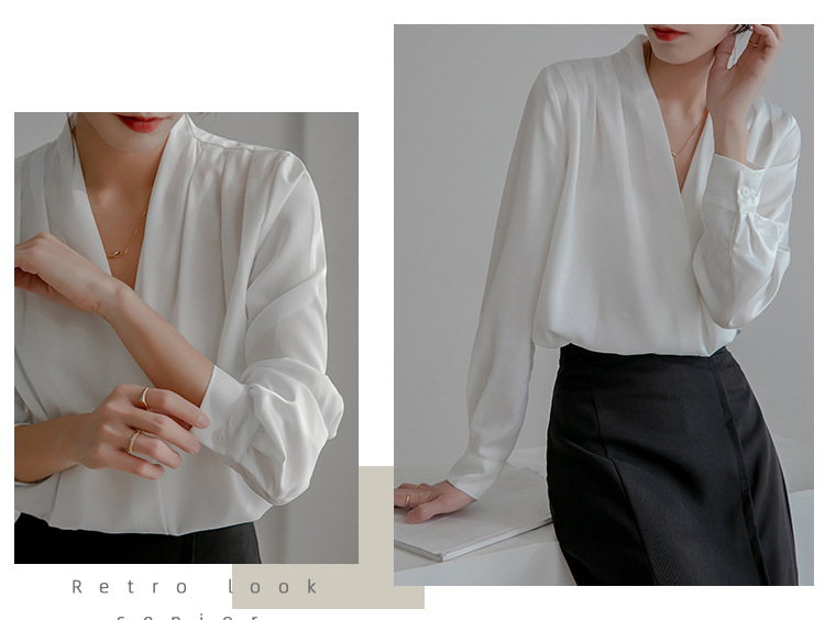 봄, 가을용 여성용 V넥 화이트 셔츠, 긴팔, 프렌치 디자인, 유니크한 레트로 스타일 상의, 프로페셔널 새틴 탑스토어 가기