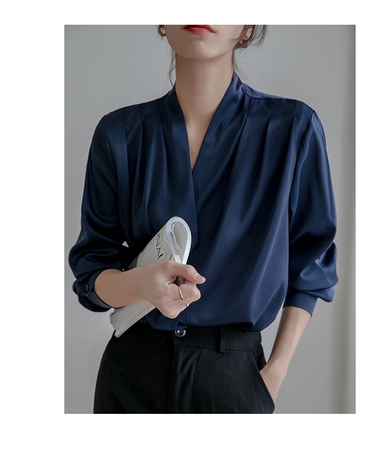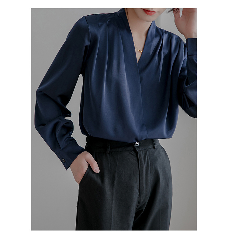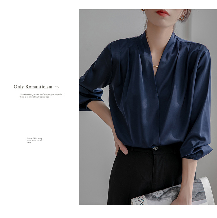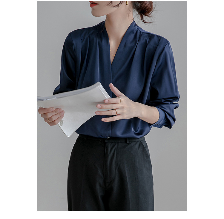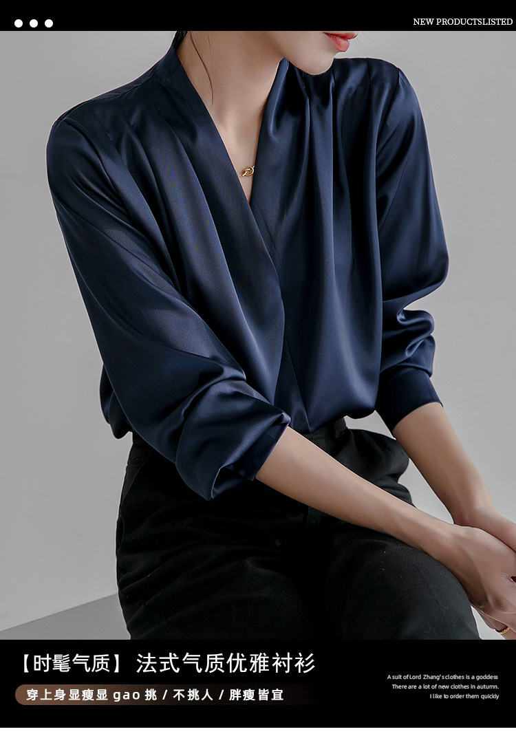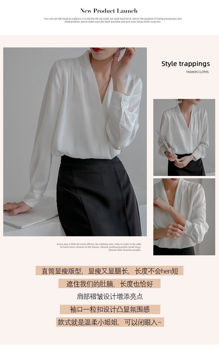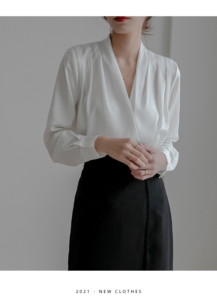 봄, 가을용 여성용 V넥 화이트 셔츠, 긴팔, 프렌치 디자인, 유니크한 레트로 스타일 상의, 프로페셔널 새틴 탑스토어 가기