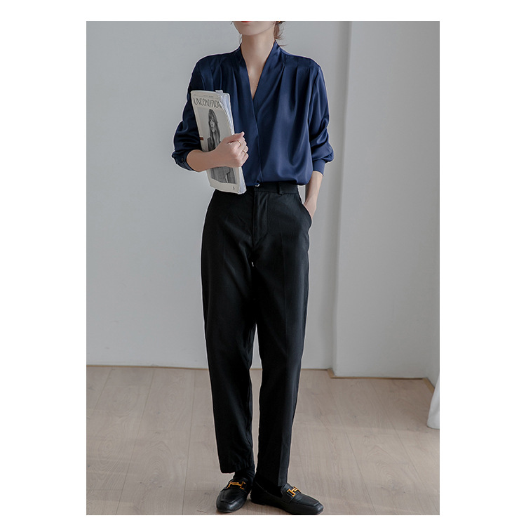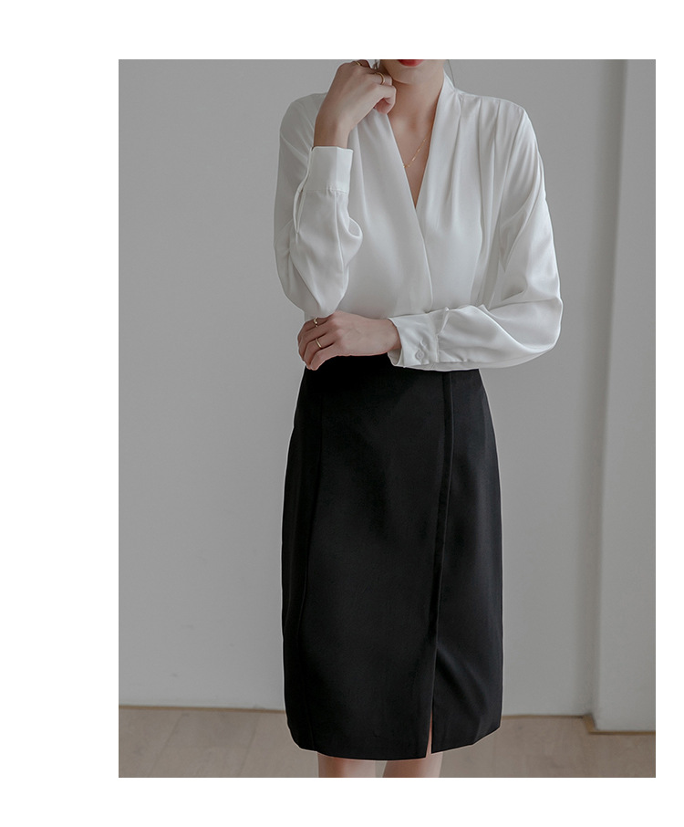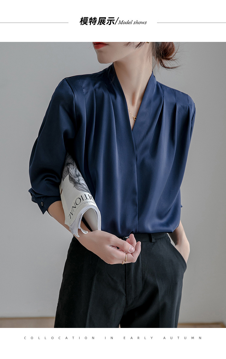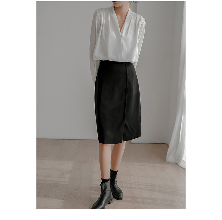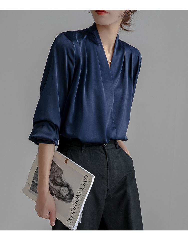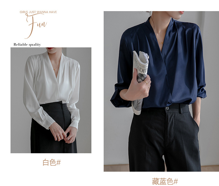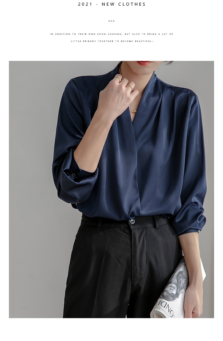 봄, 가을용 여성용 V넥 화이트 셔츠, 긴팔, 프렌치 디자인, 유니크한 레트로 스타일 상의, 프로페셔널 새틴 탑스토어 가기
