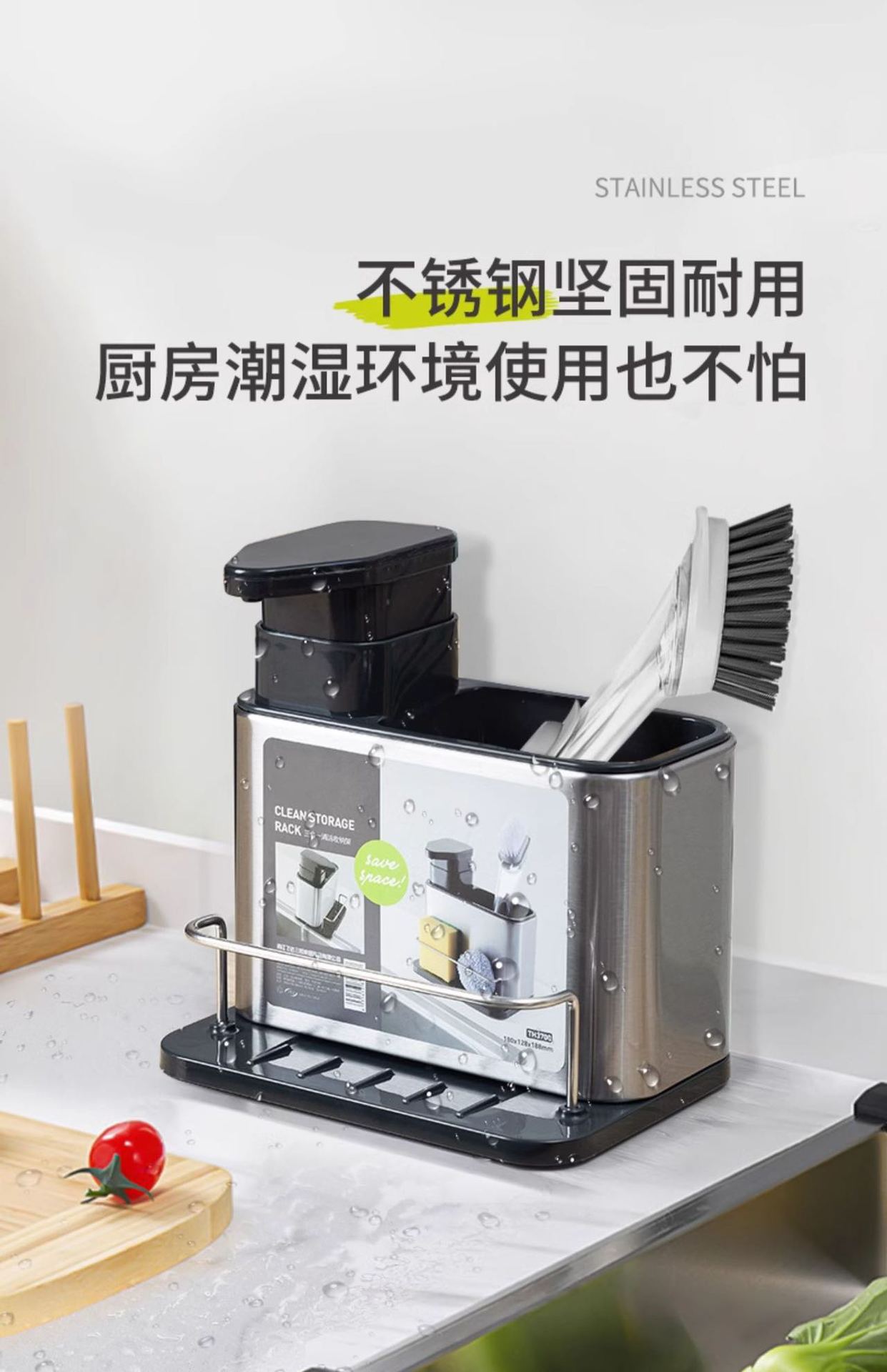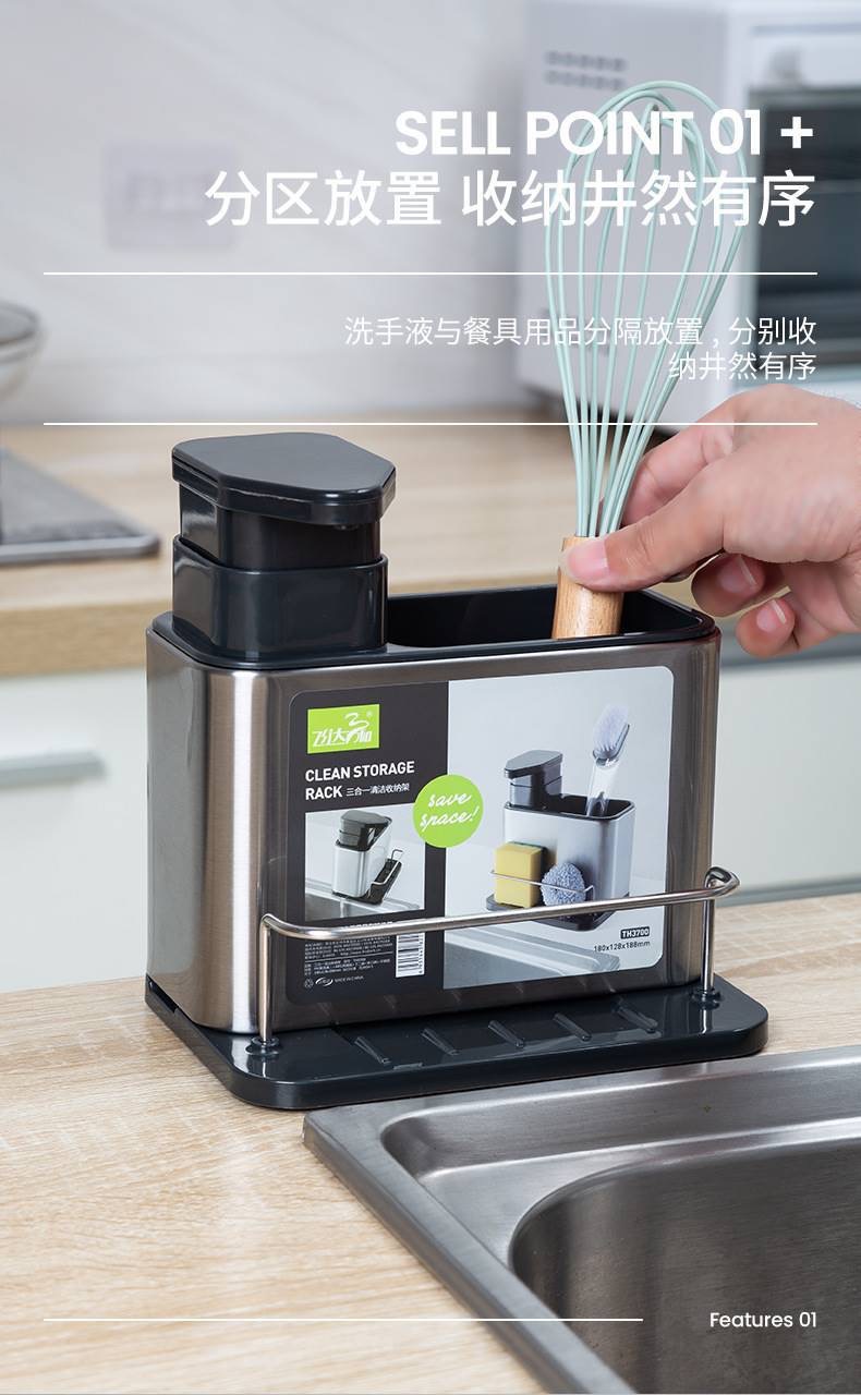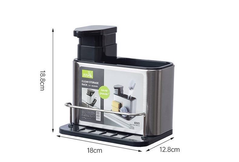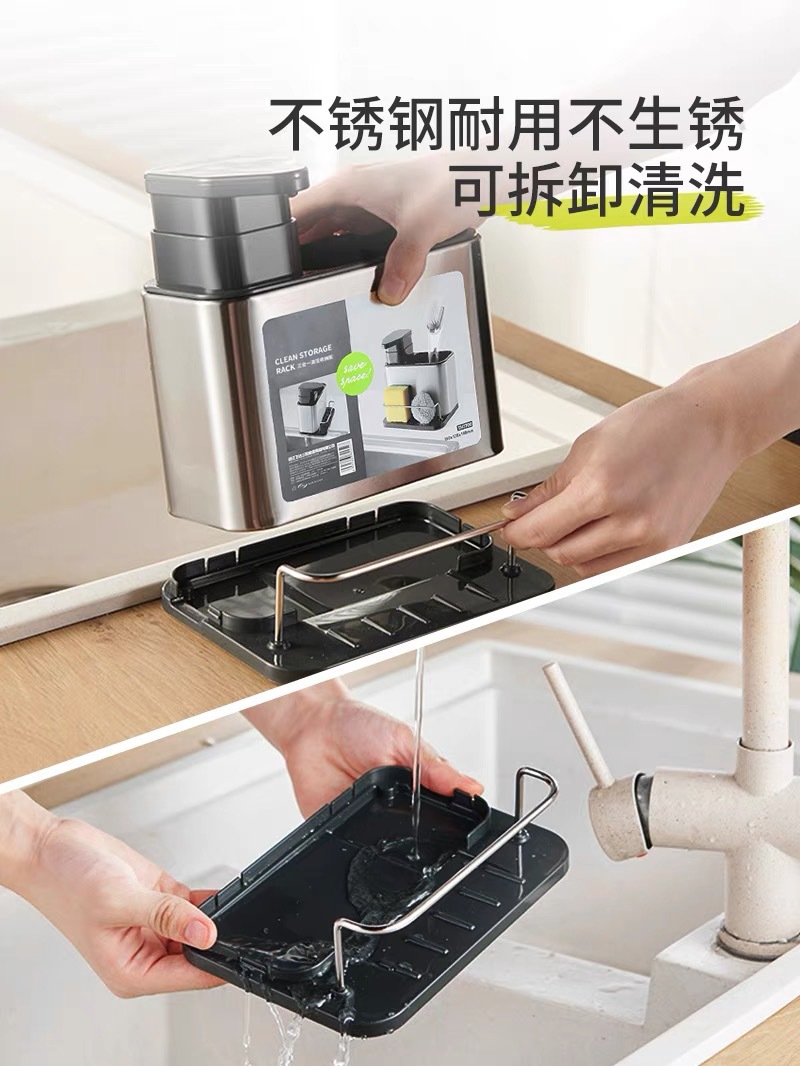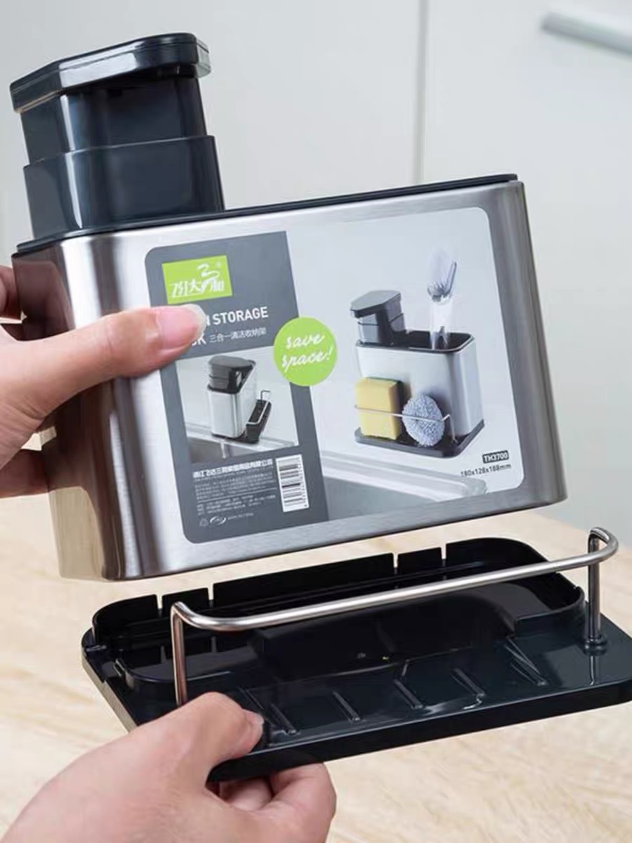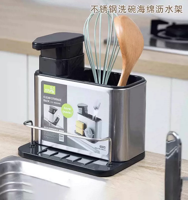 주방 수납 선반 3-in-1 스테인리스 설거지 스펀지 물빠짐대, 스틸 수세미, 주방세제 용기 보관함