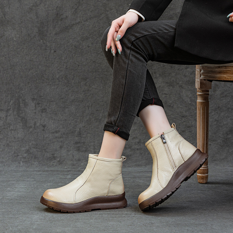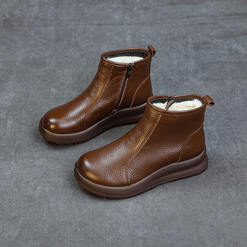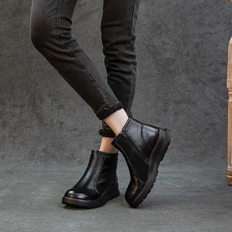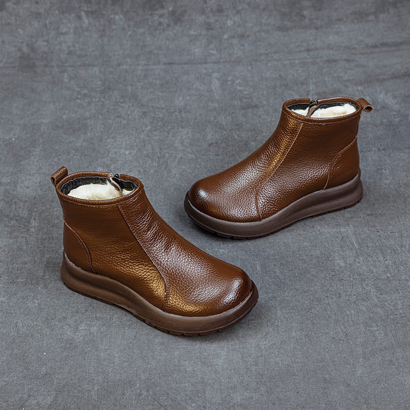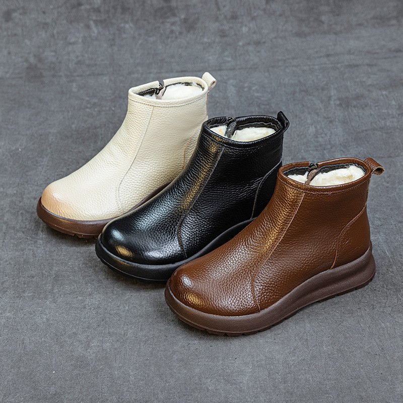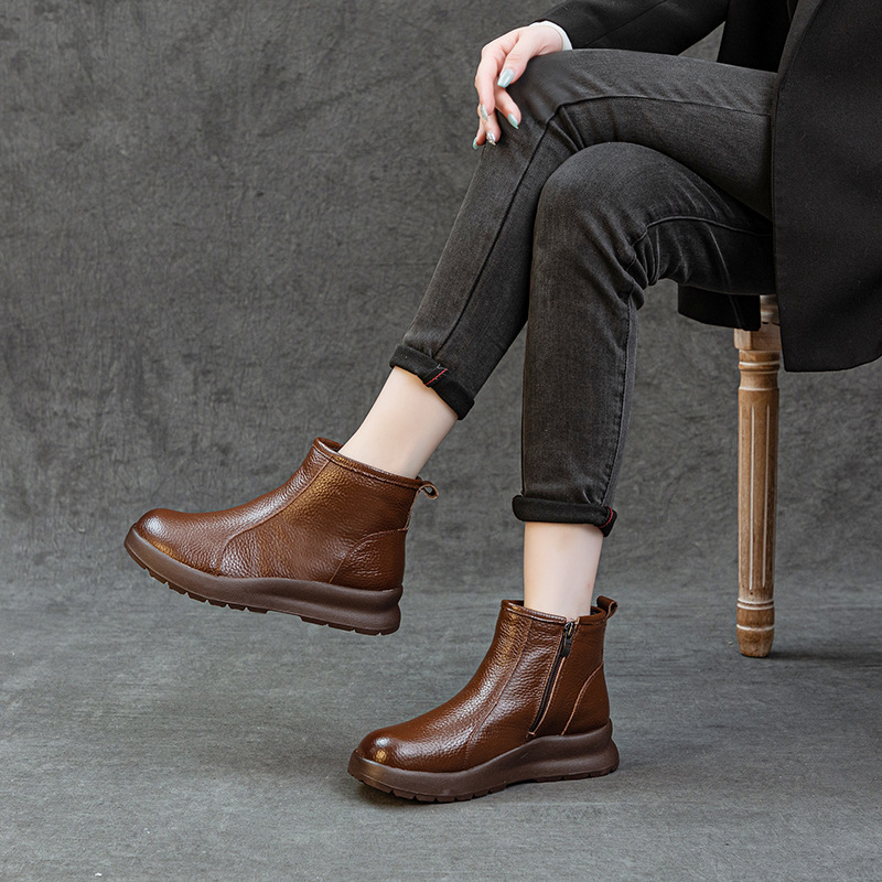 빈티지 1 층 소 가죽 가을과 겨울 새로운 로우 힐 마틴 부츠 여성 양모 두꺼운 따뜻한 부츠 라운드 헤드 짧은 부츠