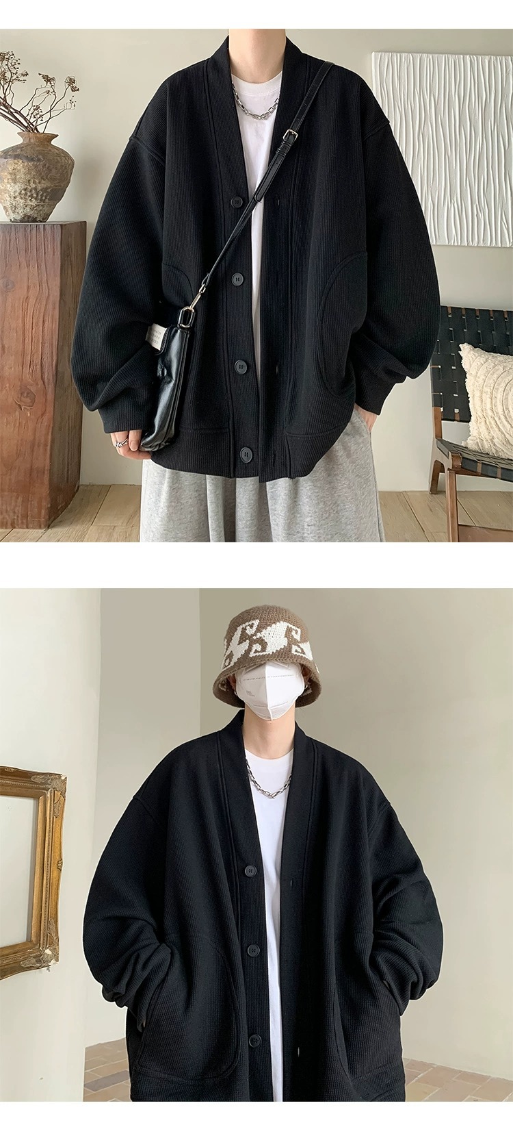 일본식 레이드 백 재킷 남자 하이 엔드 와플 V 넥 루즈 카디건 커플 스웨터 봄과 가을 재킷 기모